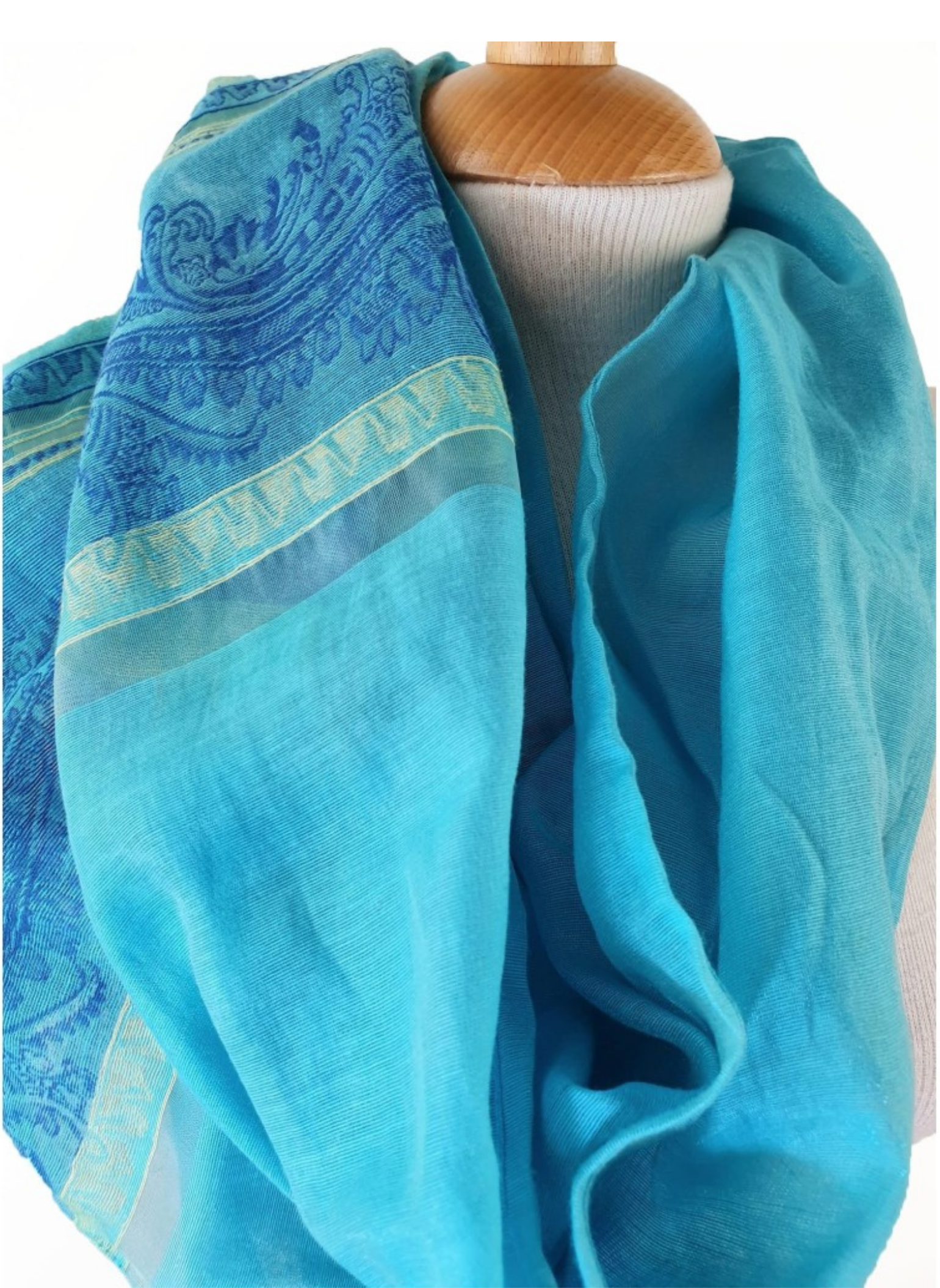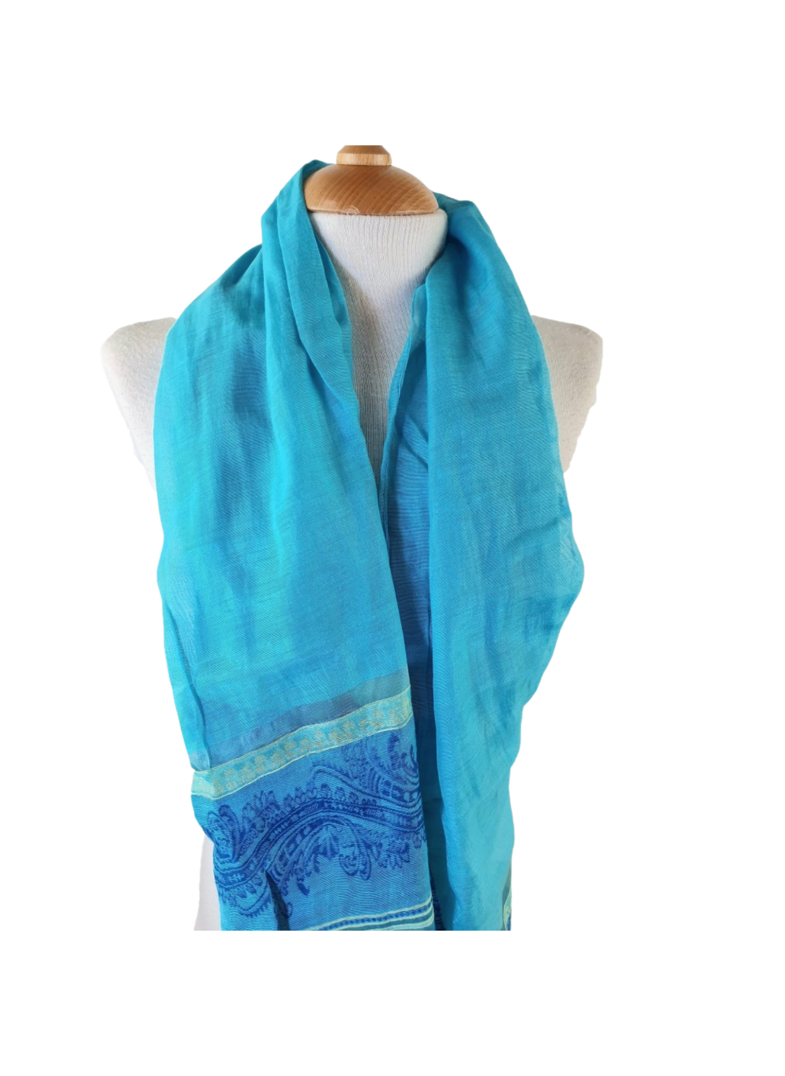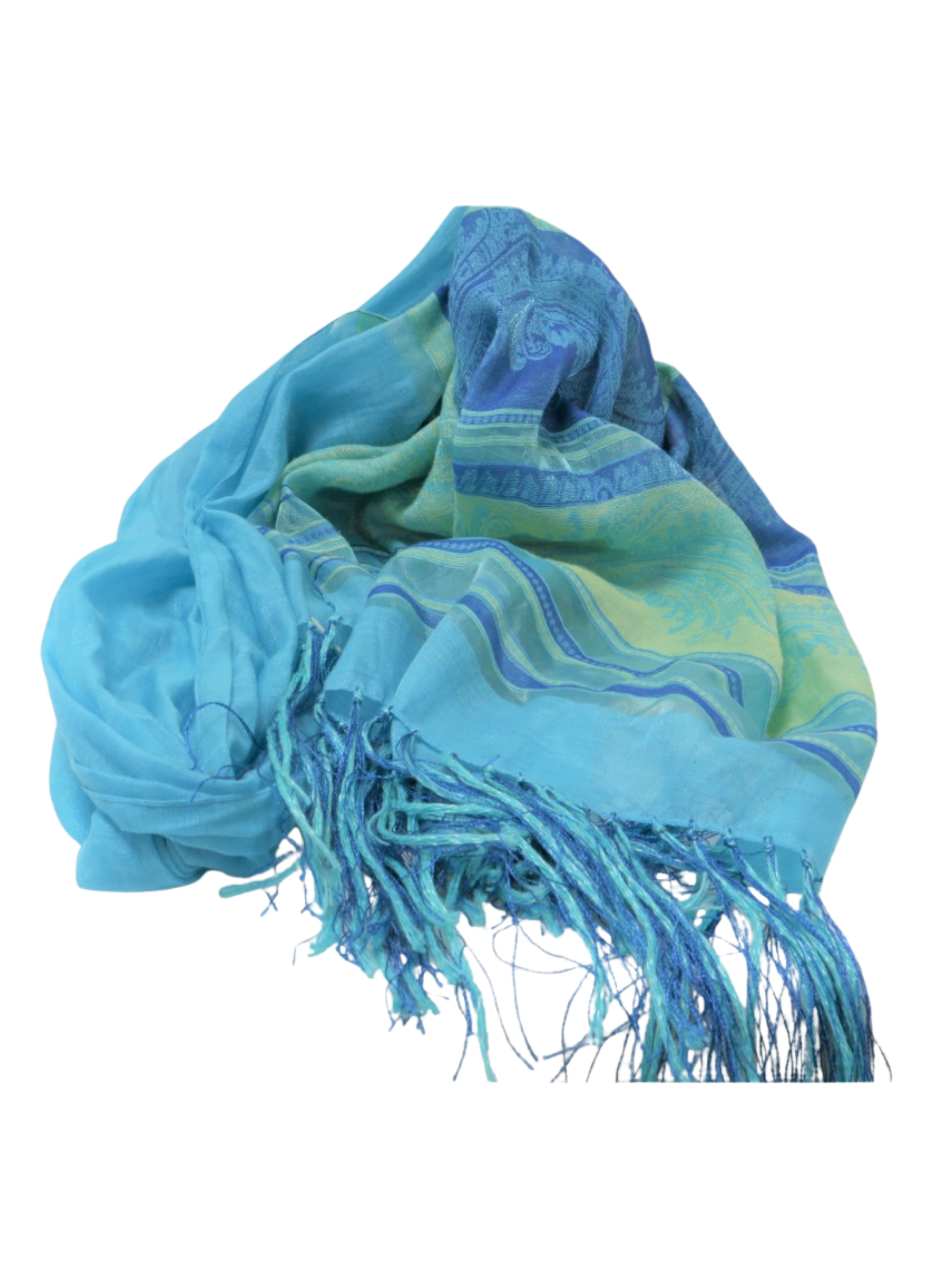 Reflect your unique style with this turquoise scarf with fringes. Made from high-quality polyester, this accessory is not only soft to the touch, but also adds a touch of color and texture to any outfit. Measuring 180 cm long and 47 cm wide, this scarf offers versatility to be worn in various ways. Its elegant fringes add additional charm and movement to your daily look. In very good condition, this scarf is ready to complement your style with a touch of freshness and sophistication on every occasion.