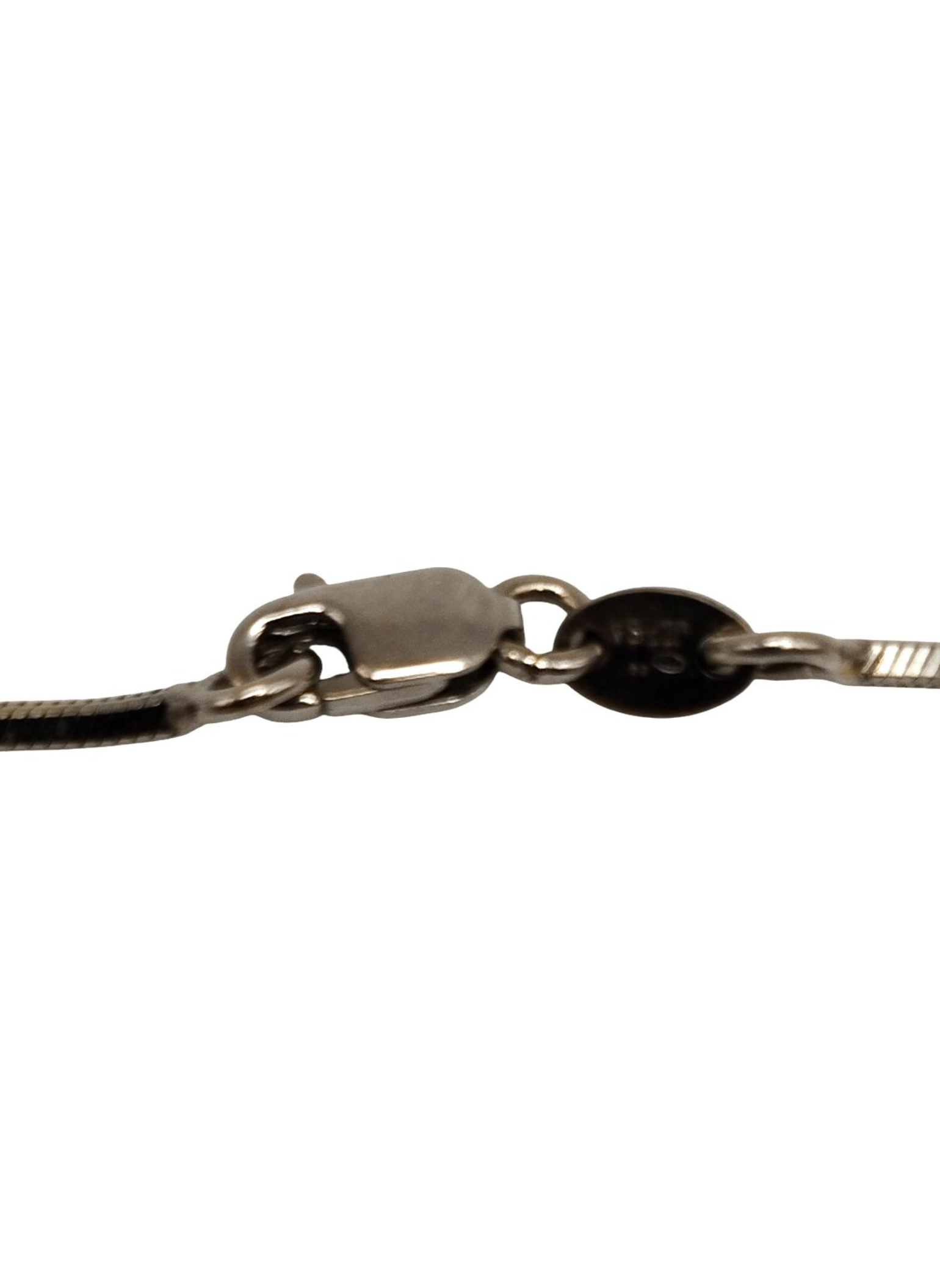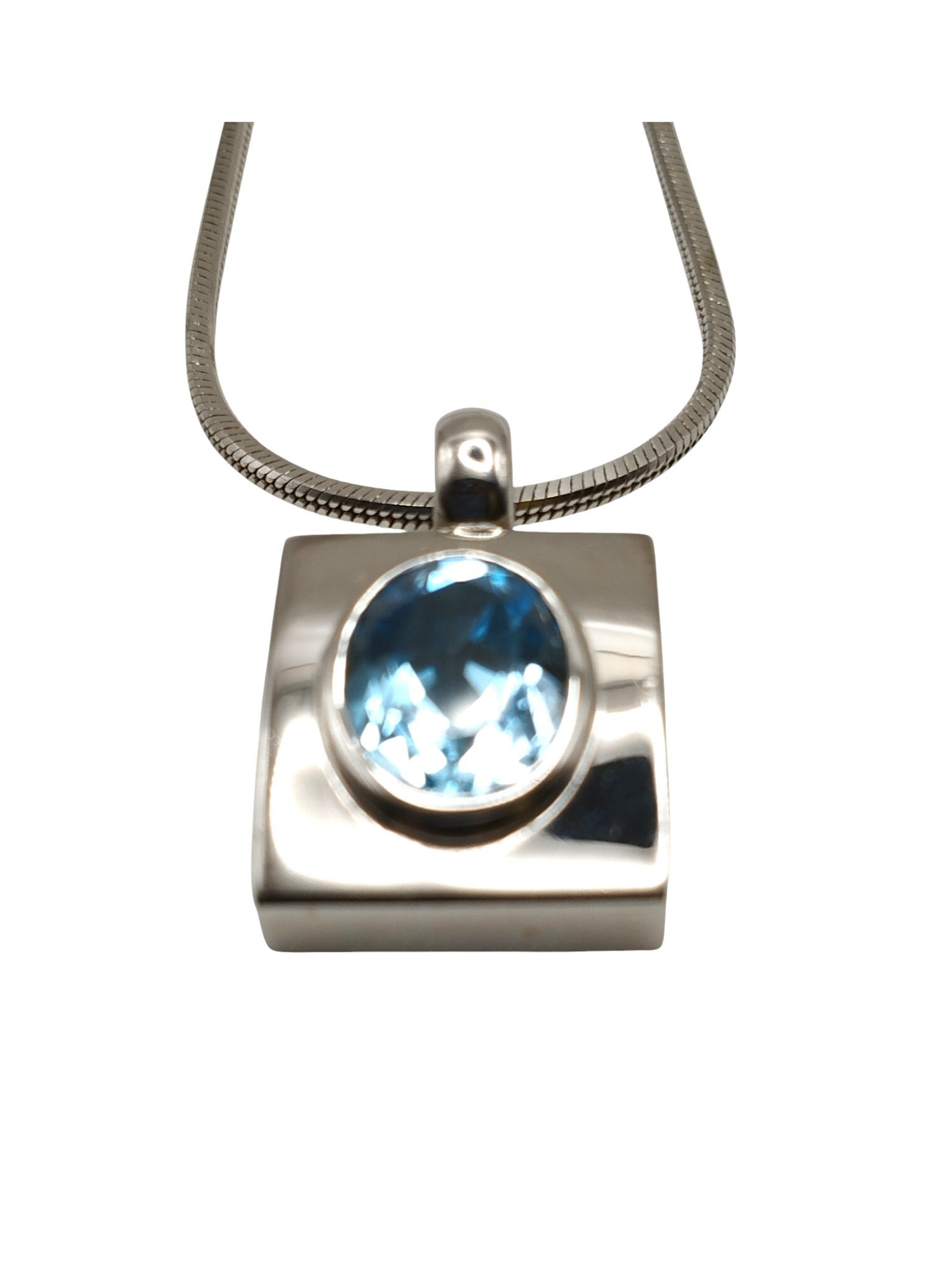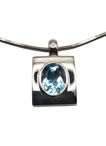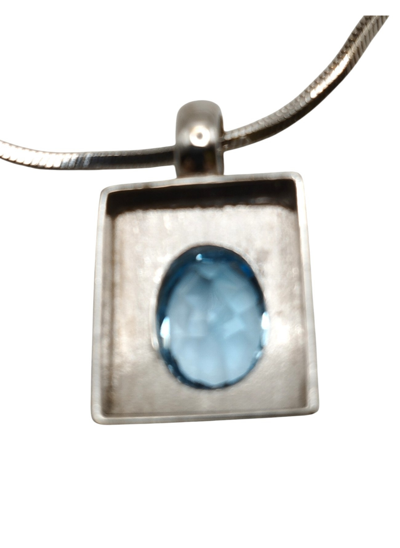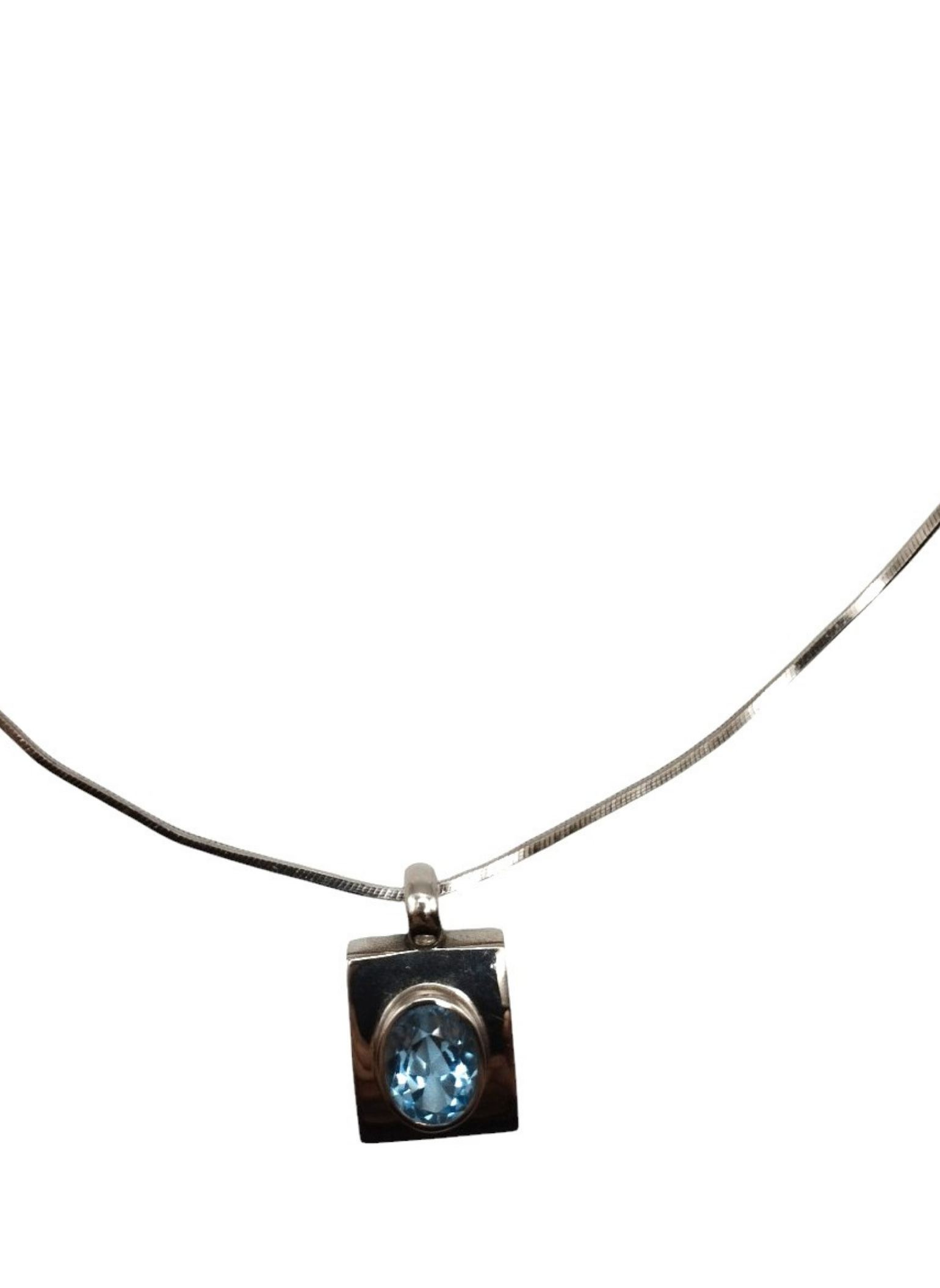 Colgante de forma cuadrado de oro blanco de 18 Kts, con topacio azul de forma oval,con cadena de oro blanco tipo "cola de ratón".Tiene un peso total de 10,6 grs.La cadena mide 45 cms.El colgante mide 20,5 mm de alto x12,7 mm.