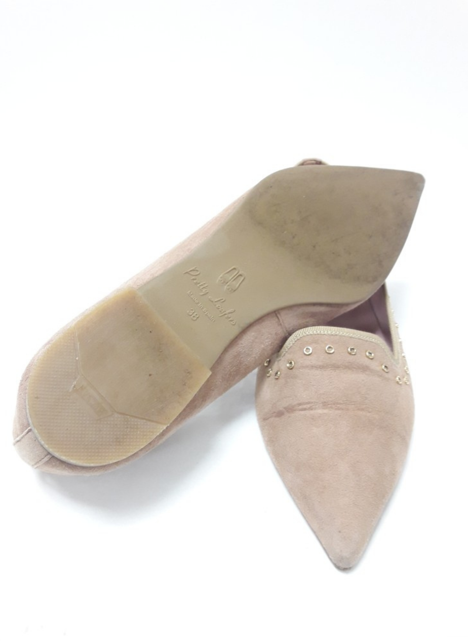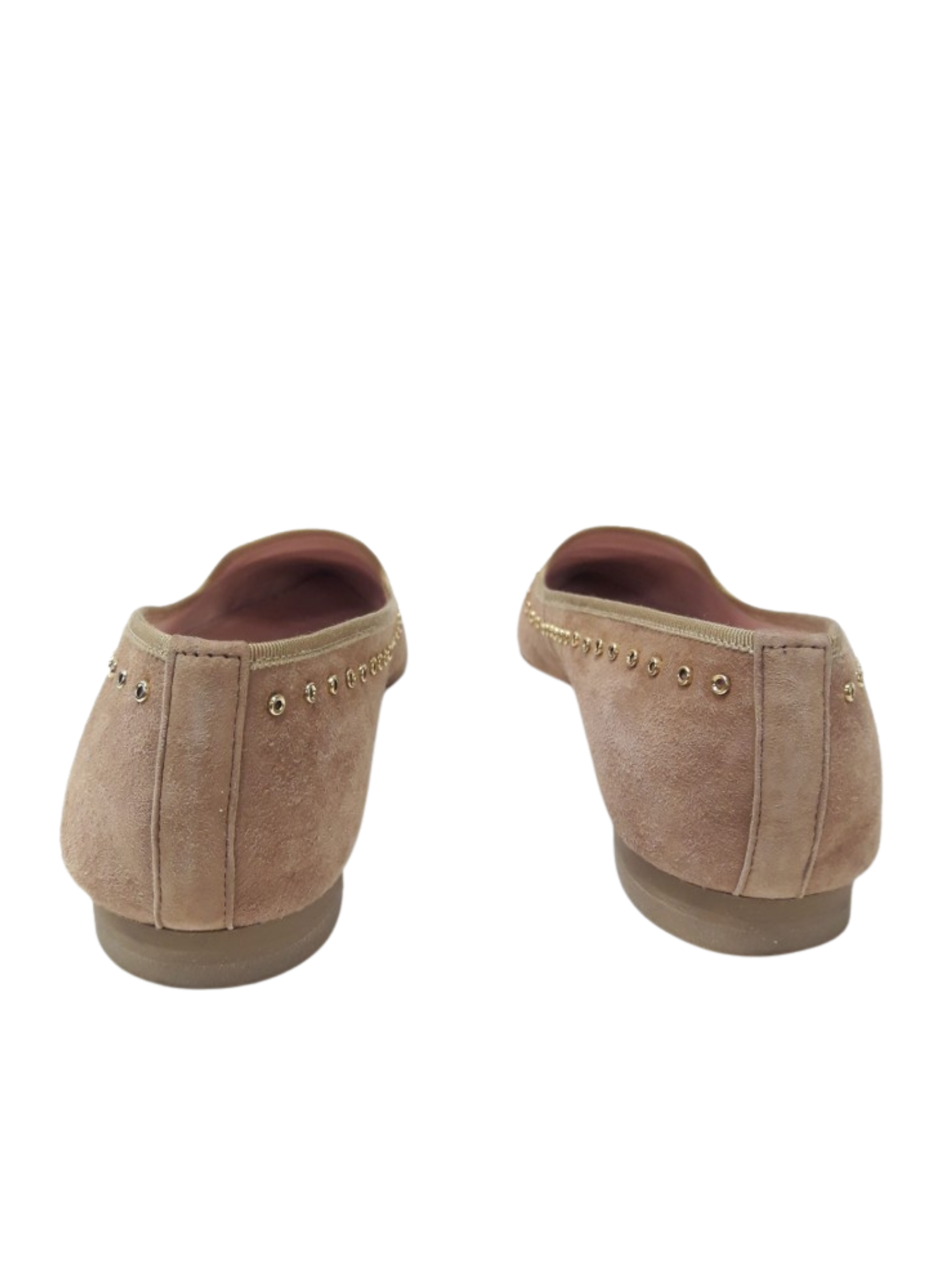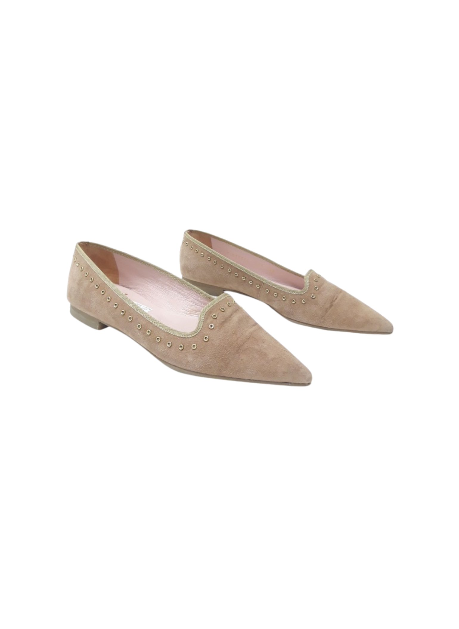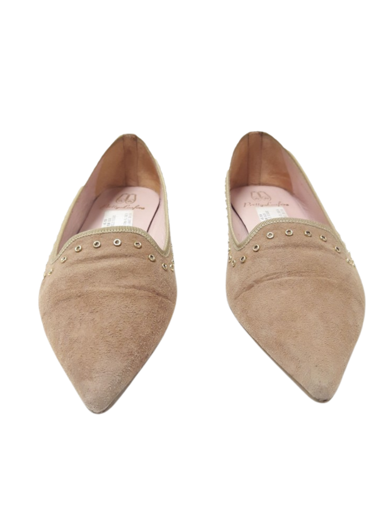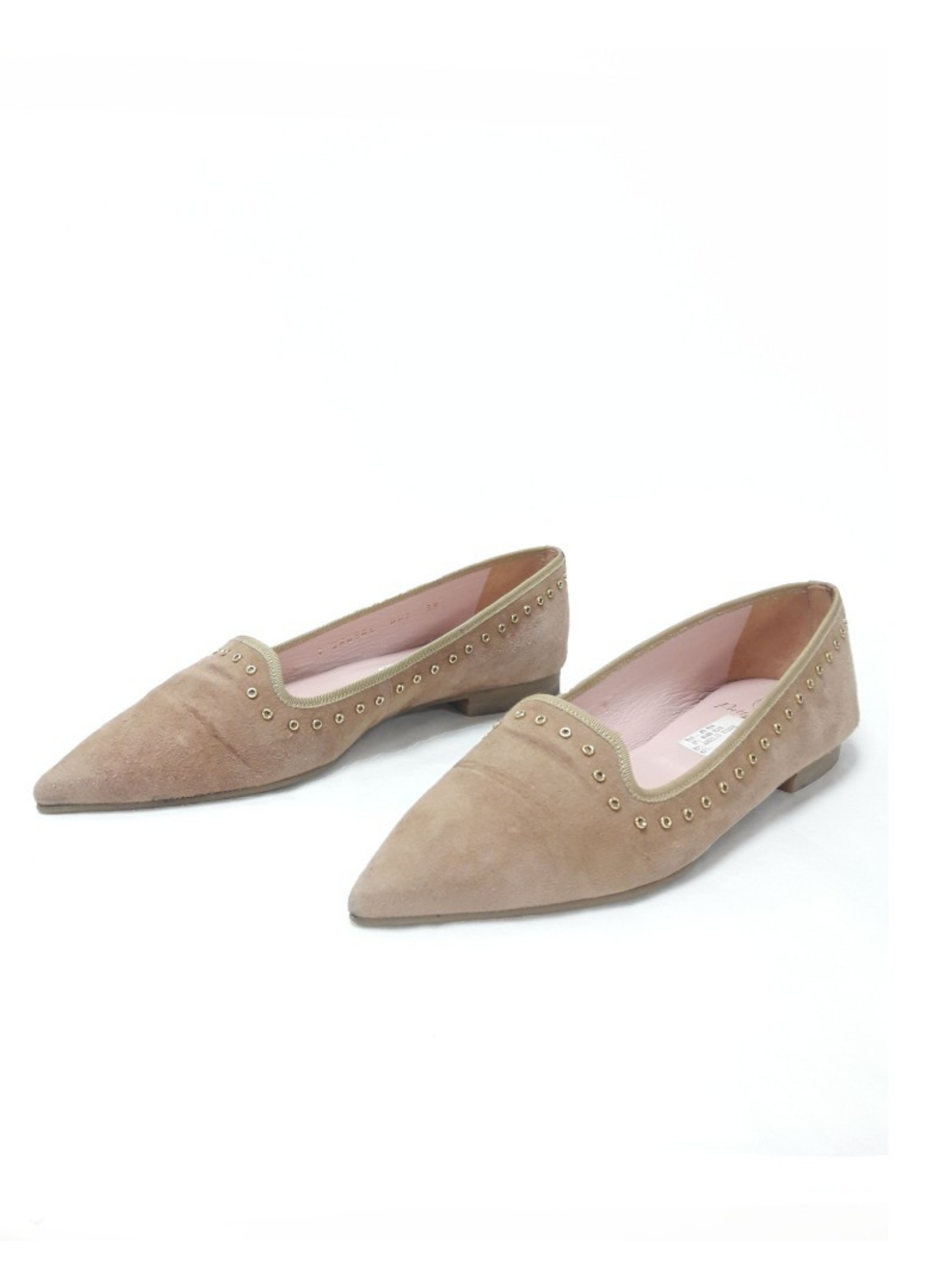 Bailarinas de la marca Pretty Loafers acabadas en punta con orla de tachuelas caladas doradas color beige y elaboradas en ante. Es una talla 38, y contiene un tacón de 1cm.