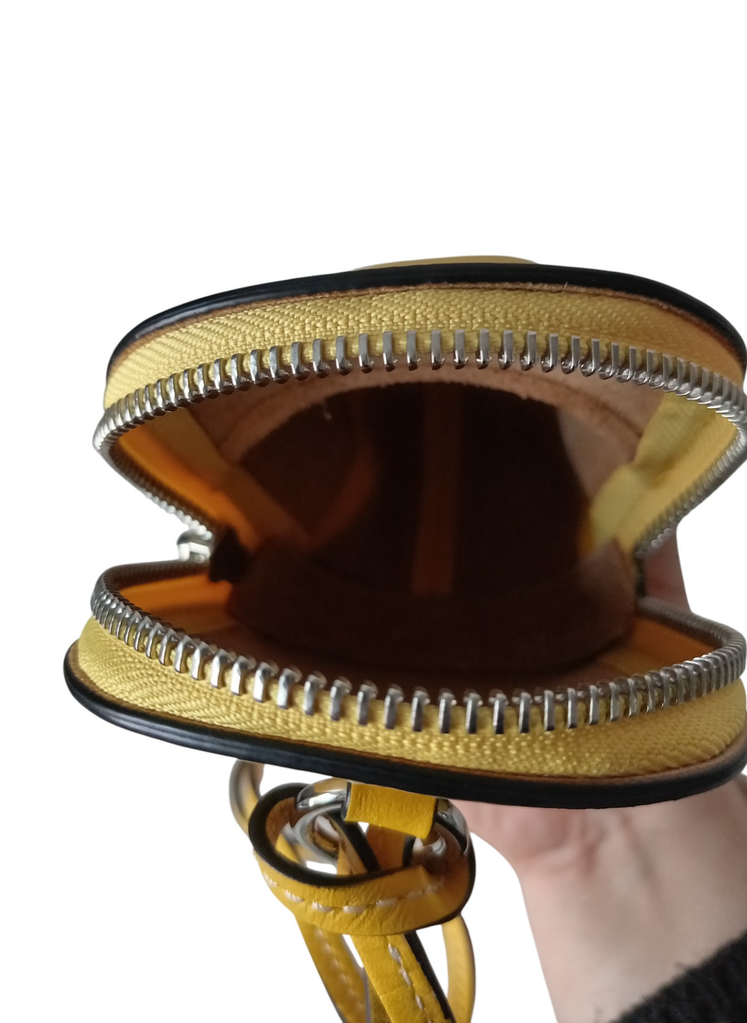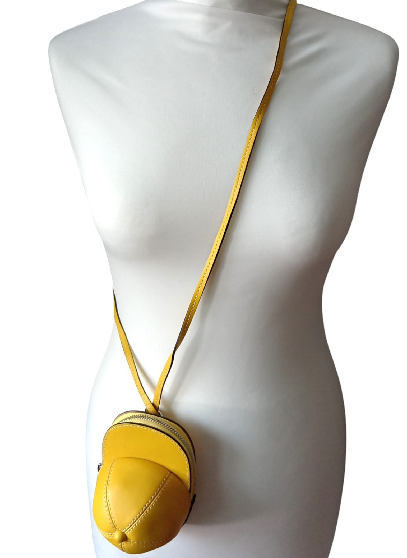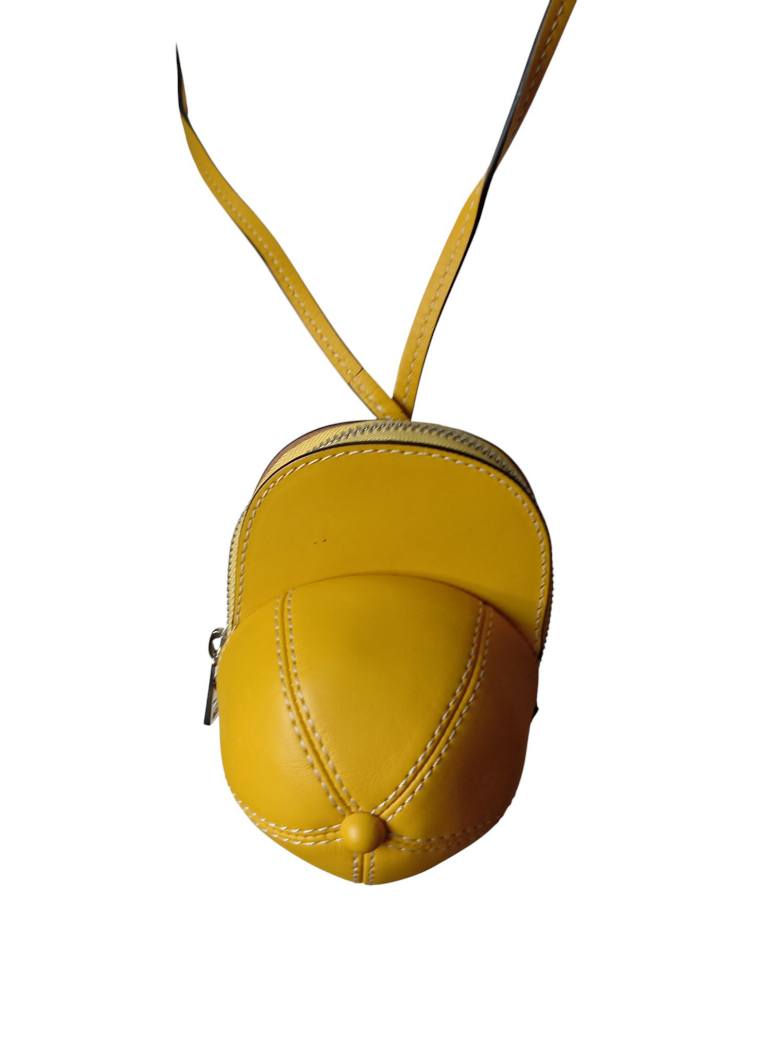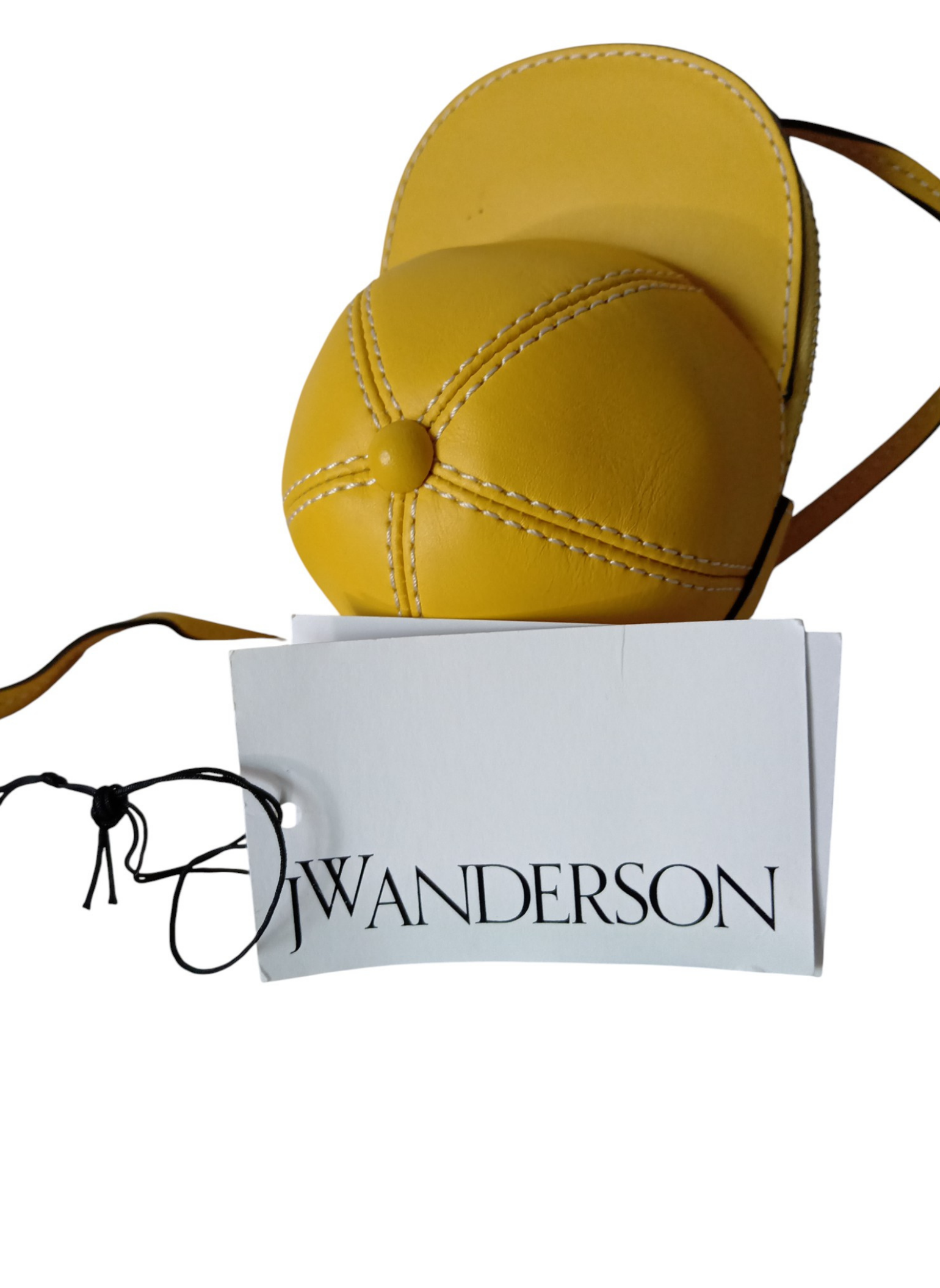 Bolso Mini Bandolera "Nano Cap" de JW Anderson.Diseño de gorra de beisbol color amarillo con costuras blancas.Correa desmontable para llevar al hombro o cruzada.Interior de ante beige.Cierre de cremallera que bordea la visera.Esta sin estrenar con sus etiquetas y su bolsa guardapolvos.Medidas : 10 cms ed ancho x 13 cms de alto