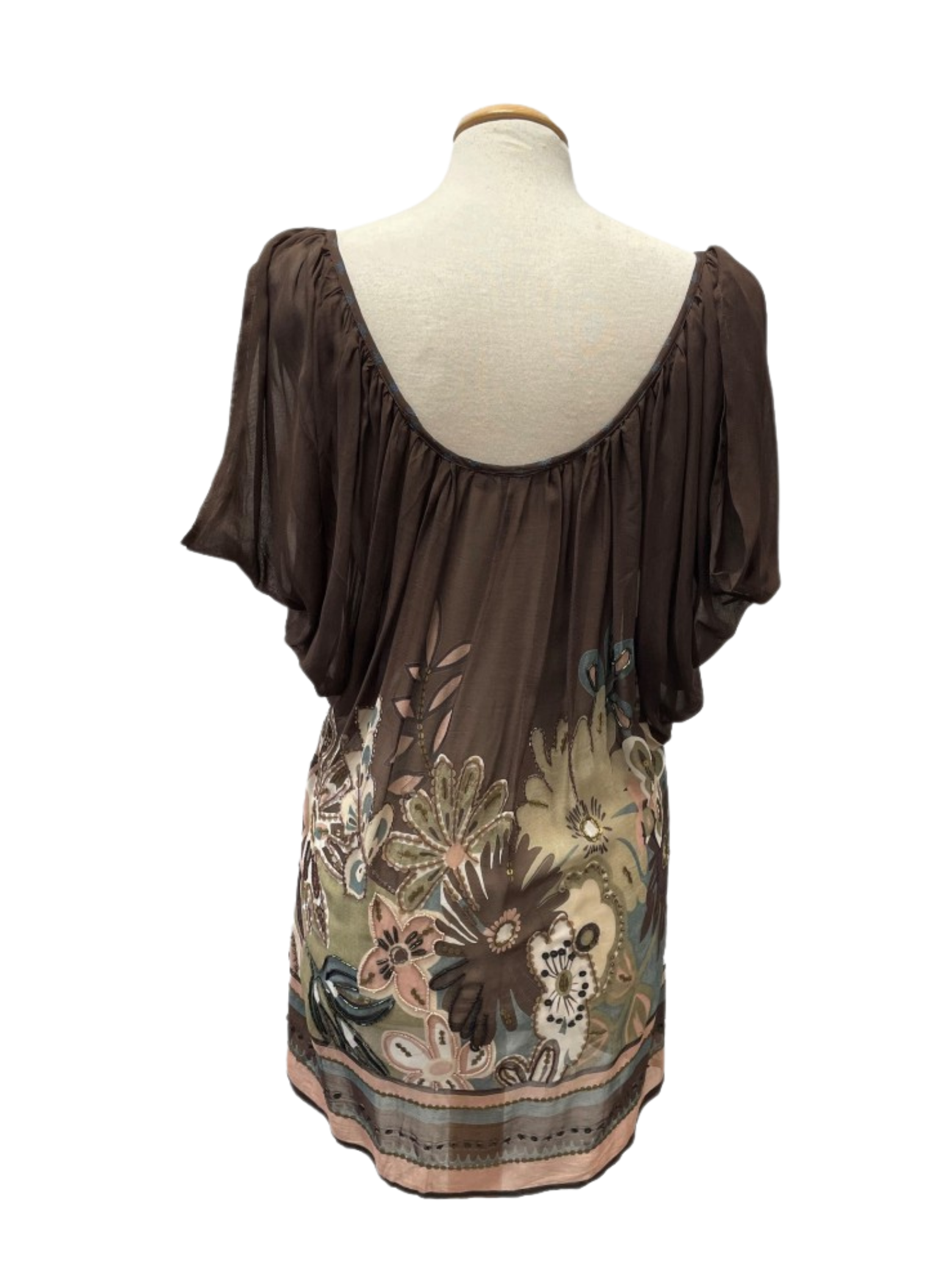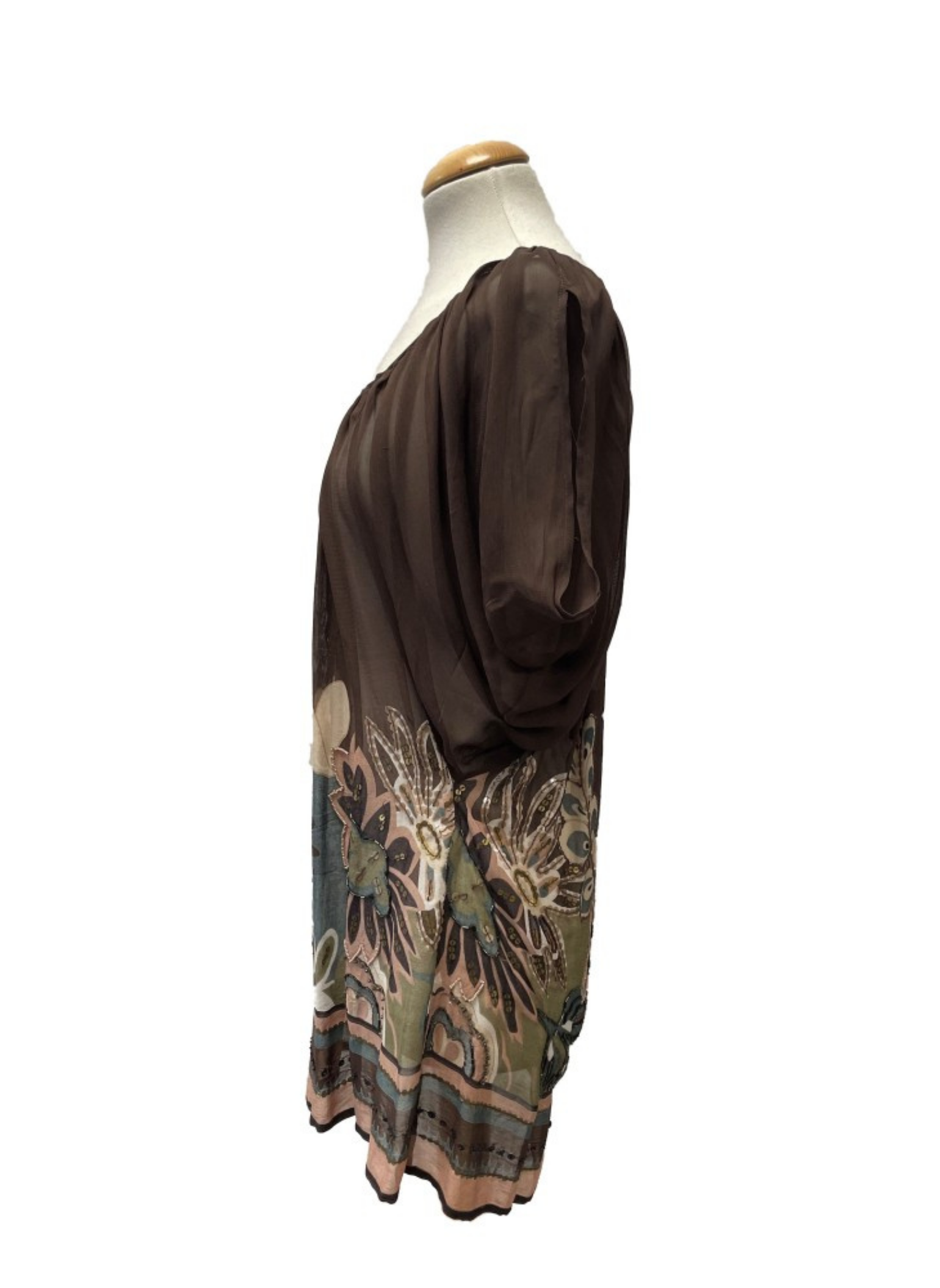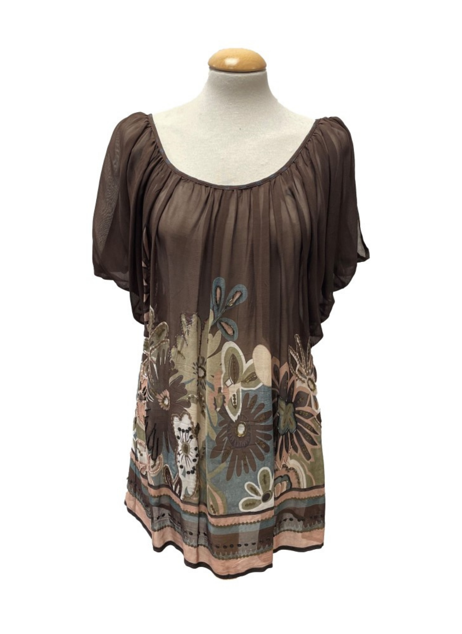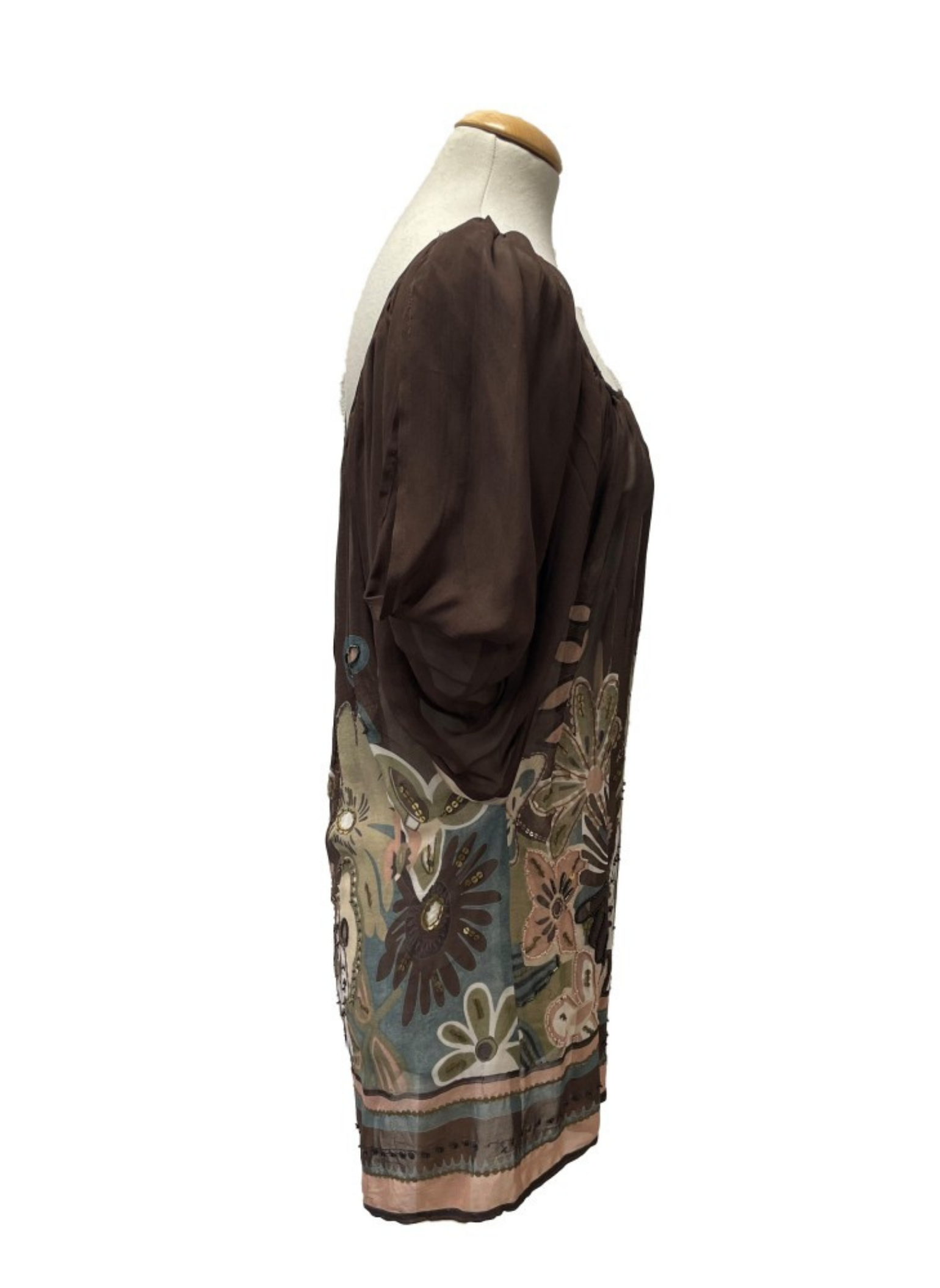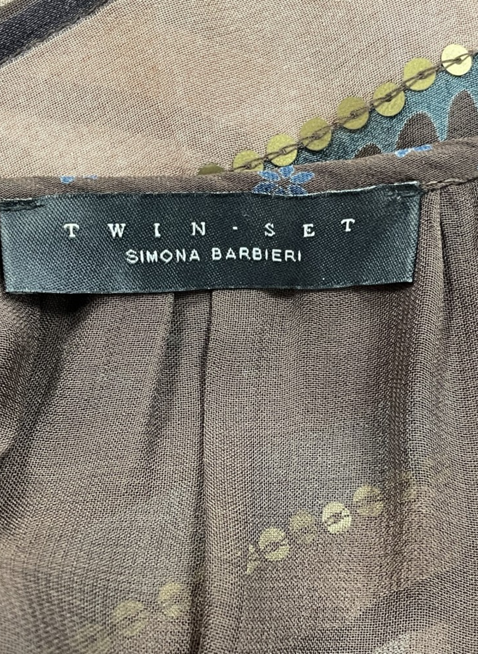 Multicolor blouse from the Simona Barbieri brand, with flower details with beads and sequins. Size S (38). This blouse does not show any type of use. Made with 100% silk.