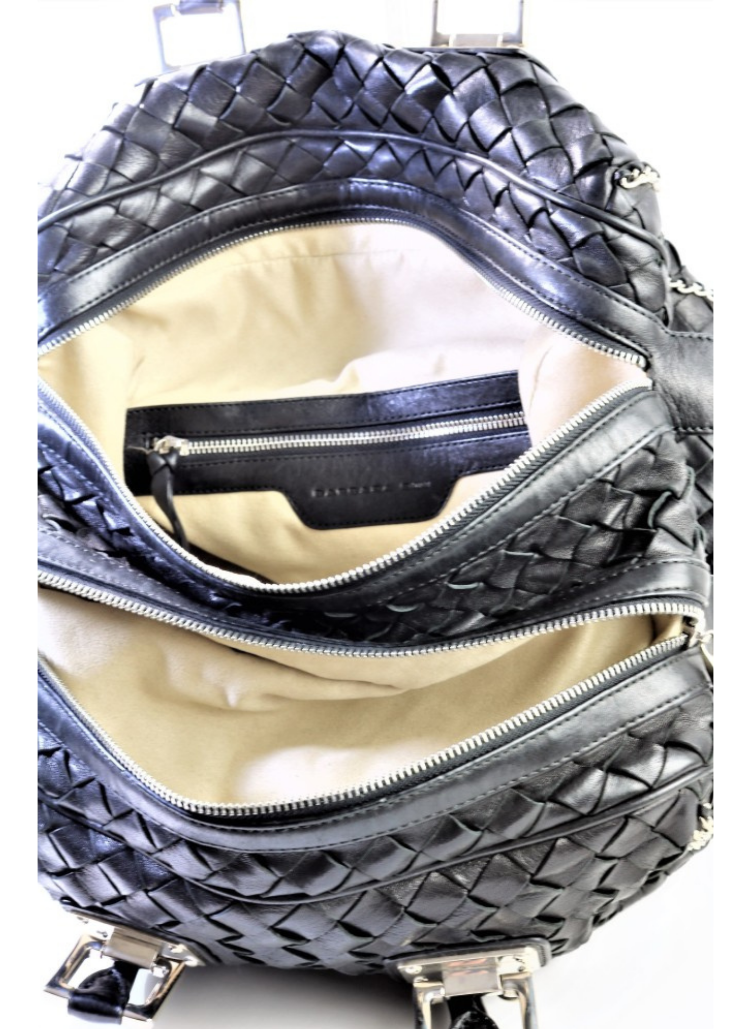 Barbara Bui brand bag in black braided leather, with silver-tone hardware and handles. It opens with a zipper to two interiors lined in camel suede with zipper pockets. It does not show any signs of use.