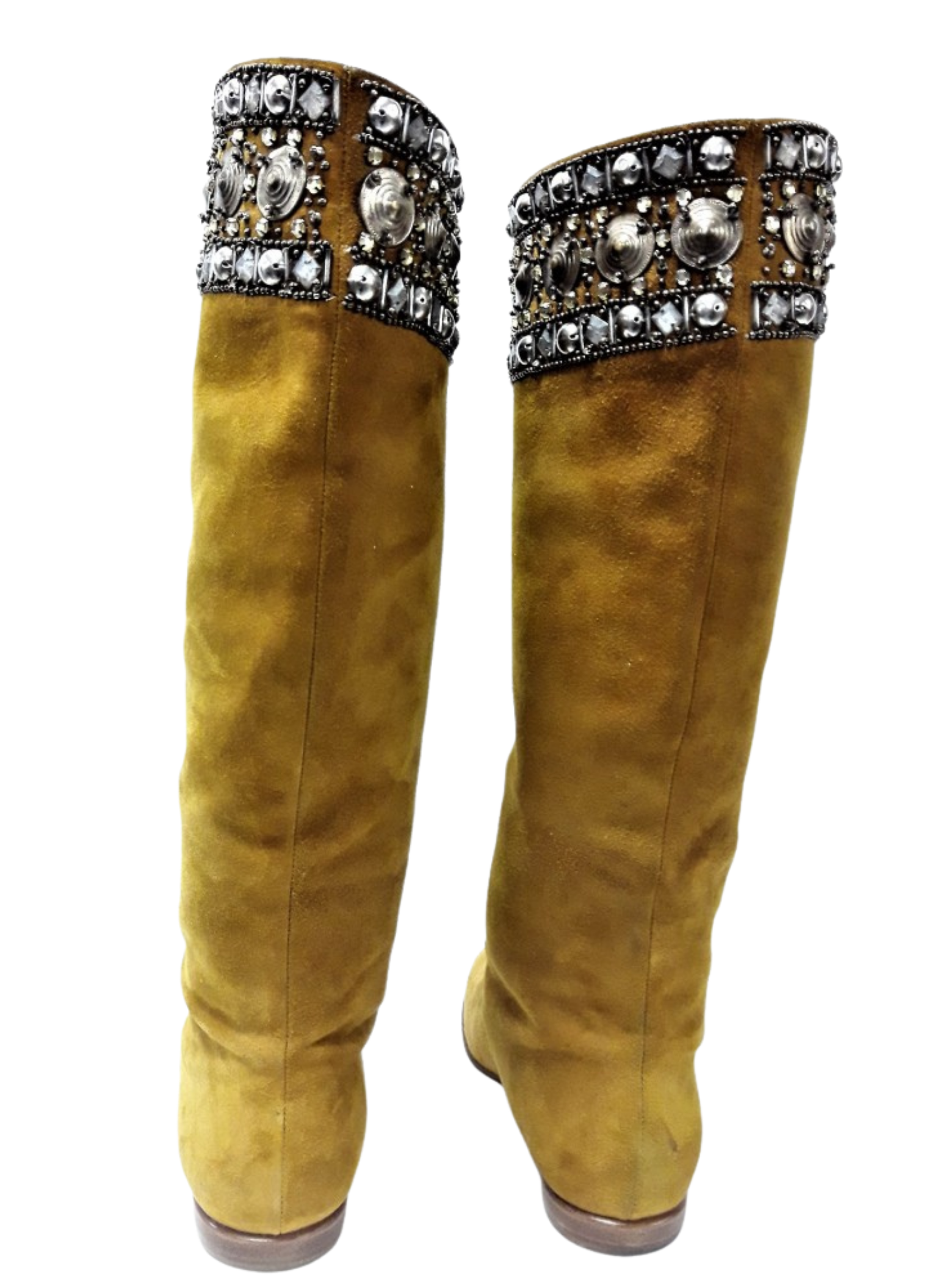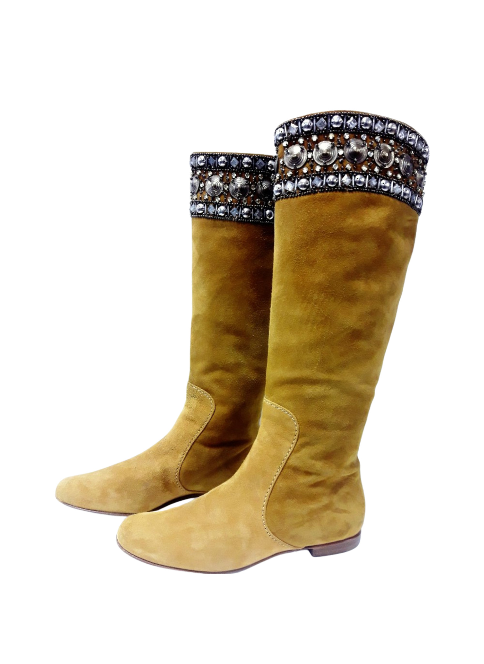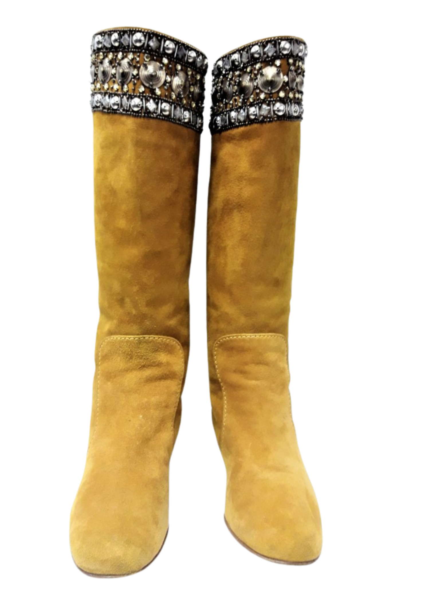 Mustard-colored suede boots with hardware stripe and decorative crystals at the beginning of the boot shaft. These boots do not show any signs of use. It is a size 39.