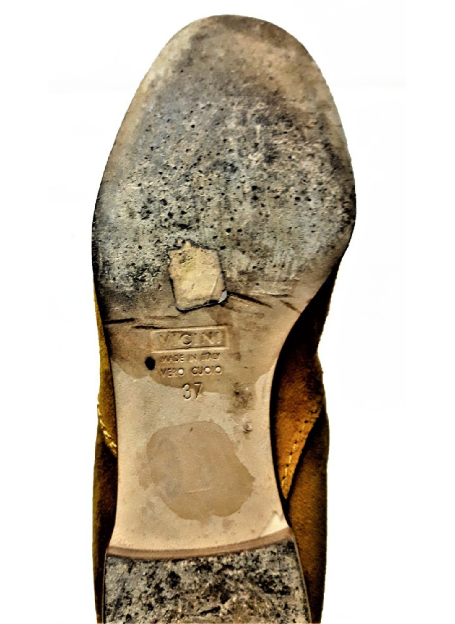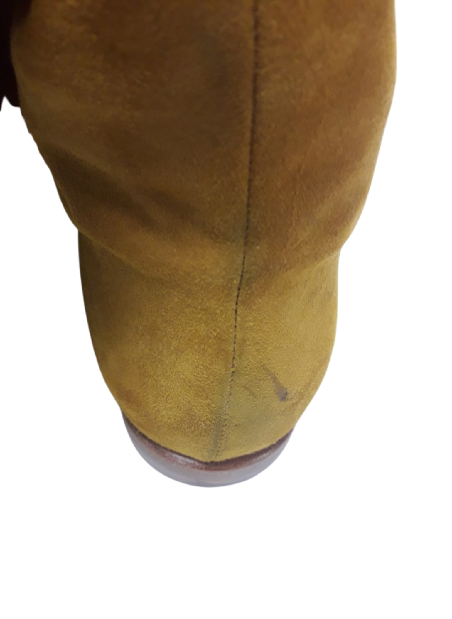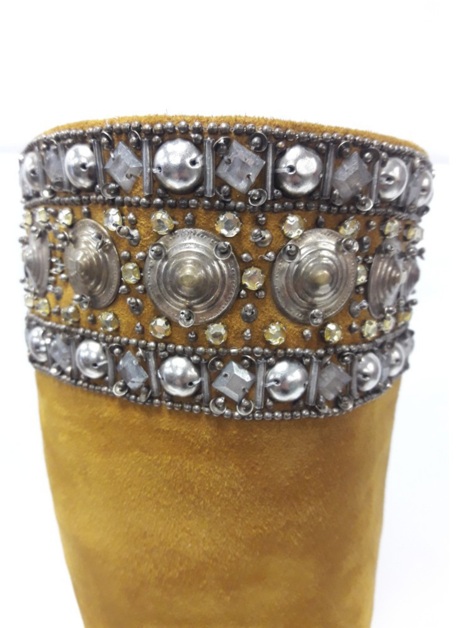 Mustard-colored suede boots with hardware stripe and decorative crystals at the beginning of the boot shaft. These boots do not show any signs of use. It is a size 39.