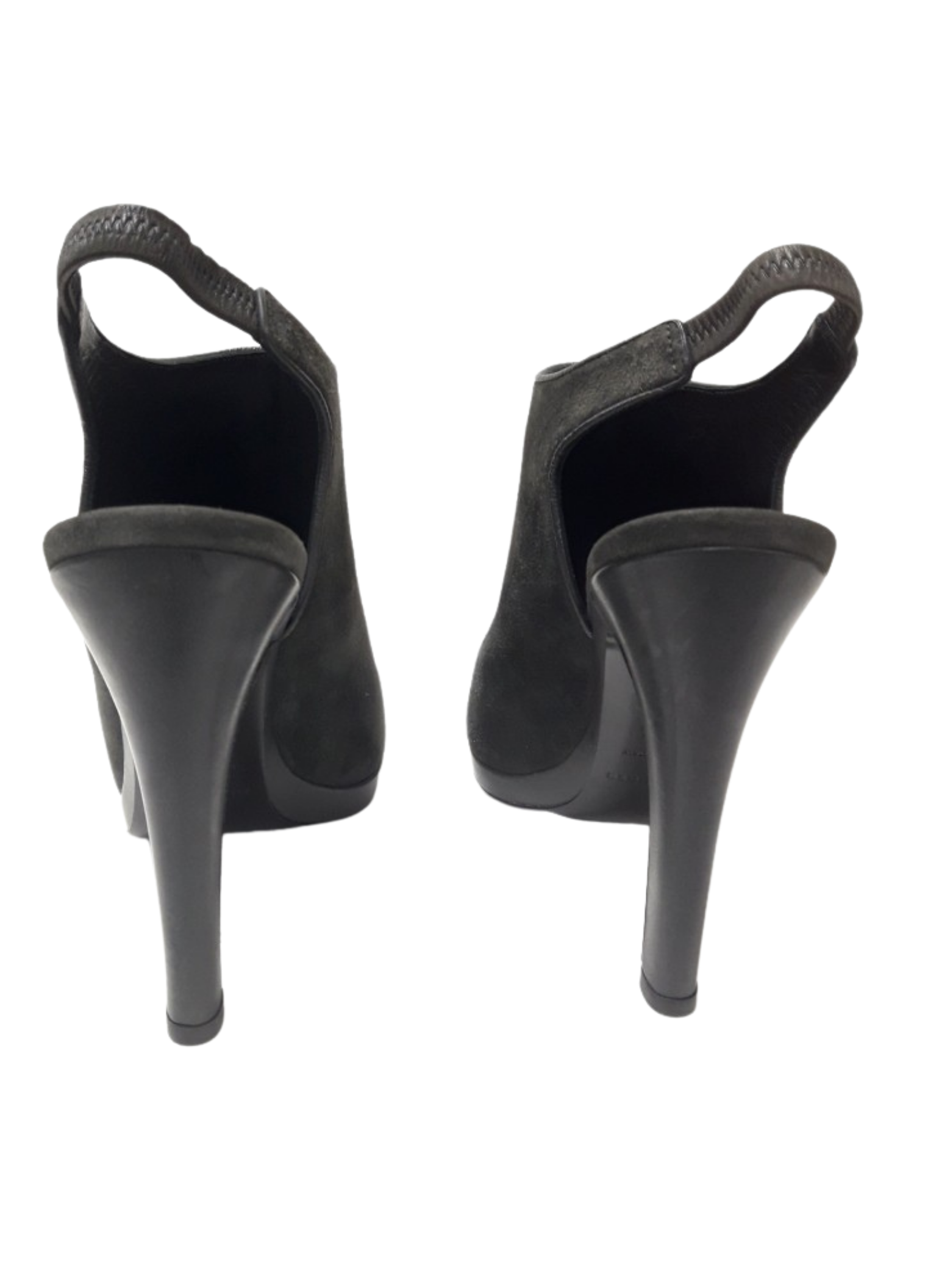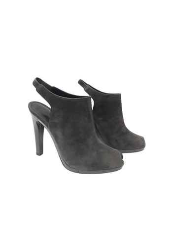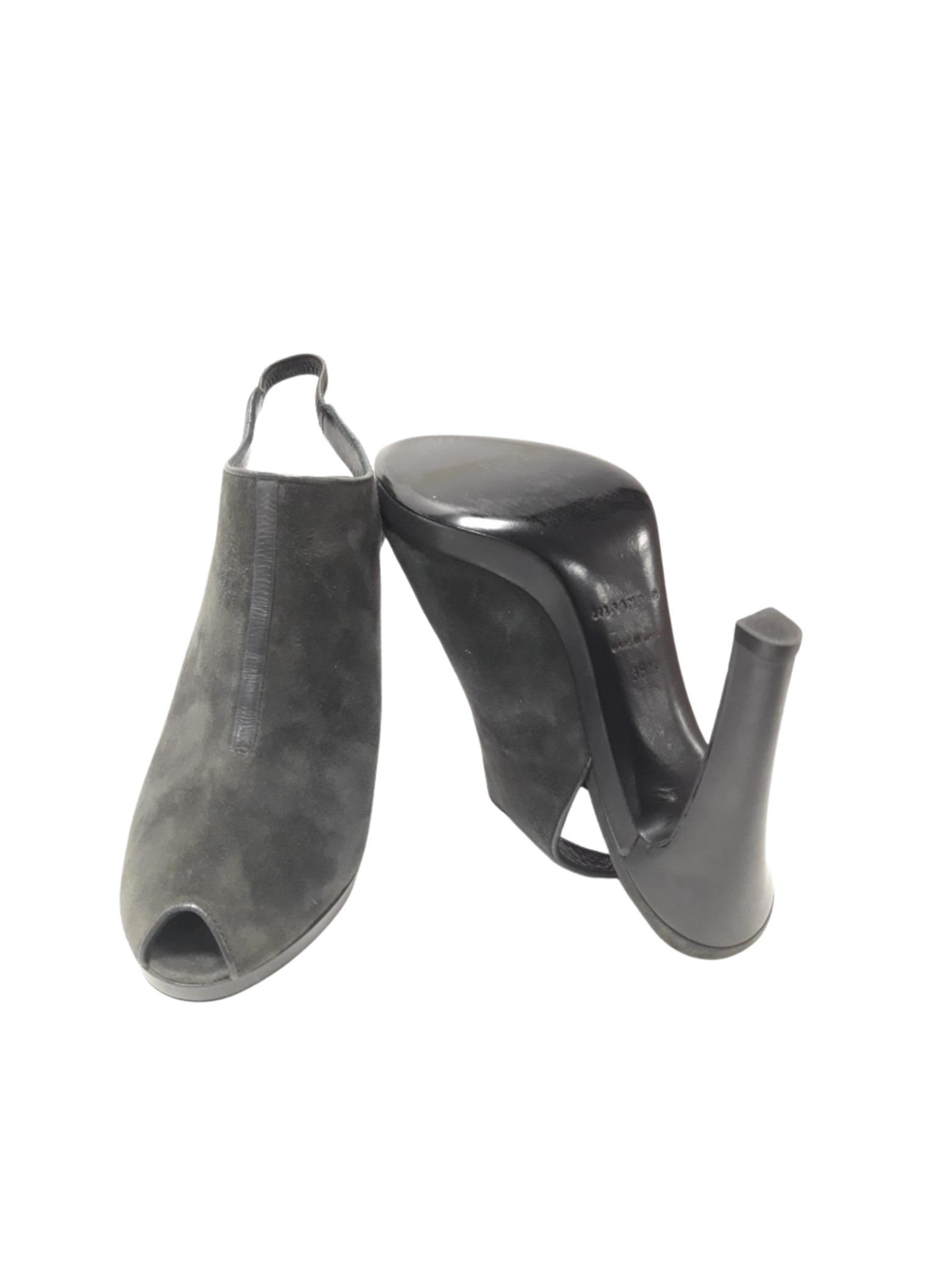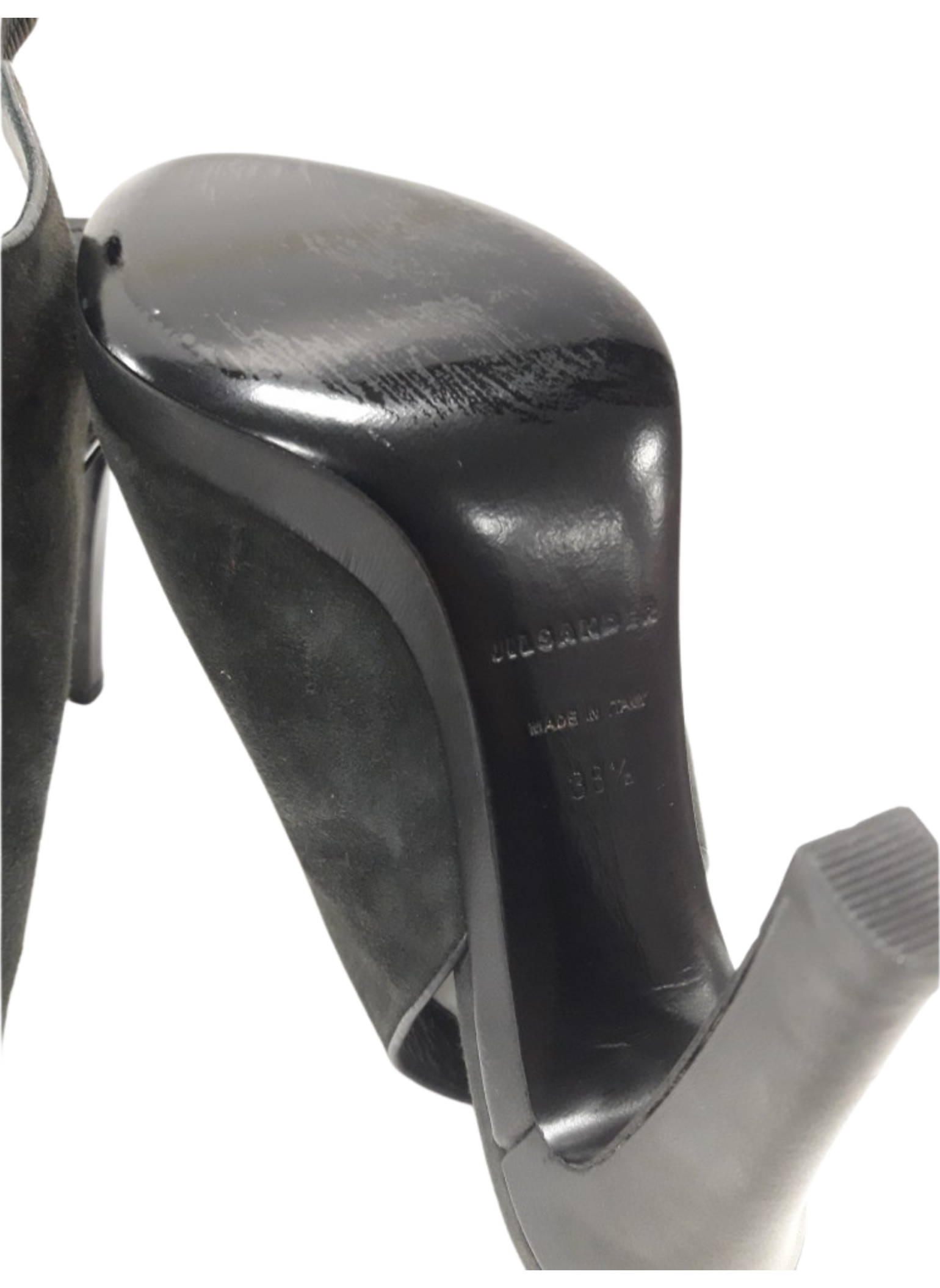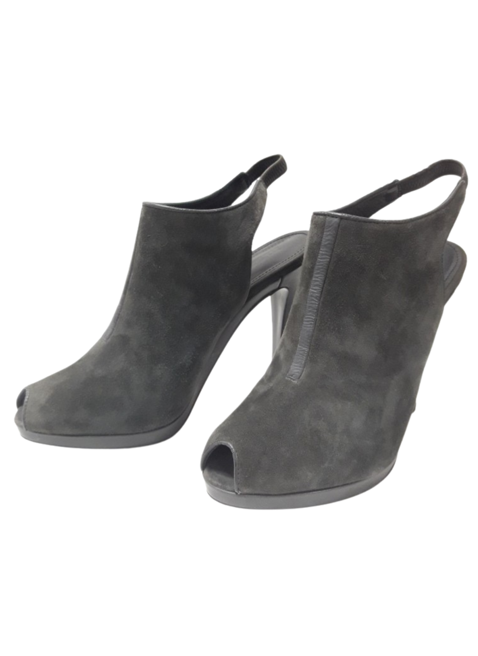 Botin de la marca Jil Sander abierto por delante y detrás de ante y piel en color gris. El tacón mide 11cm y la plataforma 1cm. Es una talla 38,5. Estos botines no presentan señales de uso.