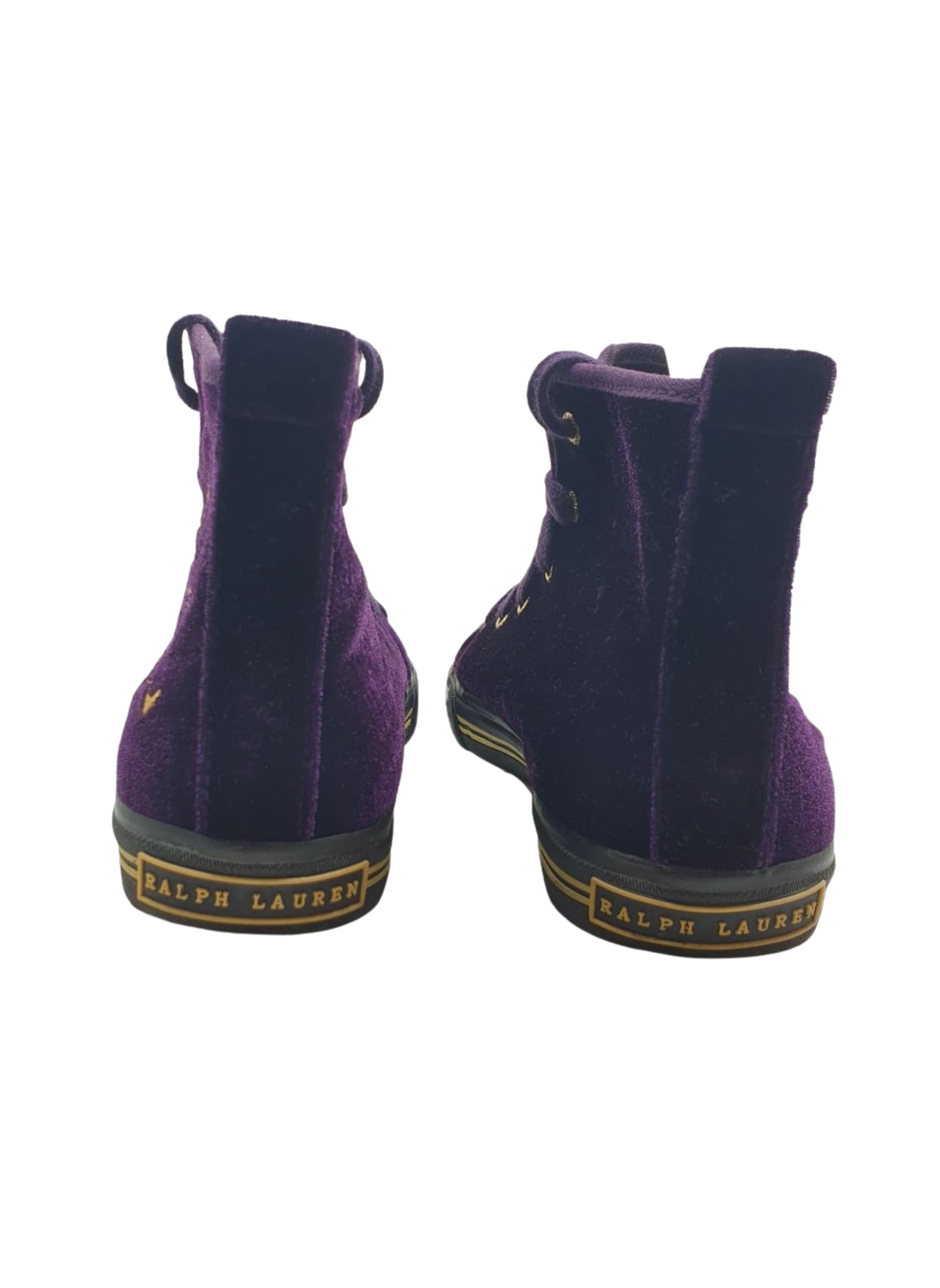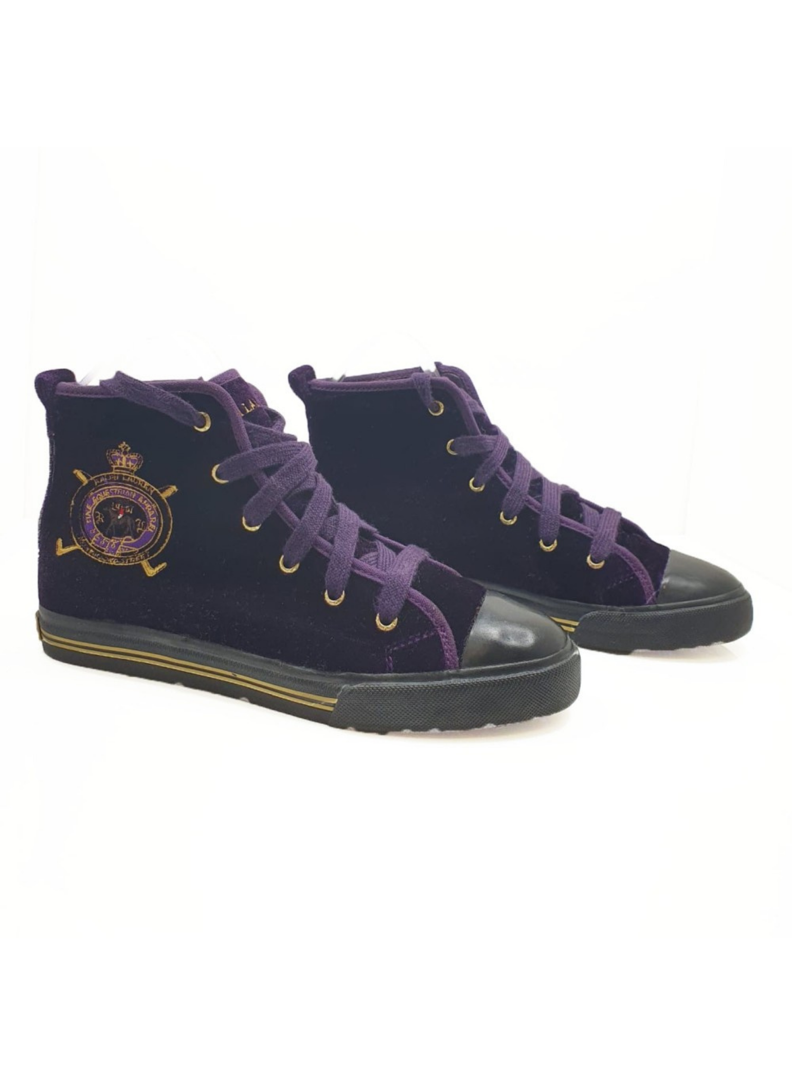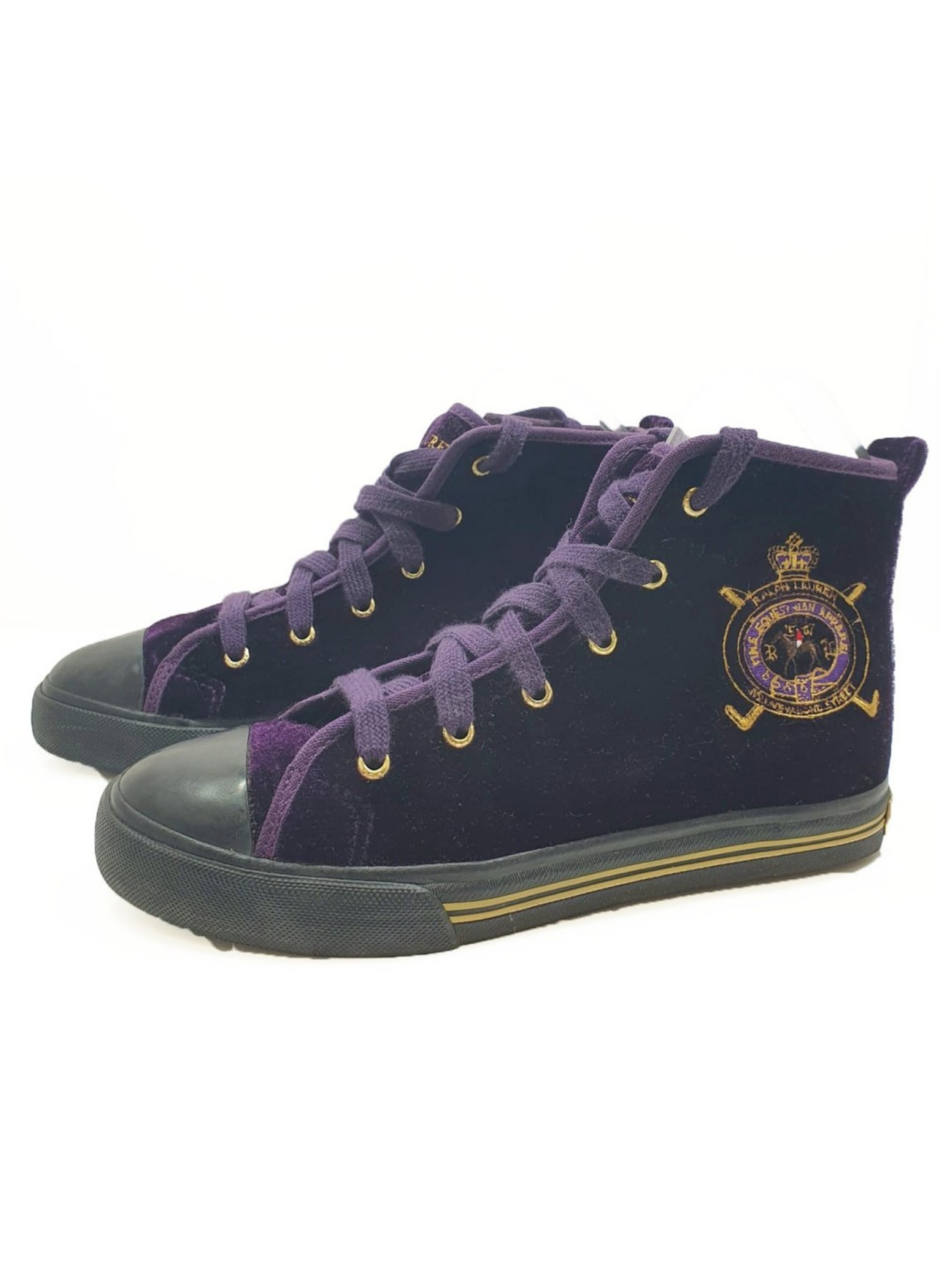 Boot from the Ralph Lauren brand in purple velvet with a shield on the side, toe cap and black rubber sole. The laces are also purple. These boots do not show any signs of use. It is a size 34.