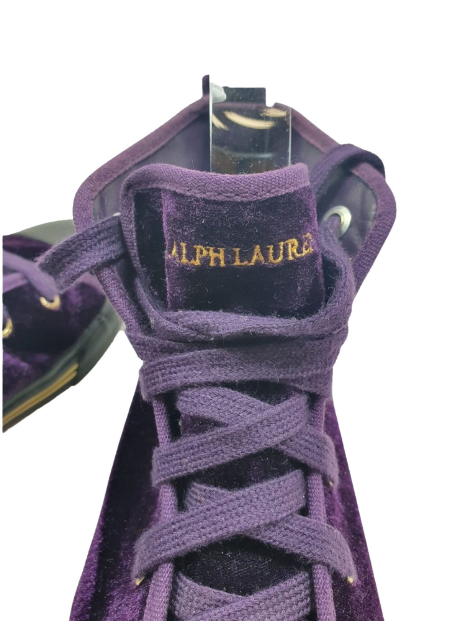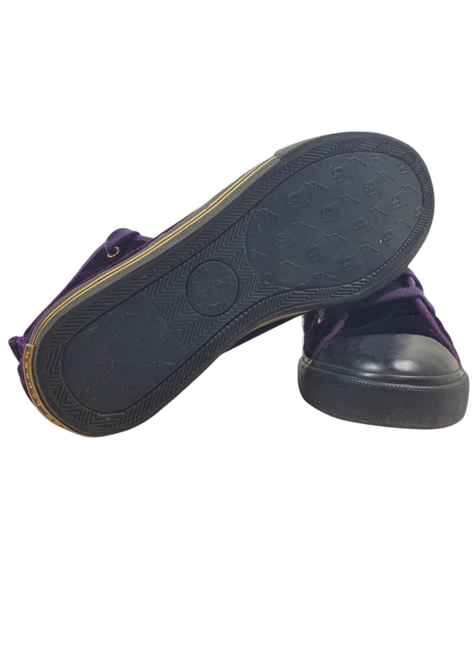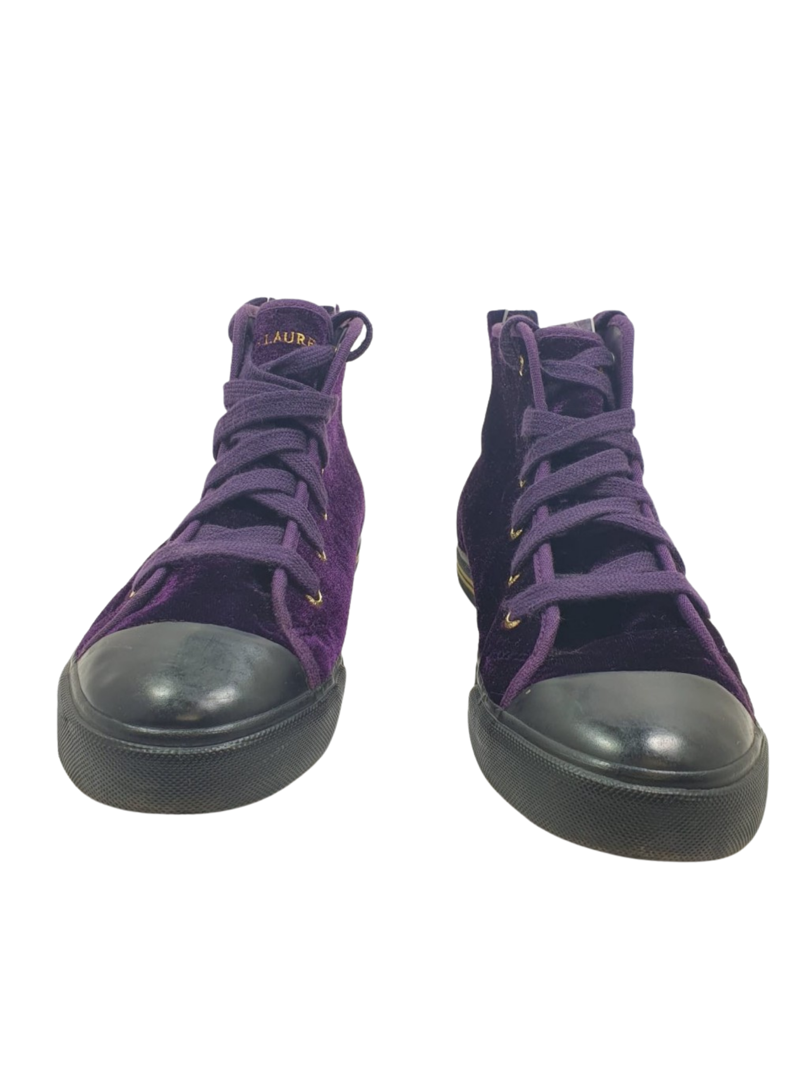 Boot from the Ralph Lauren brand in purple velvet with a shield on the side, toe cap and black rubber sole. The laces are also purple. These boots do not show any signs of use. It is a size 34.