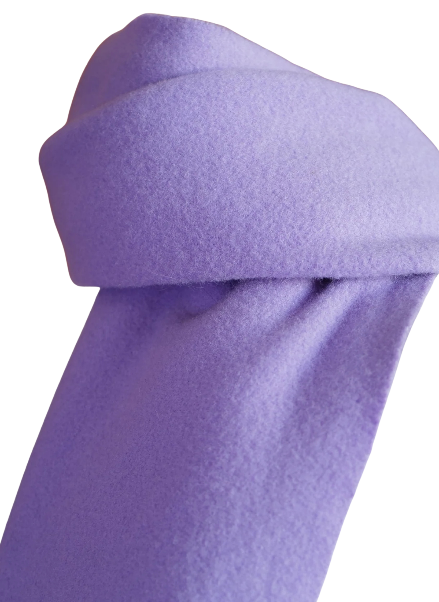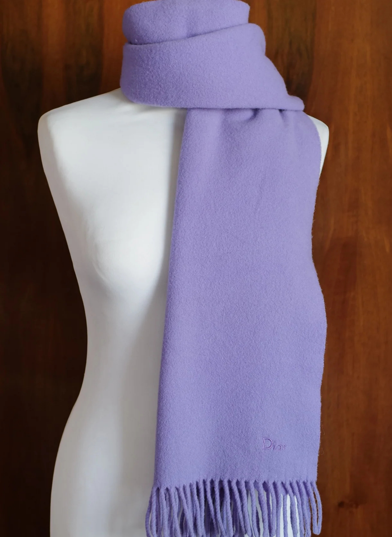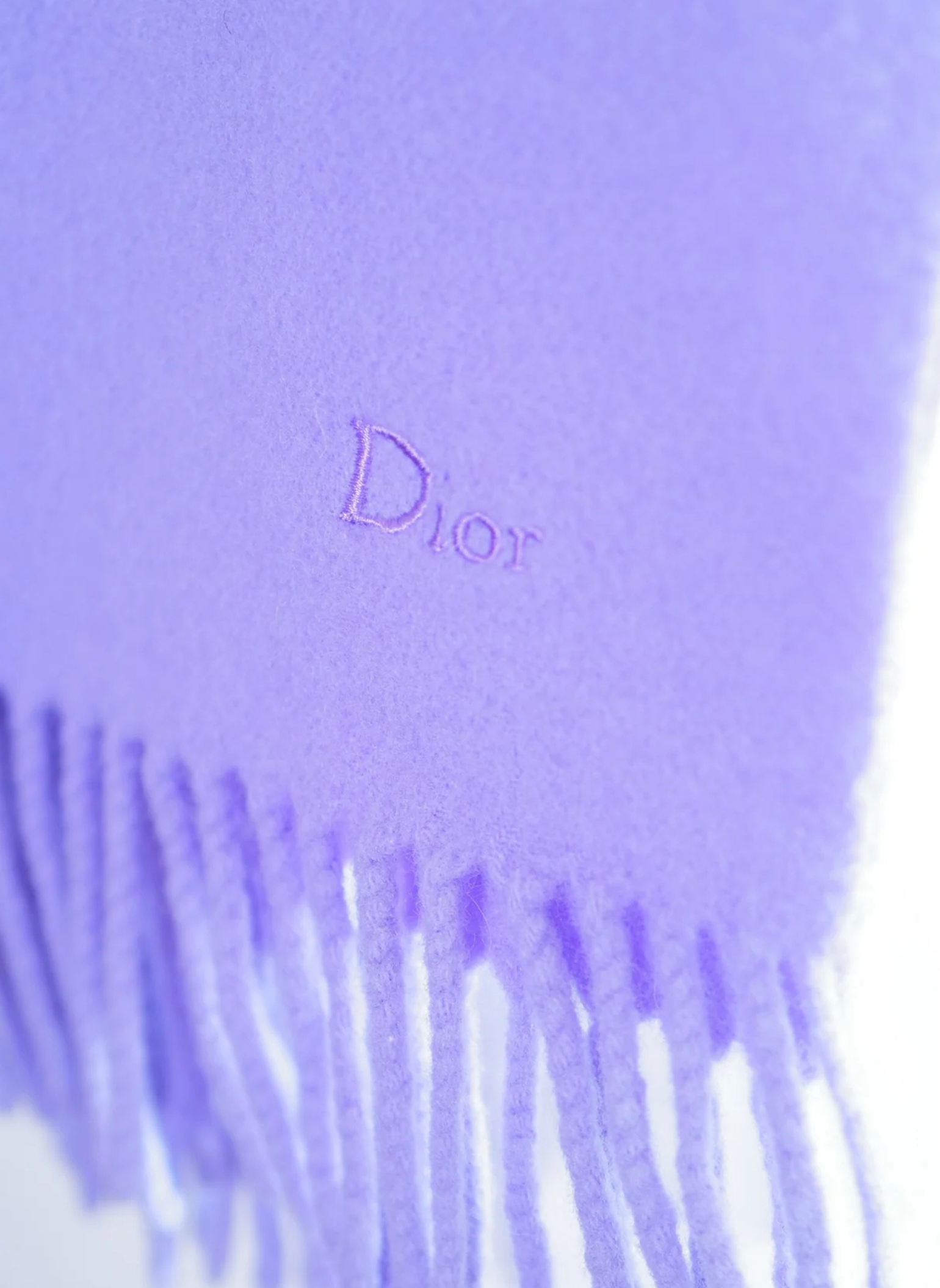 Bufanda de la marca Dior morada, lisa terminada en flecos y con Dior grabado.