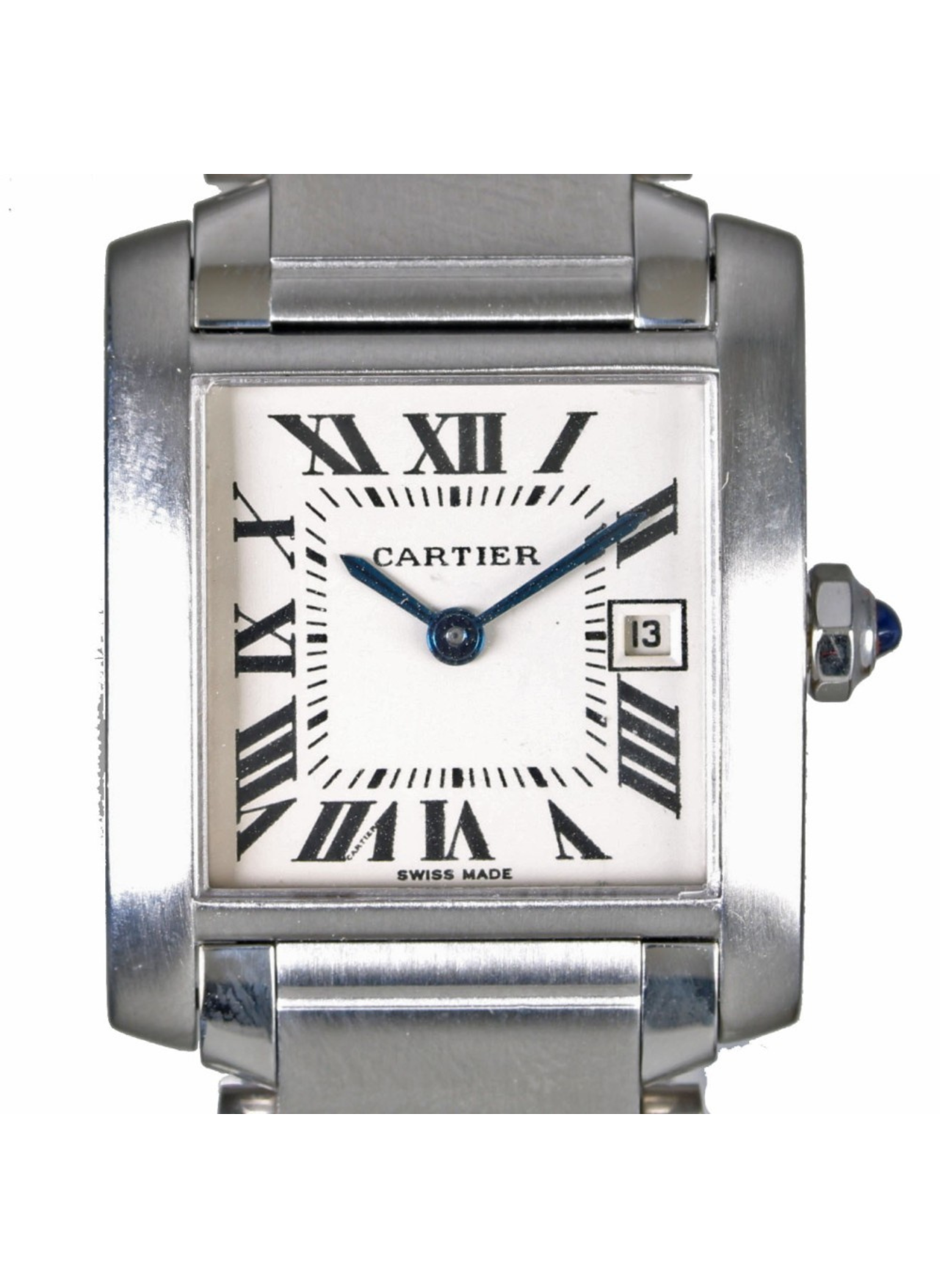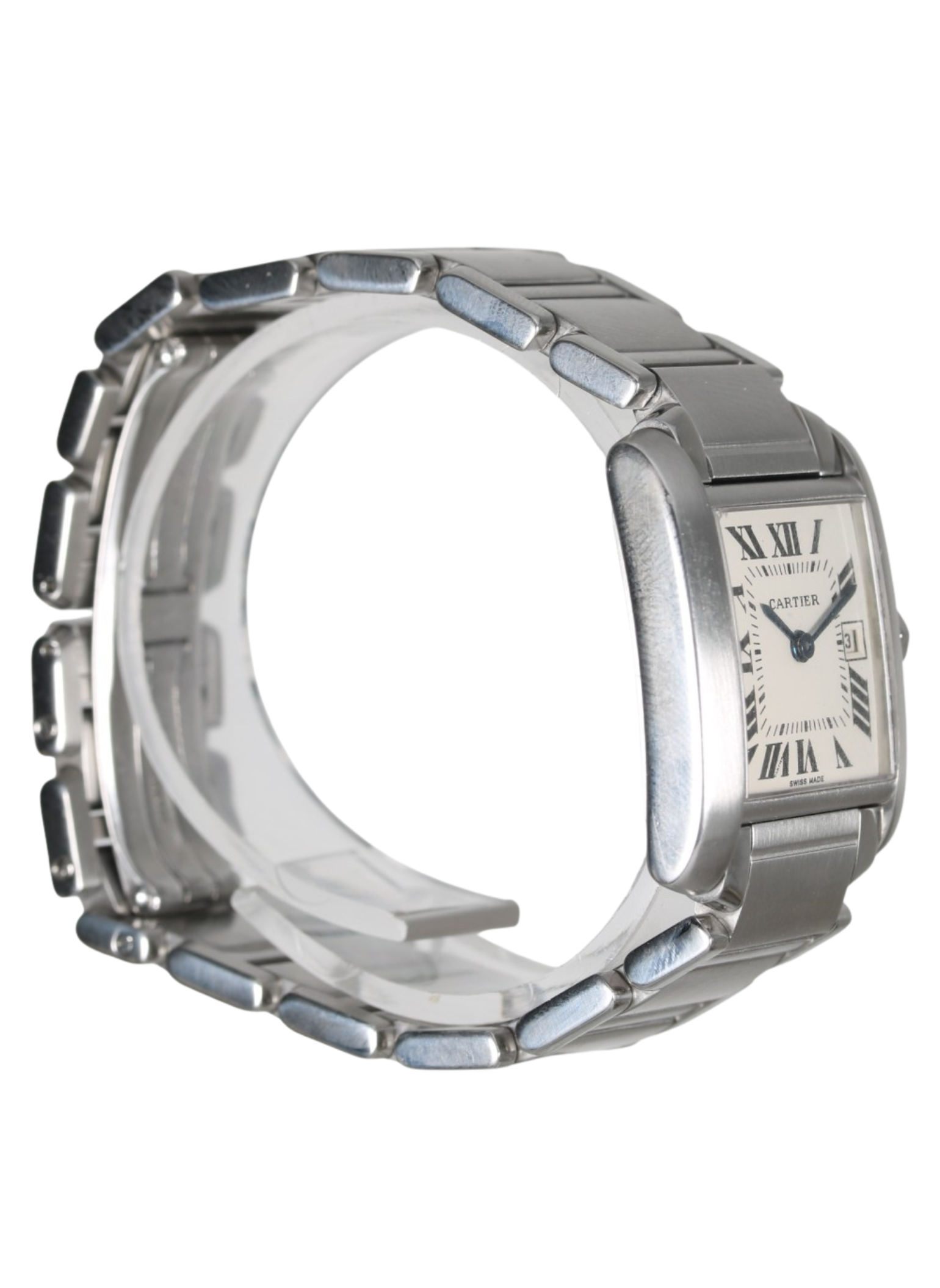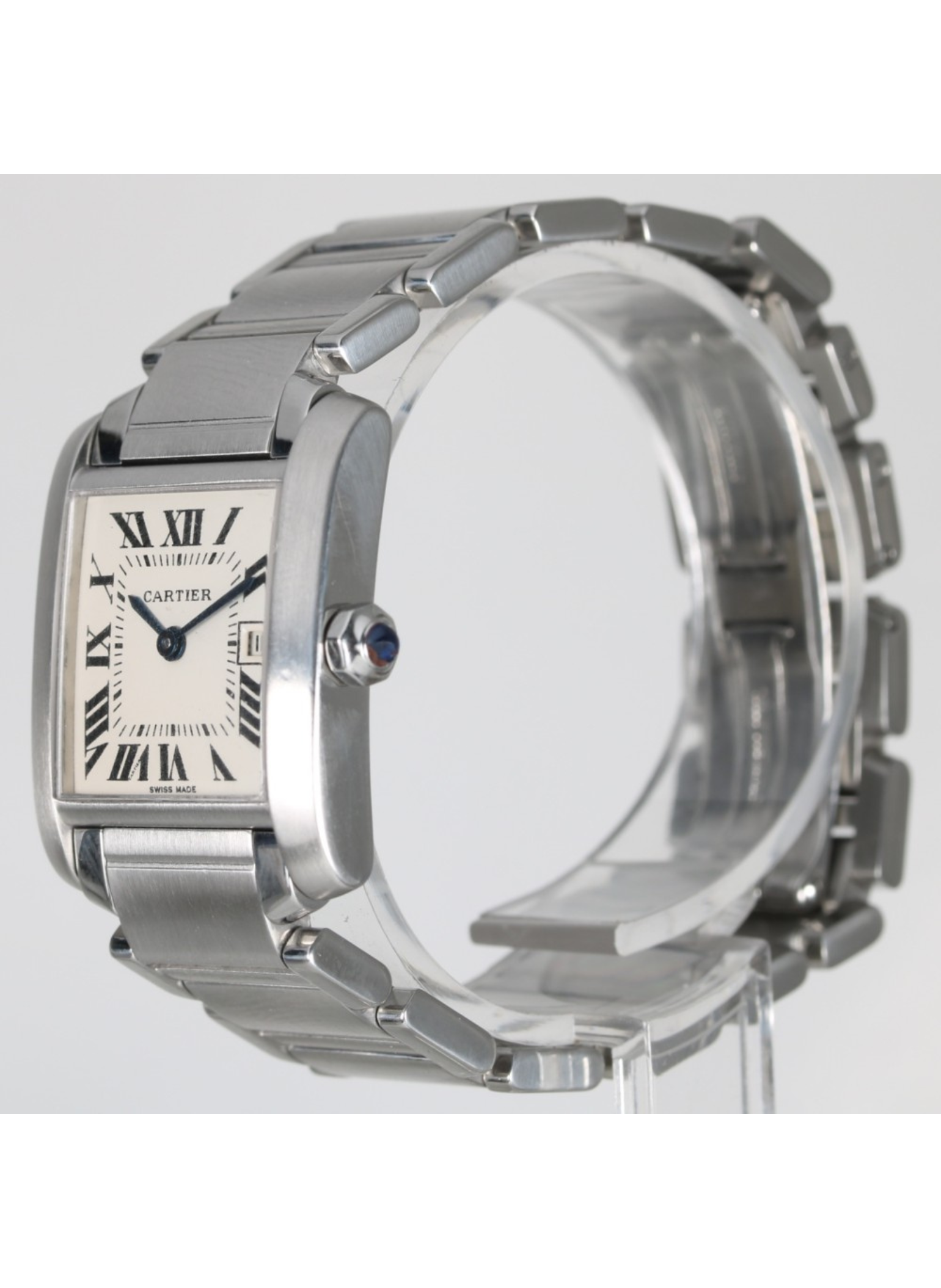 Cartier ref 2485 modelo Tank Francaise con caja en acero de 30X25mm con cristal de zafiro. Movimiento de cuarzo con función de fecha. Esfera blanca con números romanos y firma secreta Cartier a las siete. Brazalete de acero Cartier original. En buen estado.
