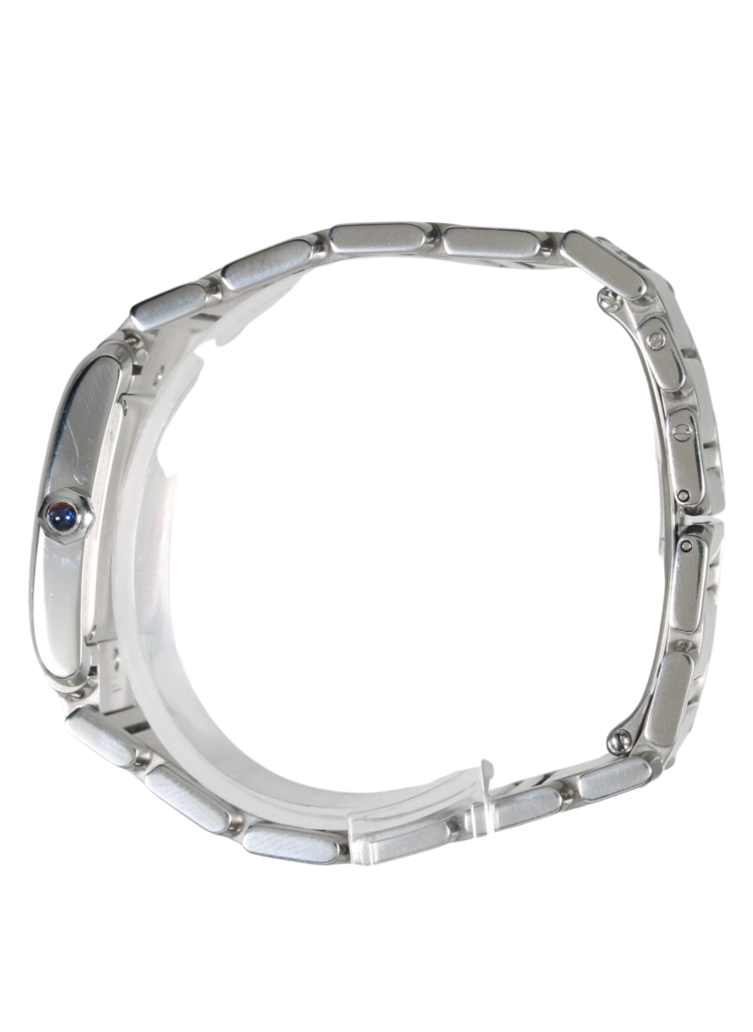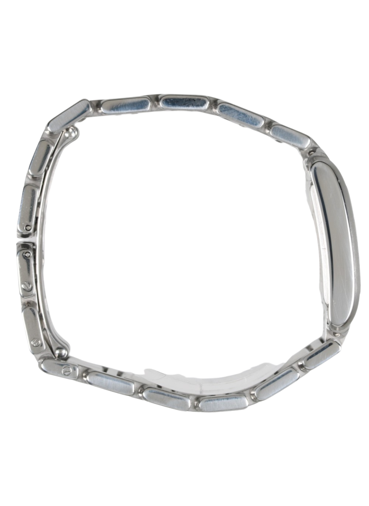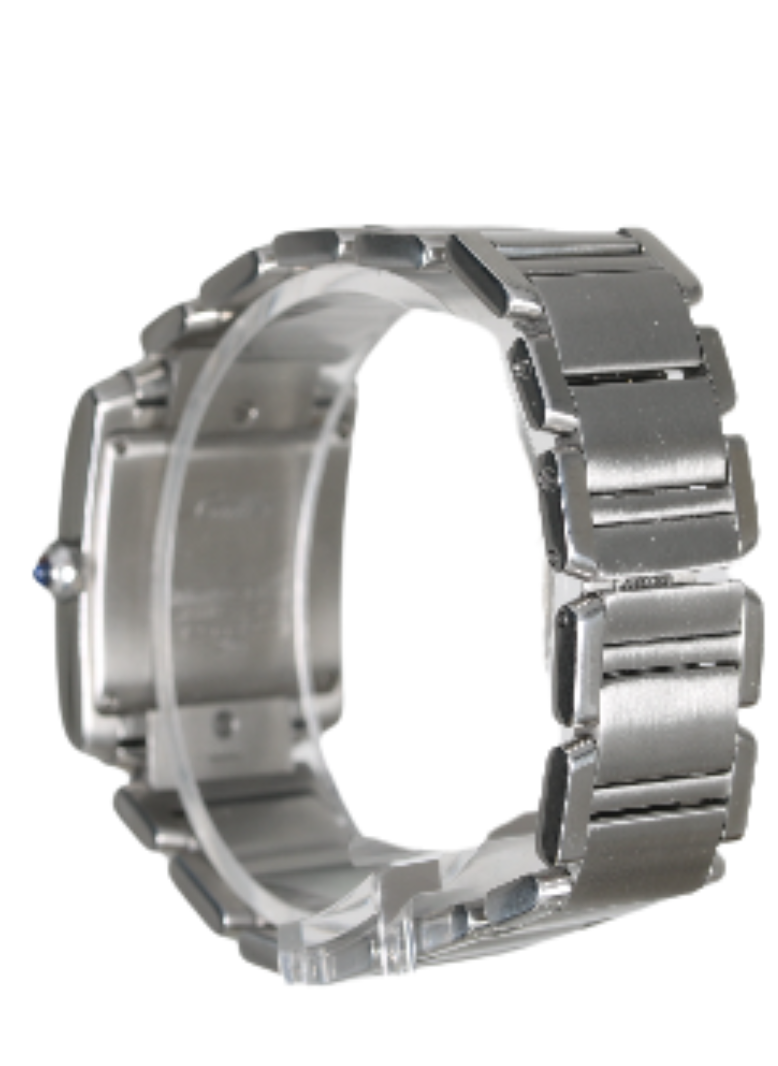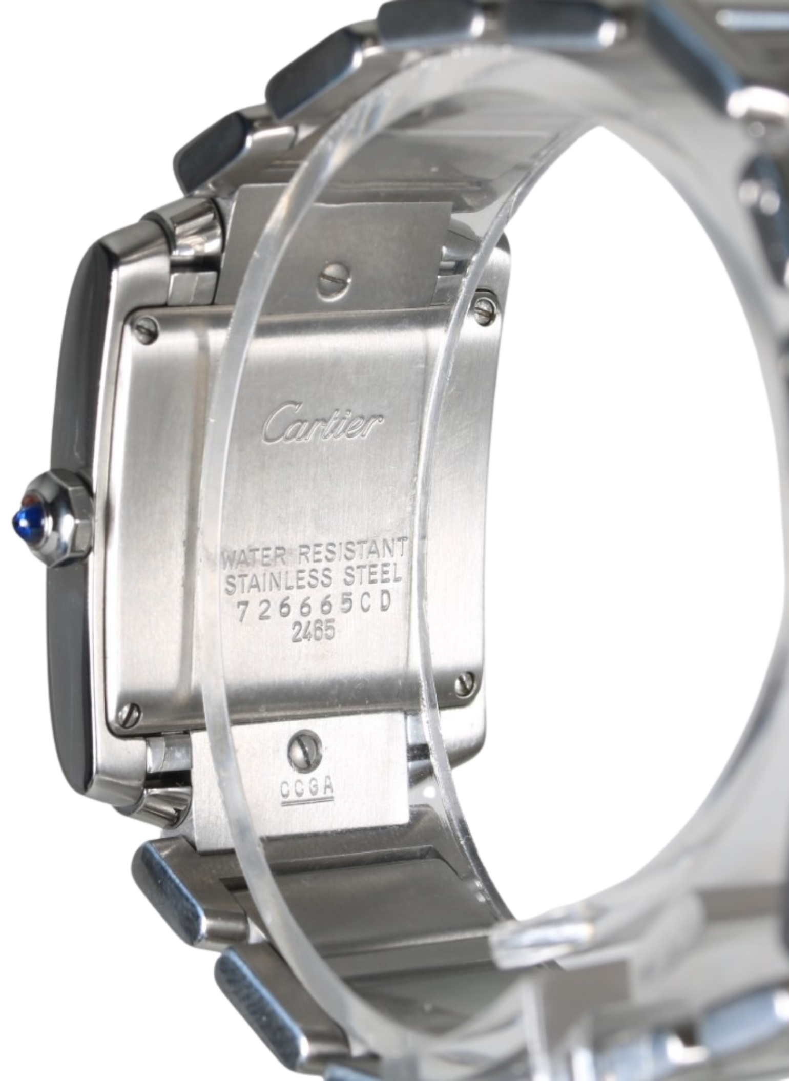 Cartier ref 2485 modelo Tank Francaise con caja en acero de 30X25mm con cristal de zafiro. Movimiento de cuarzo con función de fecha. Esfera blanca con números romanos y firma secreta Cartier a las siete. Brazalete de acero Cartier original. En buen estado.