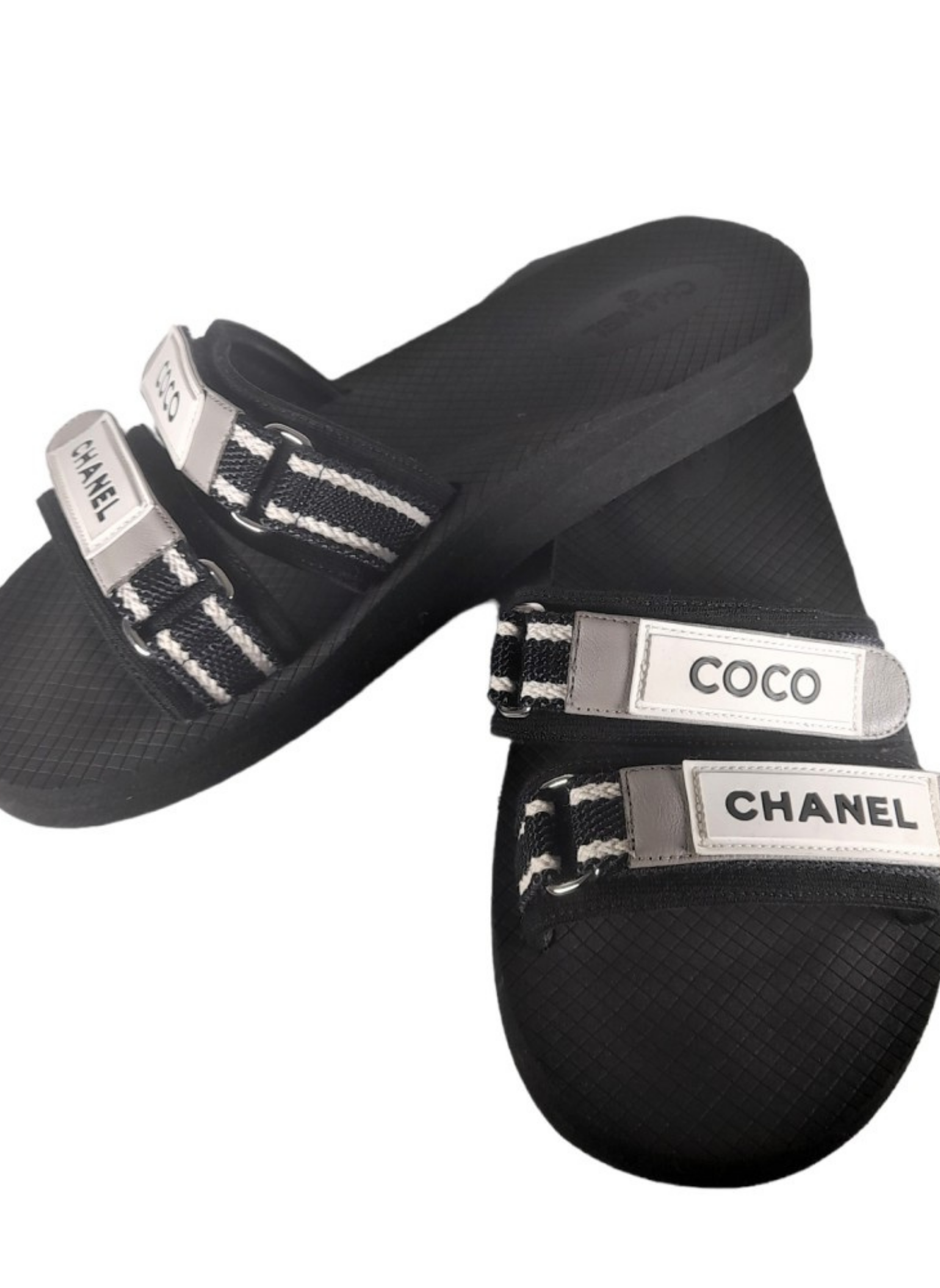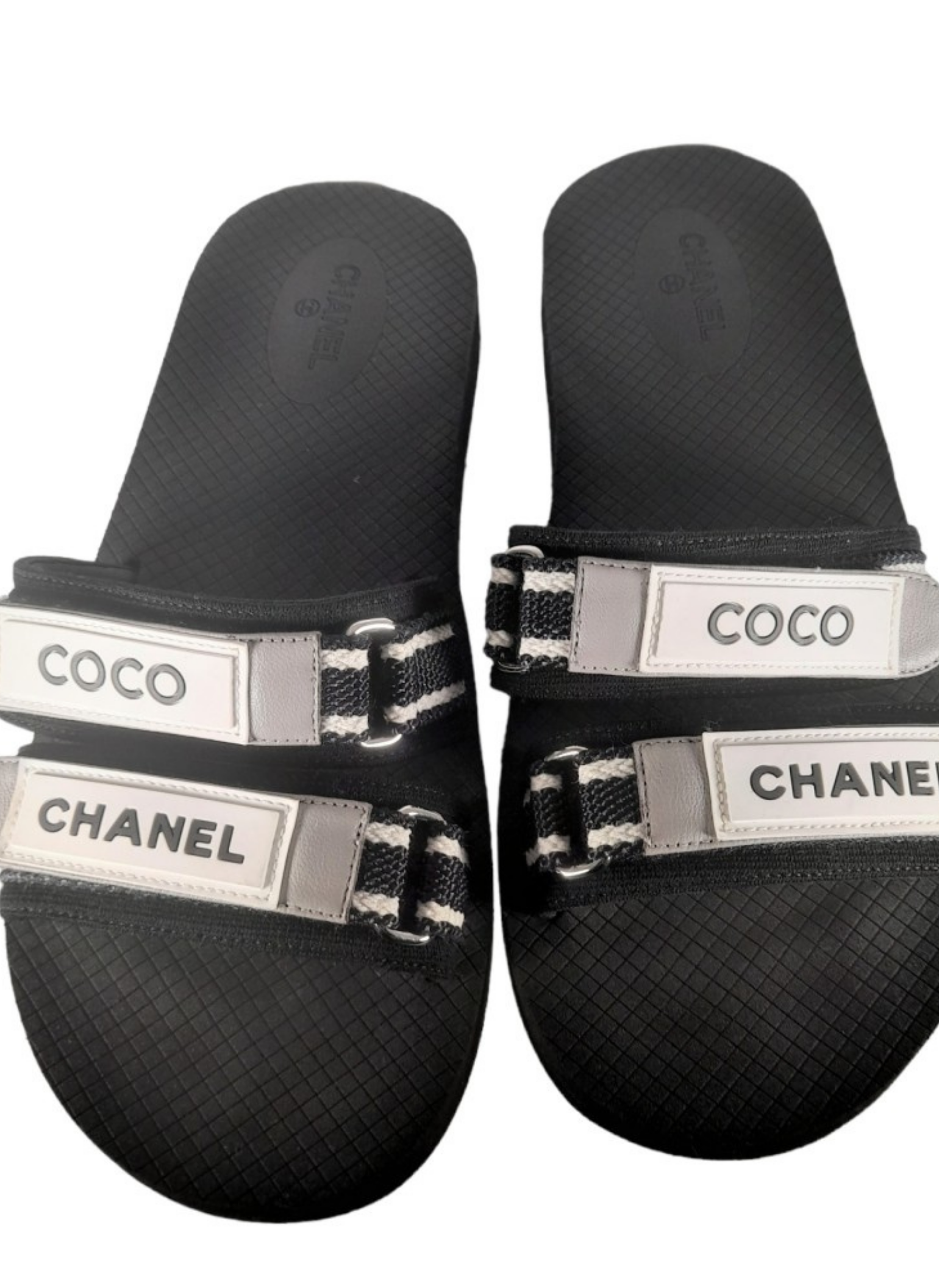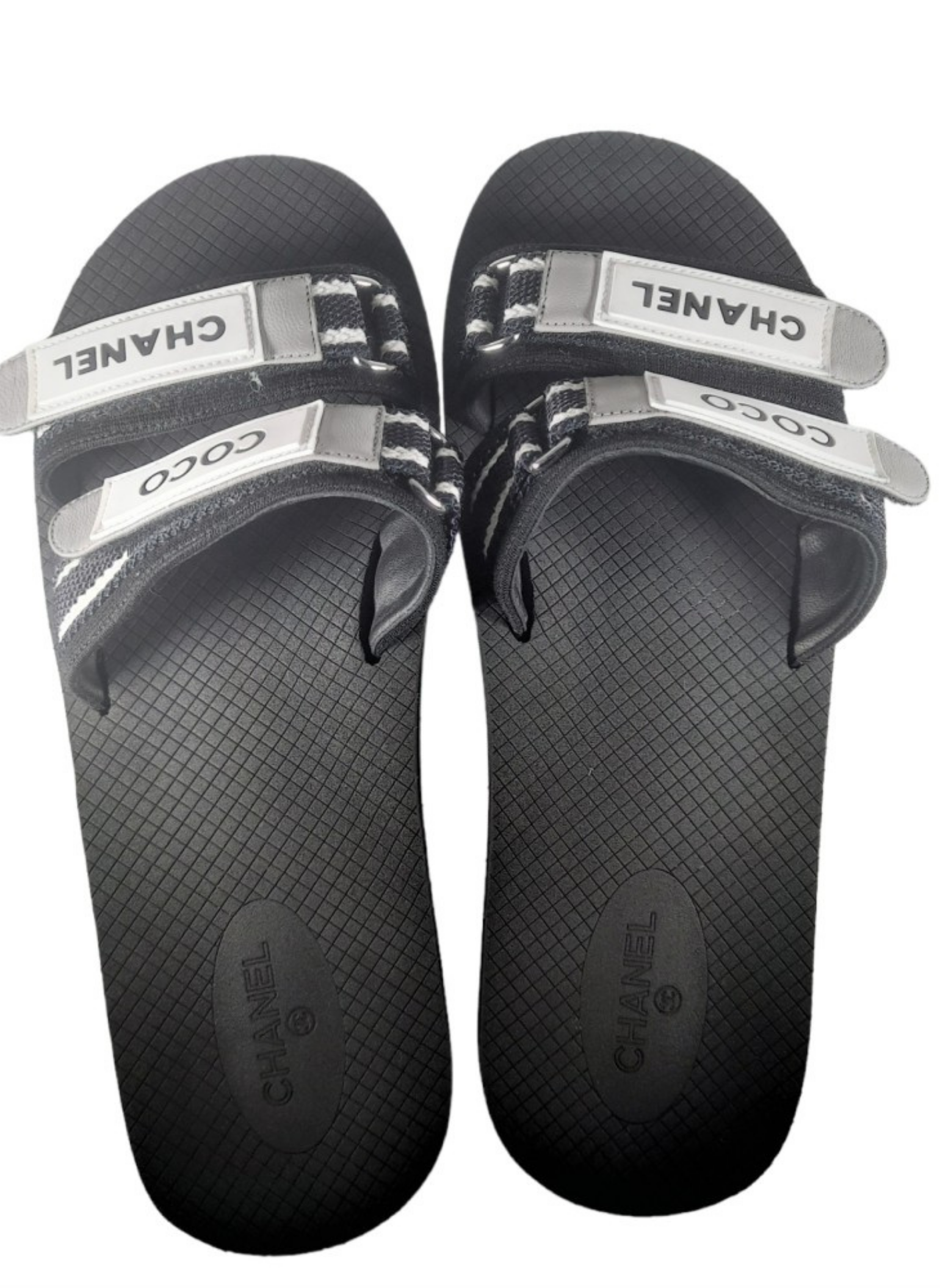 Sandalias de la marca Chanel unisex de caucho negro con dos tiras ajustables de velcro en blanco con COCO CHANEL escrito.Estas chanclas son un número 41. Estas chanclas no presentan ningún tipo de señal de uso.