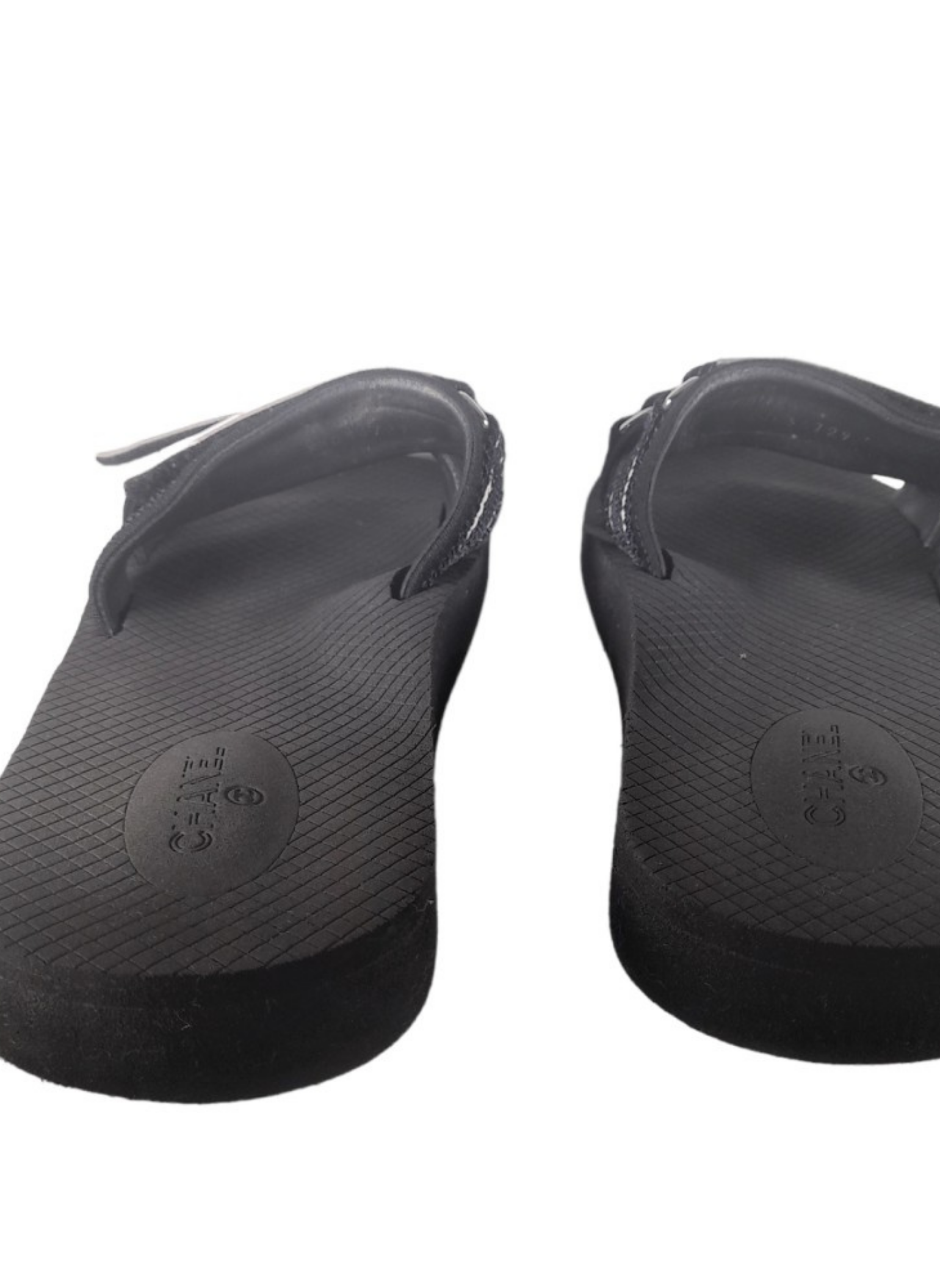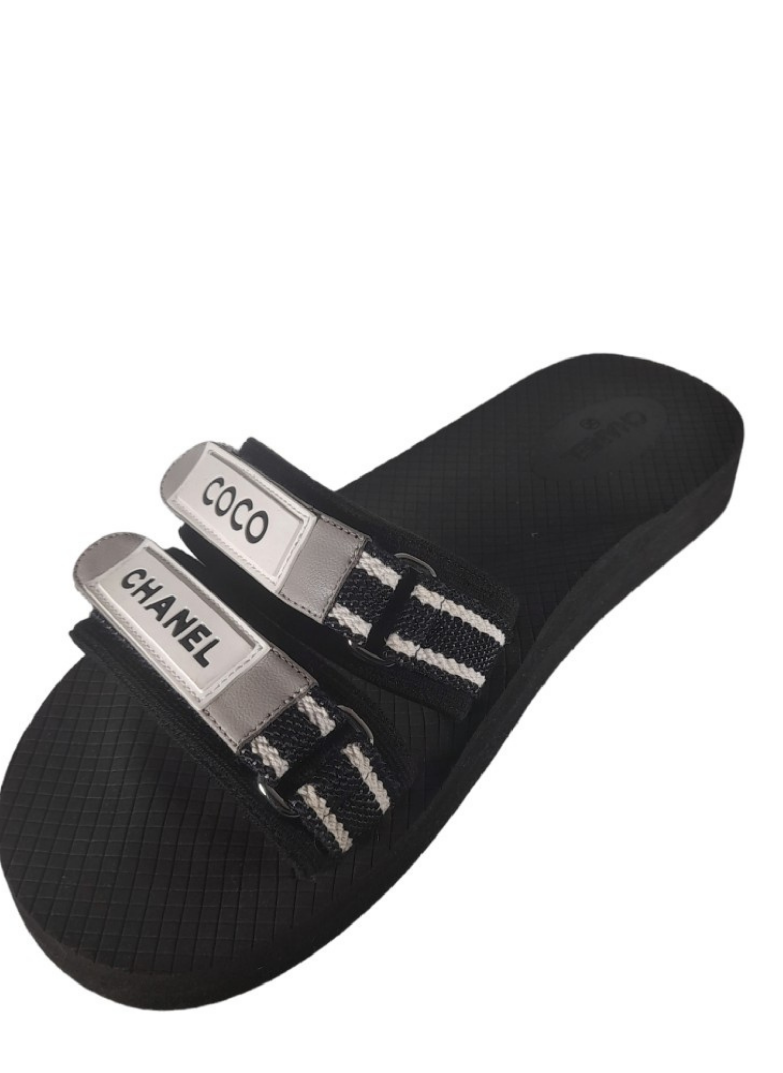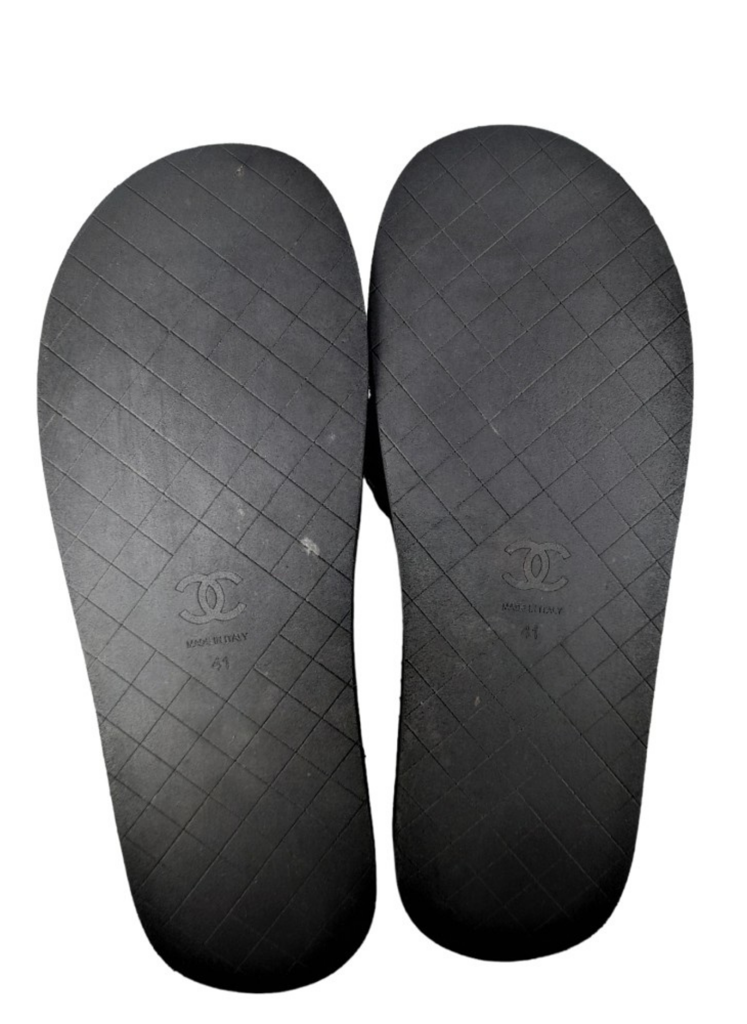 Sandalias de la marca Chanel unisex de caucho negro con dos tiras ajustables de velcro en blanco con COCO CHANEL escrito.Estas chanclas son un número 41. Estas chanclas no presentan ningún tipo de señal de uso.