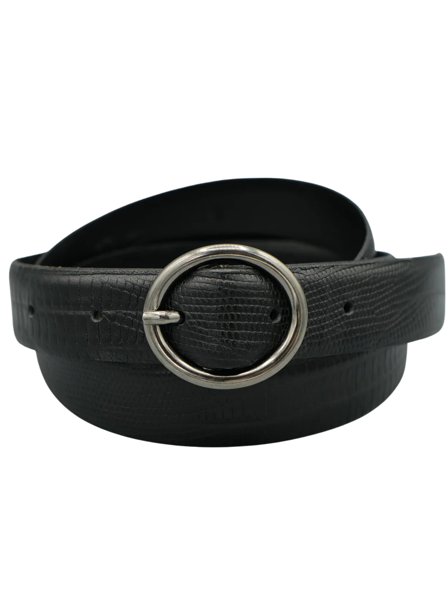 Made with lizard skin in a black tone. Lizard skin is known for its distinctive texture, giving the belt a distinctive touch.