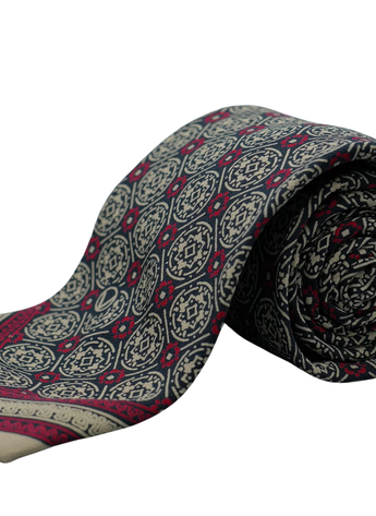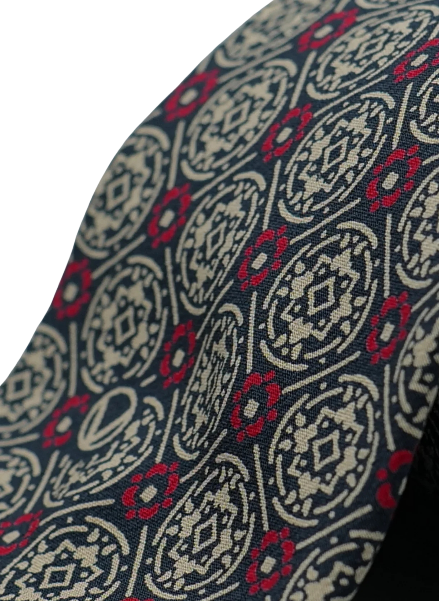 Gray tie from the Valentino brand. Made from 100% silk fabric, this tie not only offers incomparable quality, but also style and distinction. The circle and red flower designs add a touch of sophistication and originality to your outfit. Whether for a business meeting or a special event, this tie is the perfect choice for the man who likes quality and fashion.