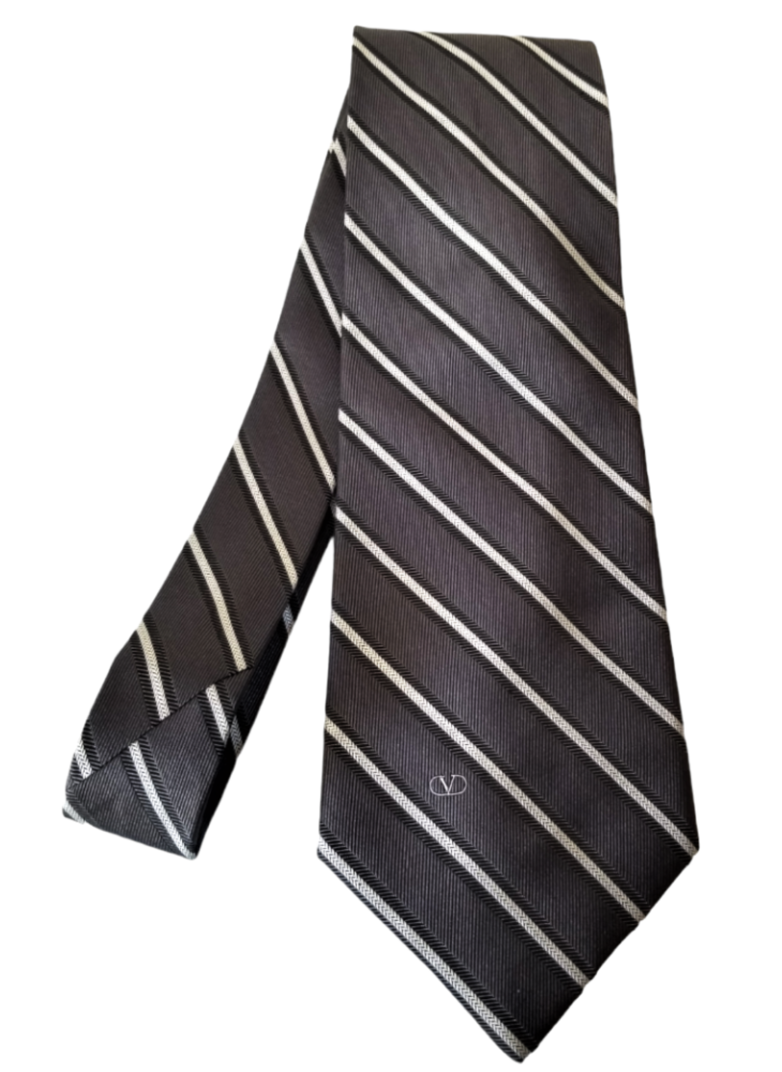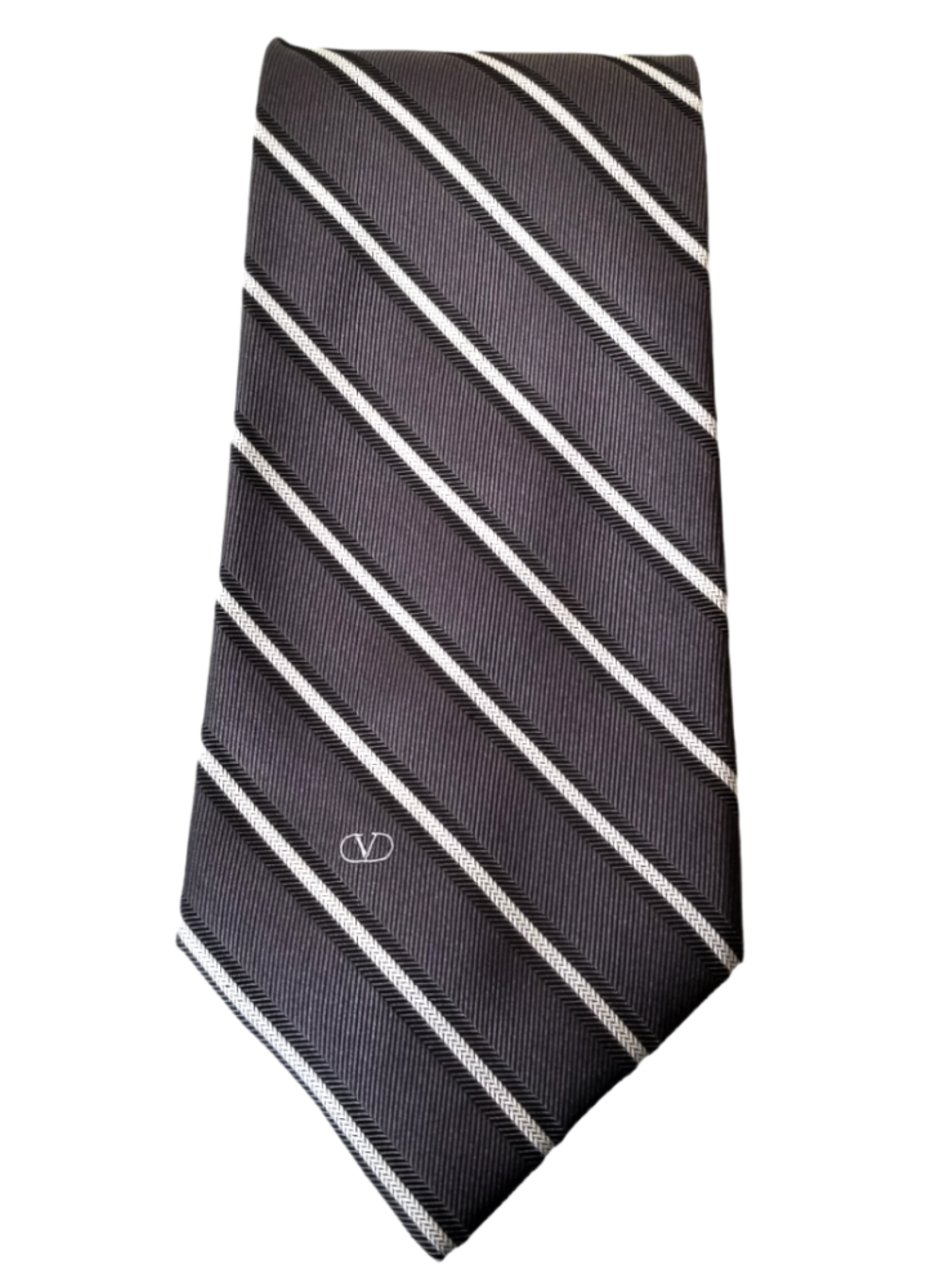 Valentino black tie with white stripes, a piece that combines style in every detail. Made from 100% silk, this tie is a symbol of quality. Classic white stripes on a black background add a touch of class and timeless style to any outfit. Whether you're getting ready for an important business meeting or a special occasion, this tie will become your must-have accessory.