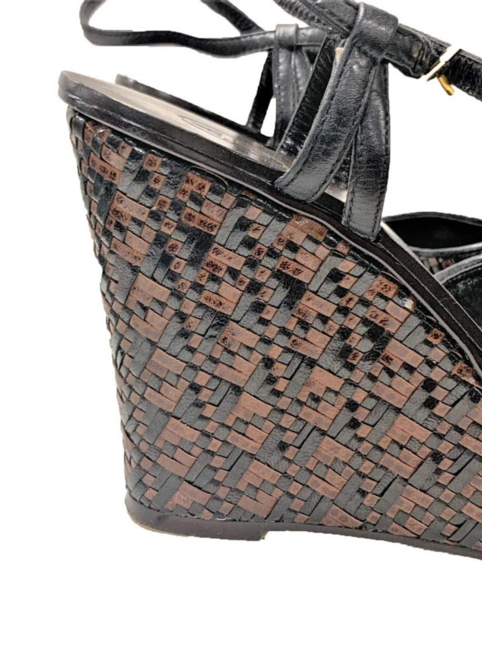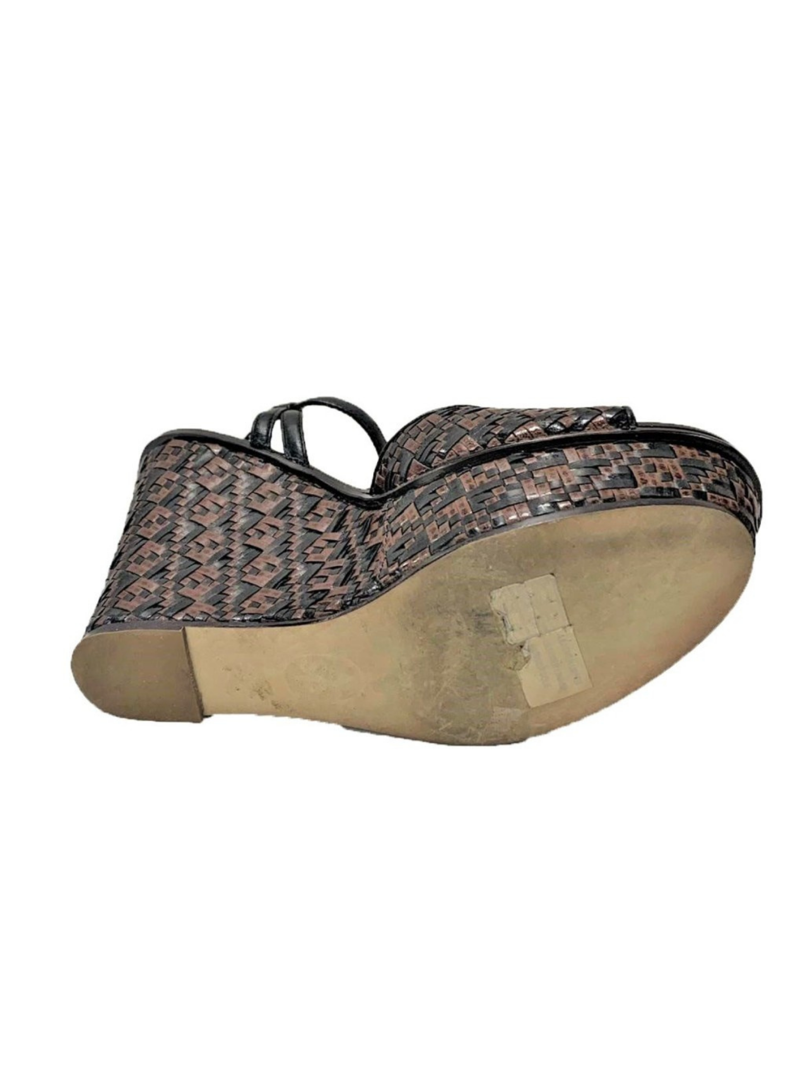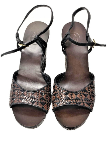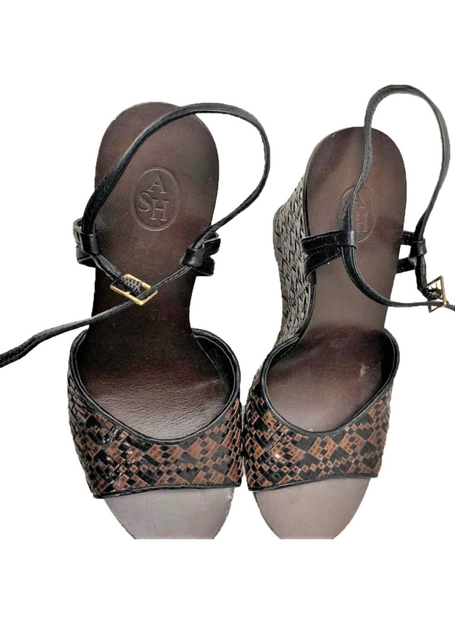 Cuñas de piel de color marrón y negras de la marca Ash. Contiene unas tiras entrelazadas que crean un estampado simétrico. Es una talla 40. Estas cuñas no presentan señales de uso.