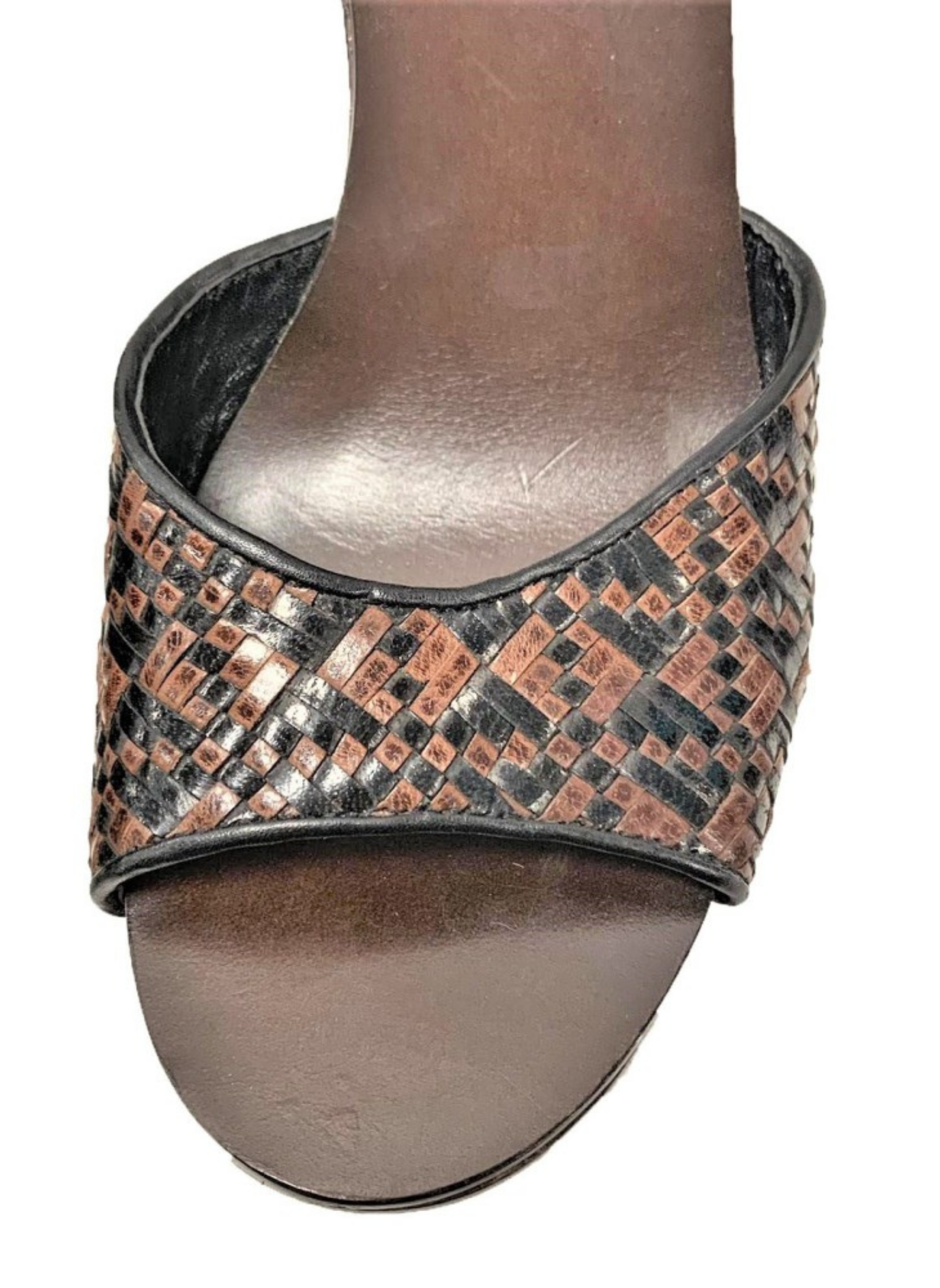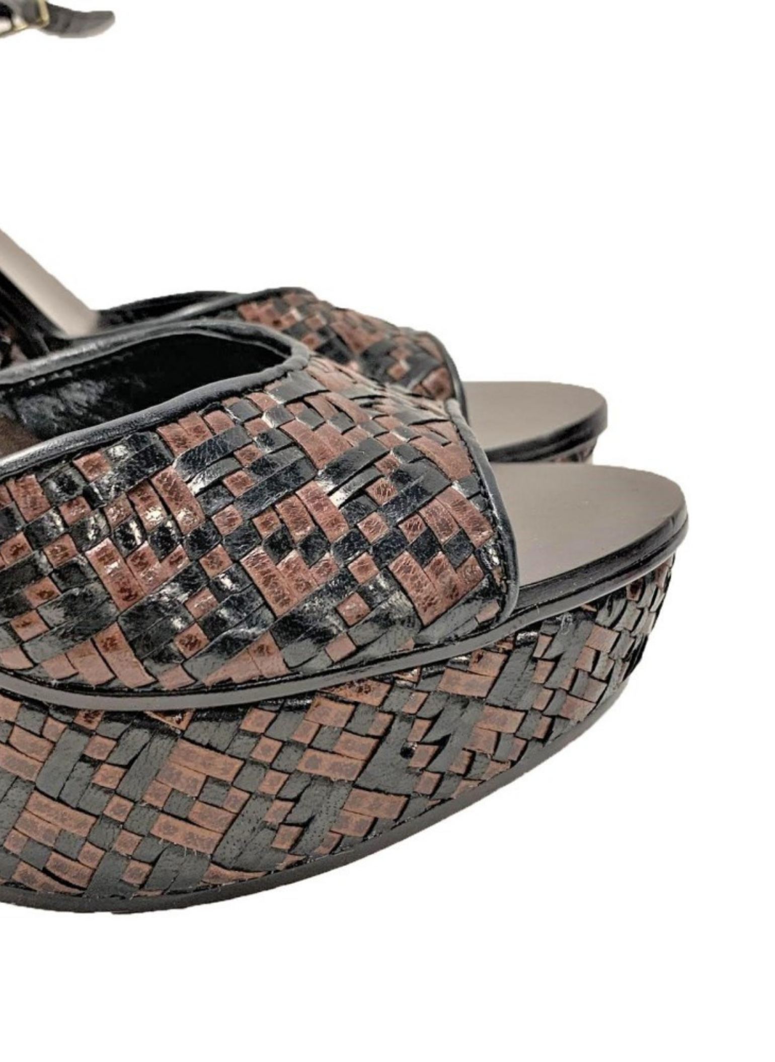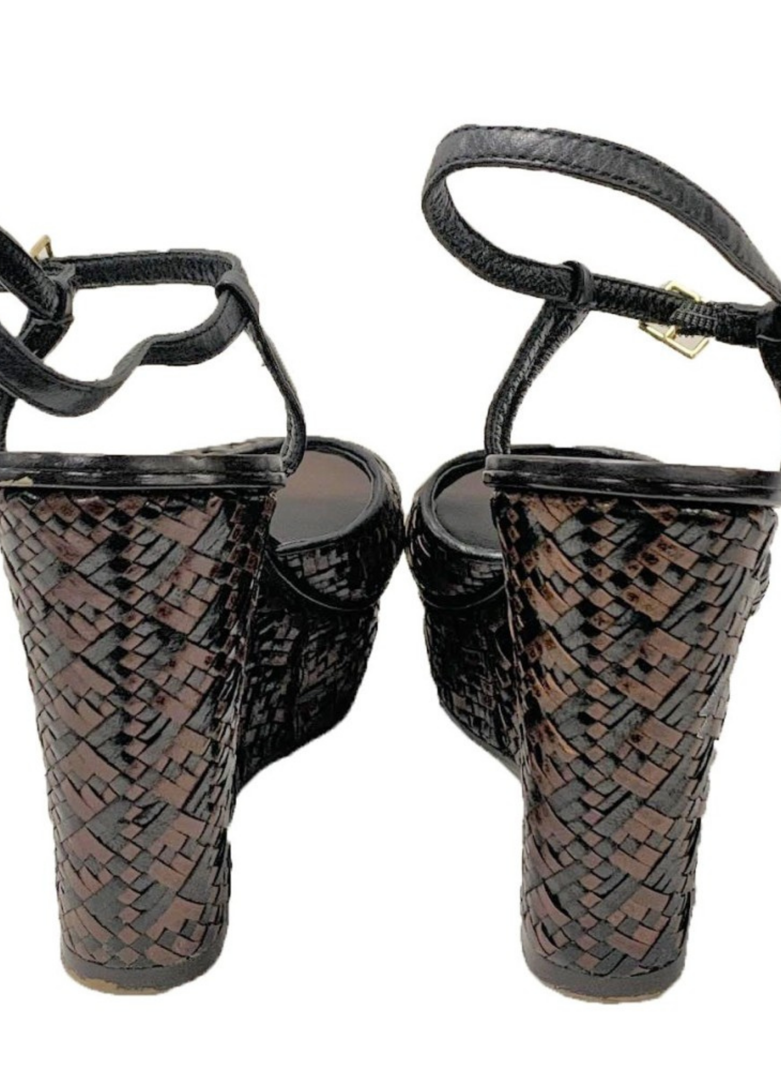 Cuñas de piel de color marrón y negras de la marca Ash. Contiene unas tiras entrelazadas que crean un estampado simétrico. Es una talla 40. Estas cuñas no presentan señales de uso.