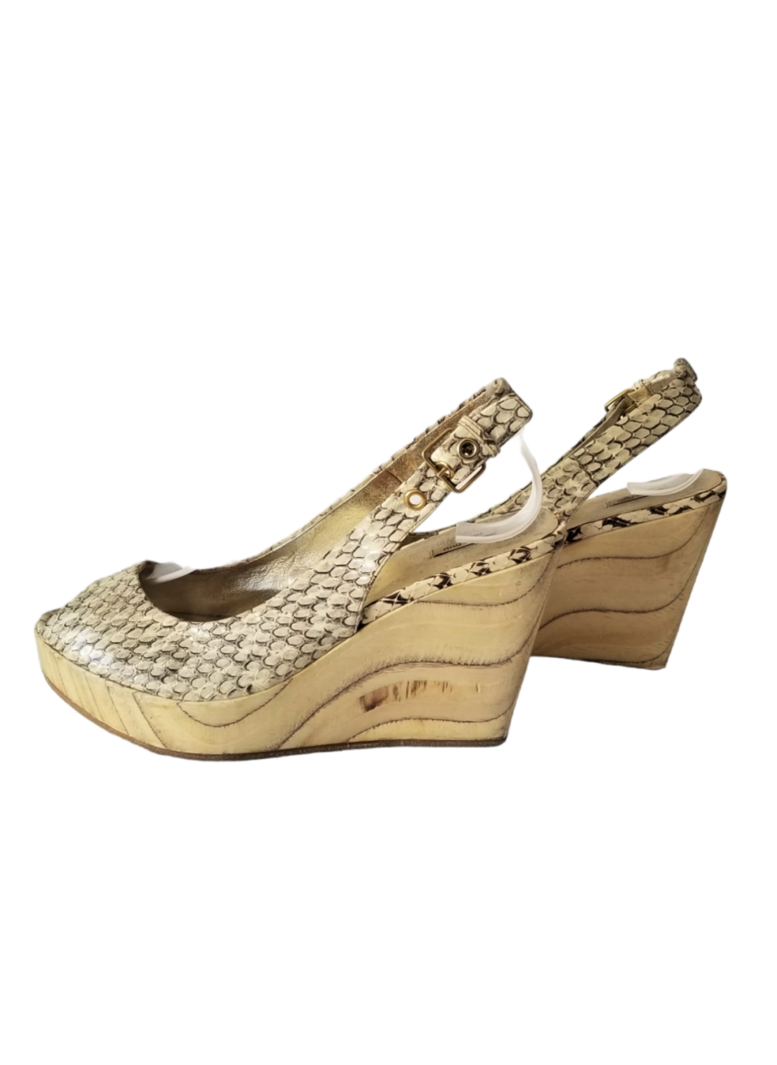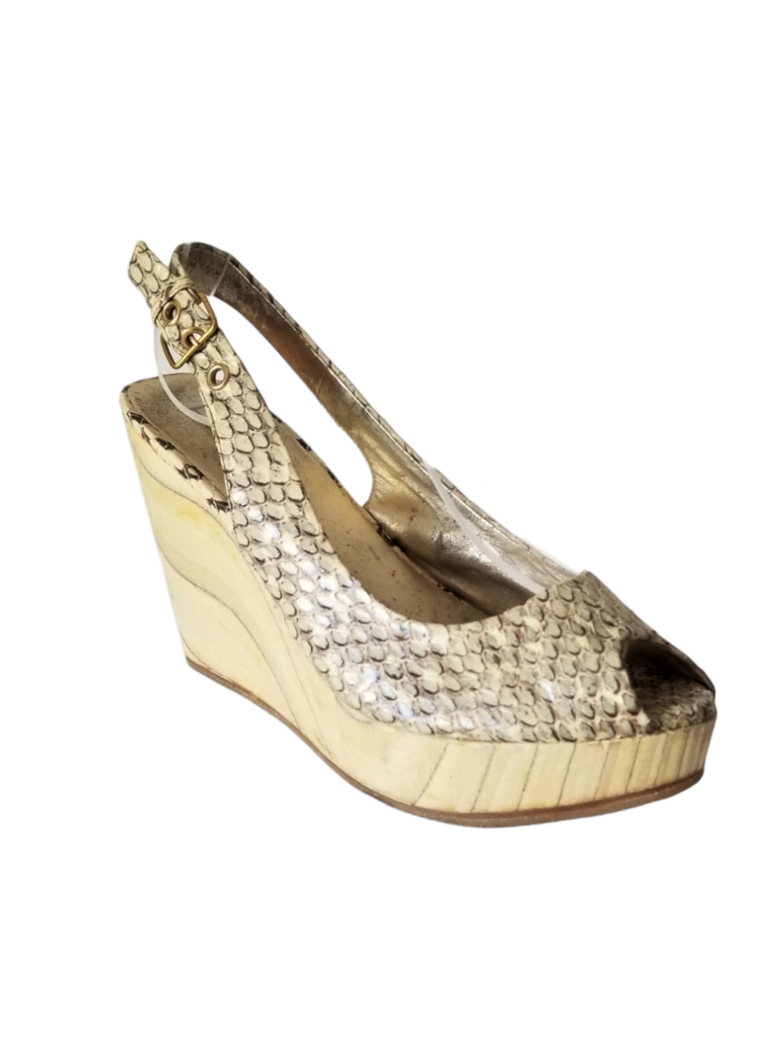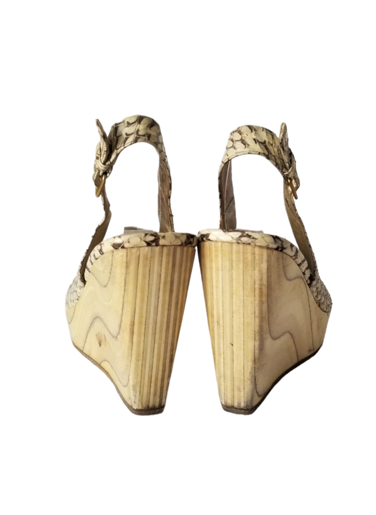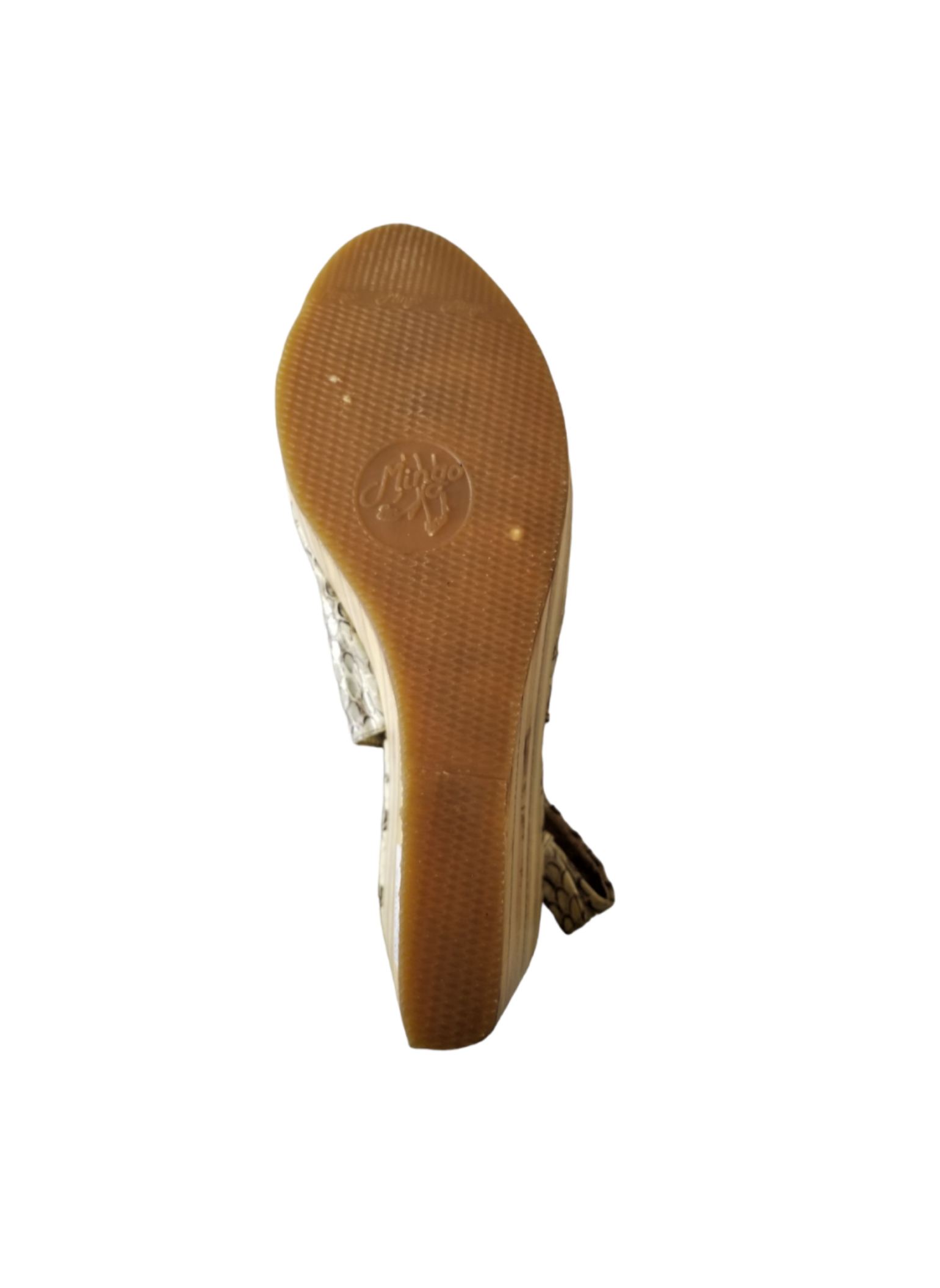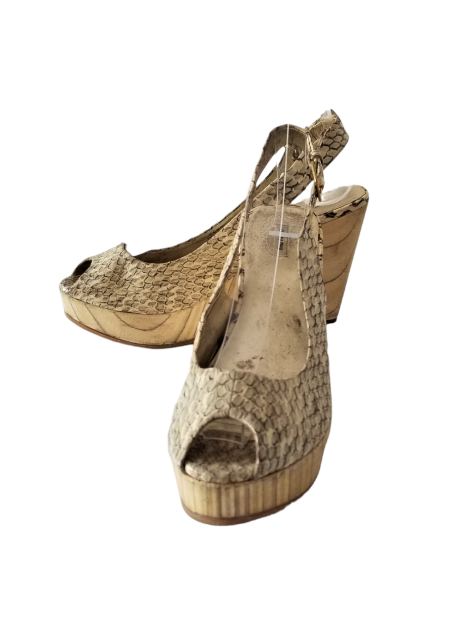The unique design of the wooden wedges not only provides a solid and stable base, but also adds a touch of charm to your outfit. The distinctive python skin pattern adds an element of texture and sophistication, creating a fascinating contrast.