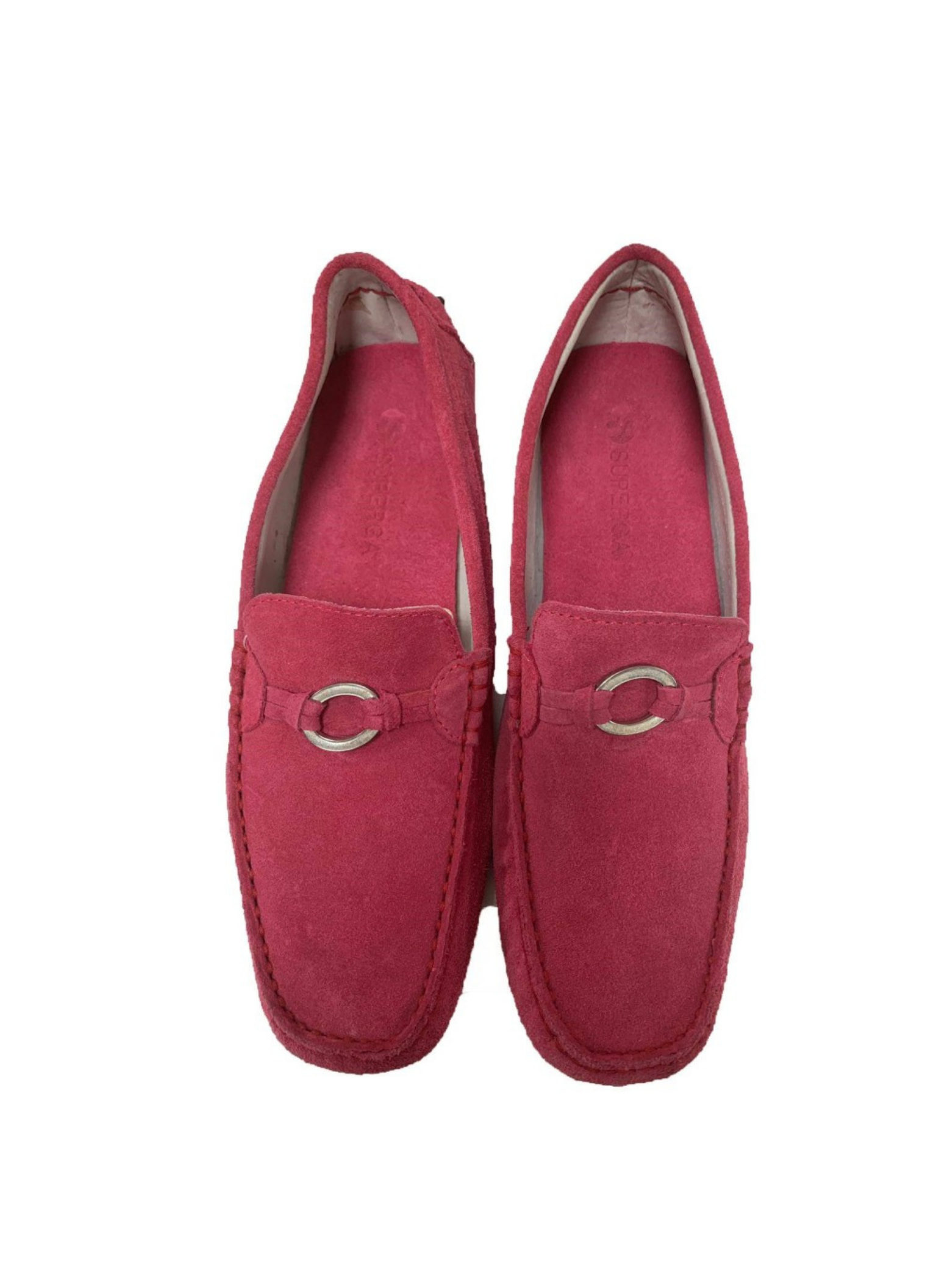 Mocasines de la marca Superga de ante rosa estilo driving shoes. Contienen detalle de arandela plateada en el centro. Son una talla 41. Estos mocasines no presentan ningún tipo de señal de uso.