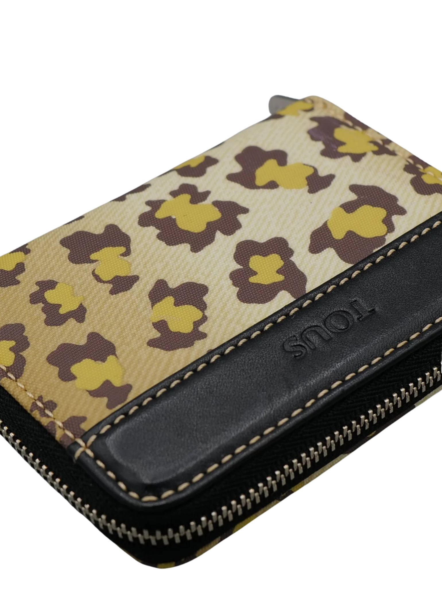 Monedero o cartera de Tous,de lona animal print y cuero marron.Interior  de tela verde,con varios departamentos y bolsillo con cremallera.