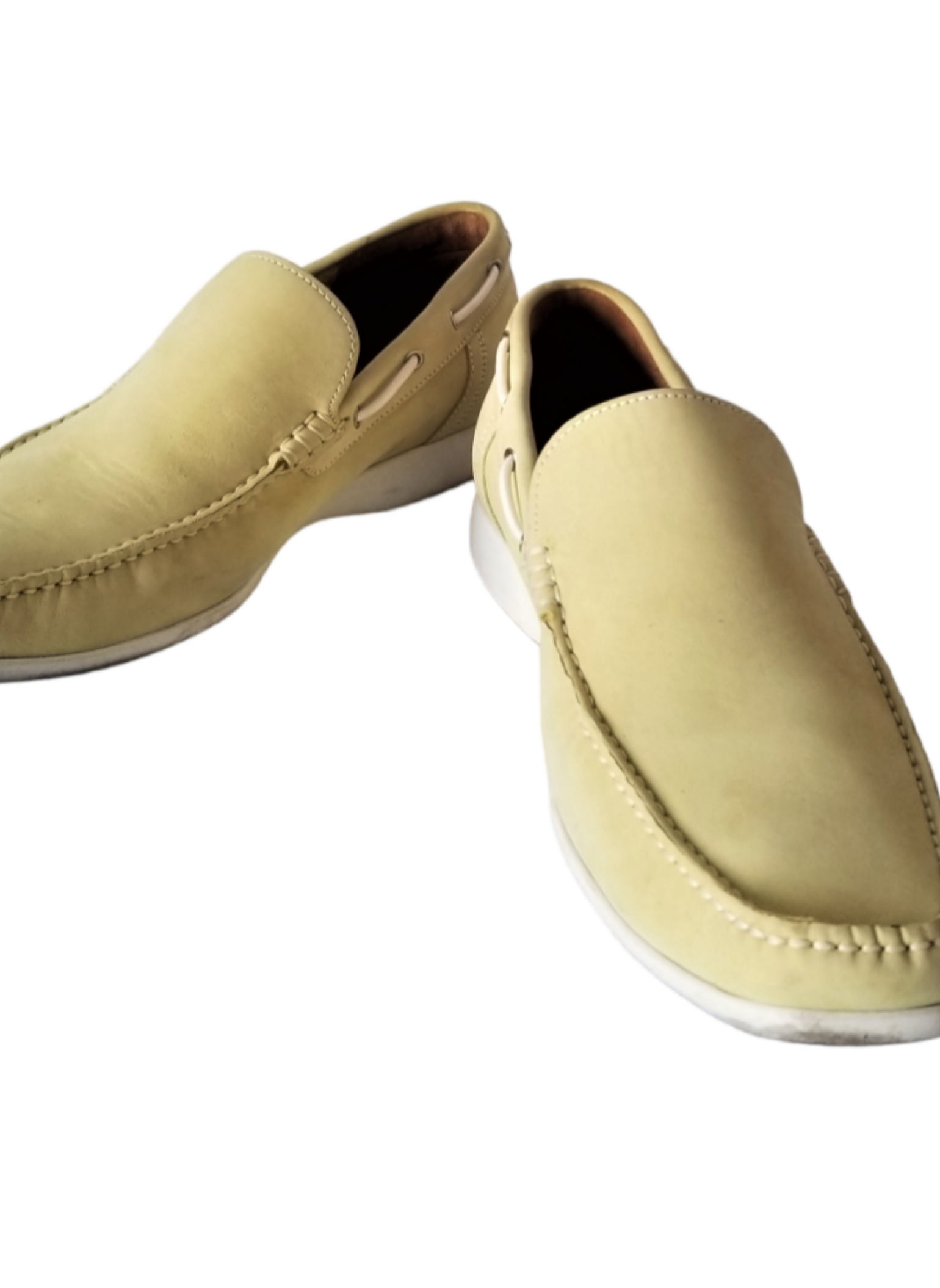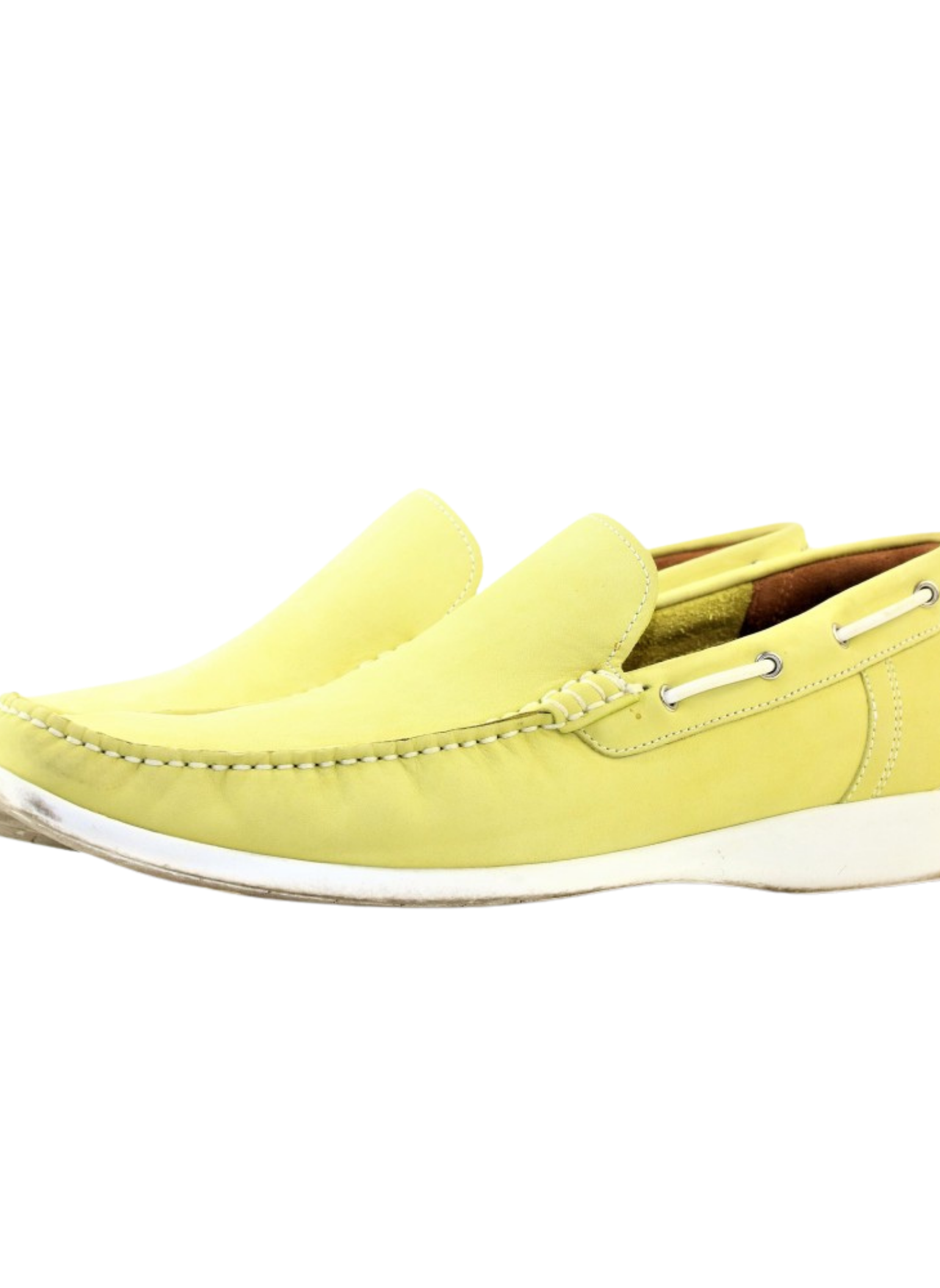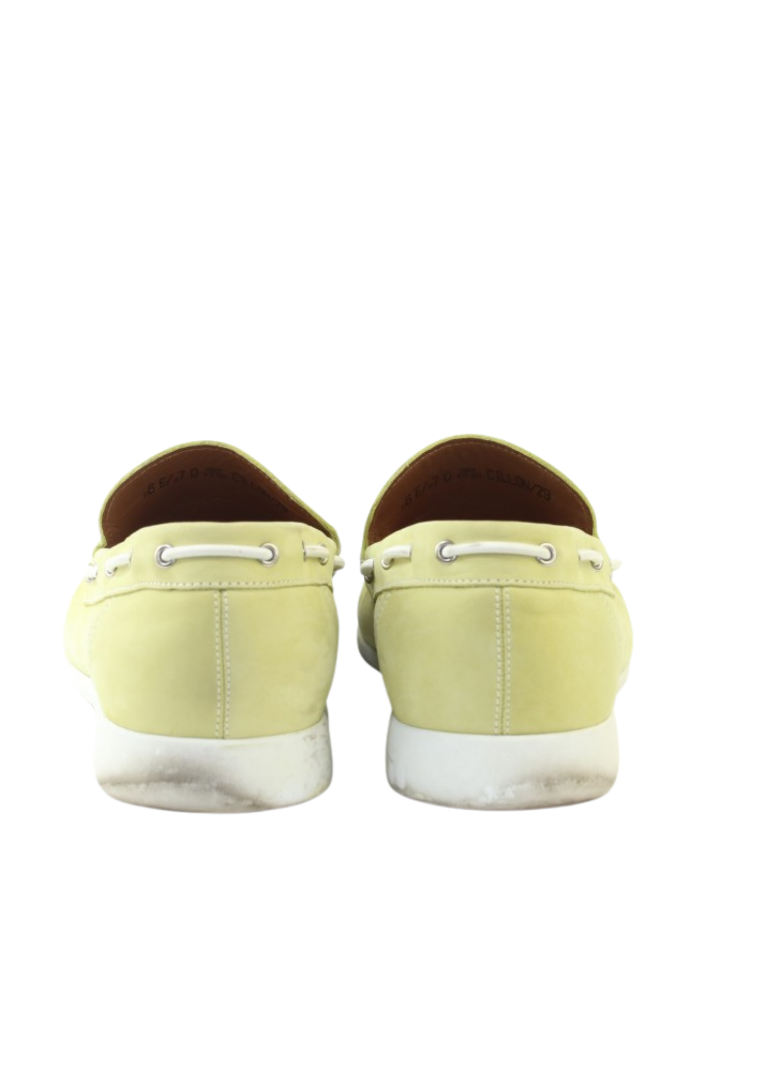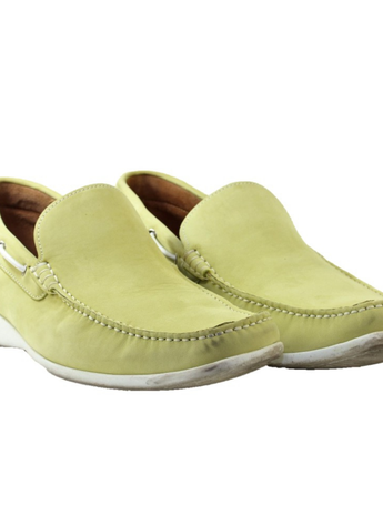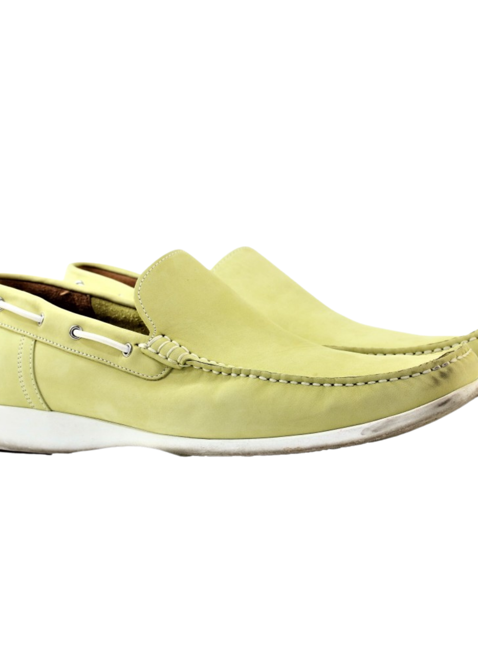 Zapatos de la marca Bally Cineas 22 de caballero estilo naúticos de nubuk y goma en color ácido (verde-amarillo) claro, con suela de goma en blanco, la suela tiene uso pero se encuentran en muy buen estado. Suela de 2 cm y talla 40.