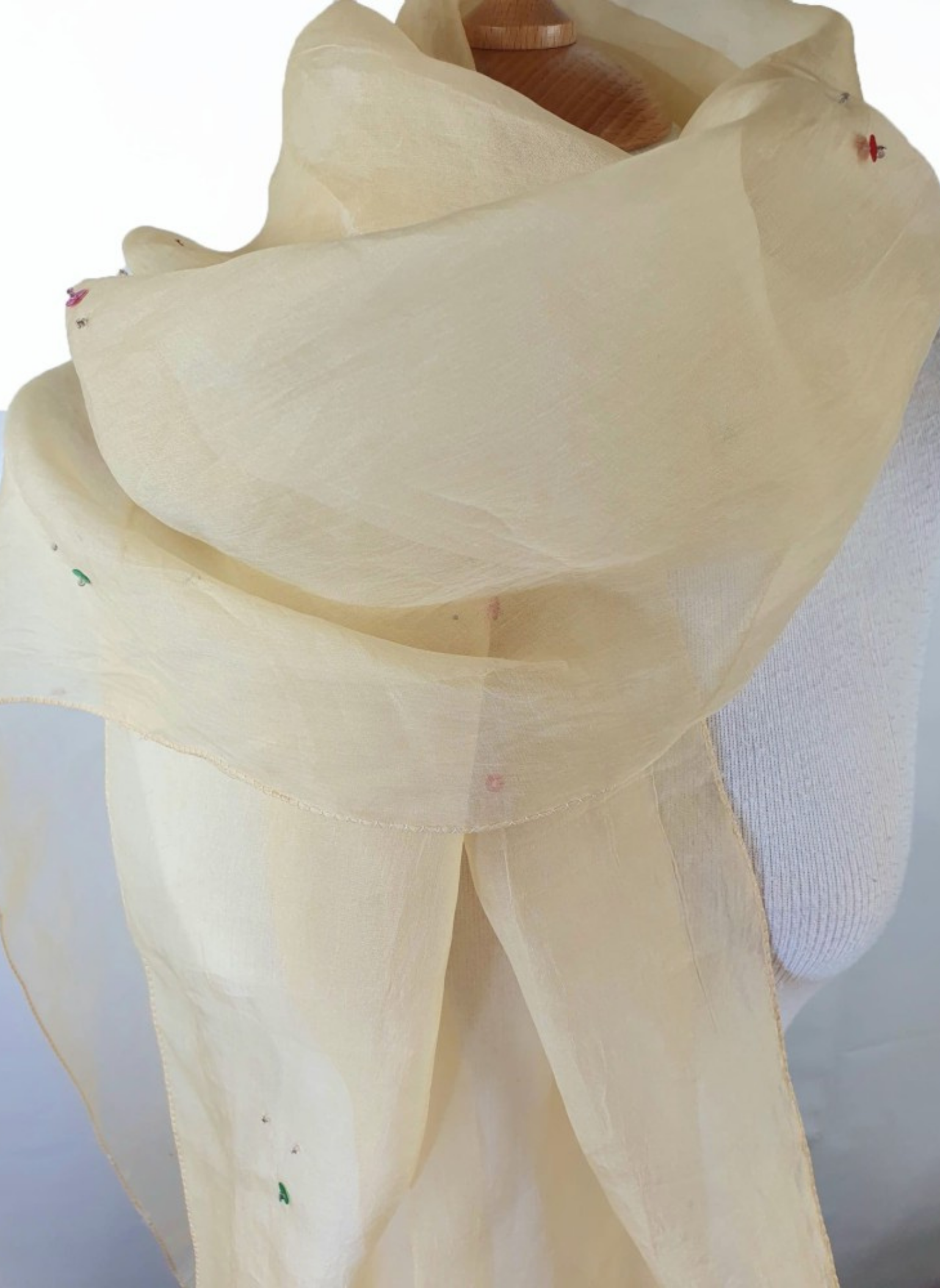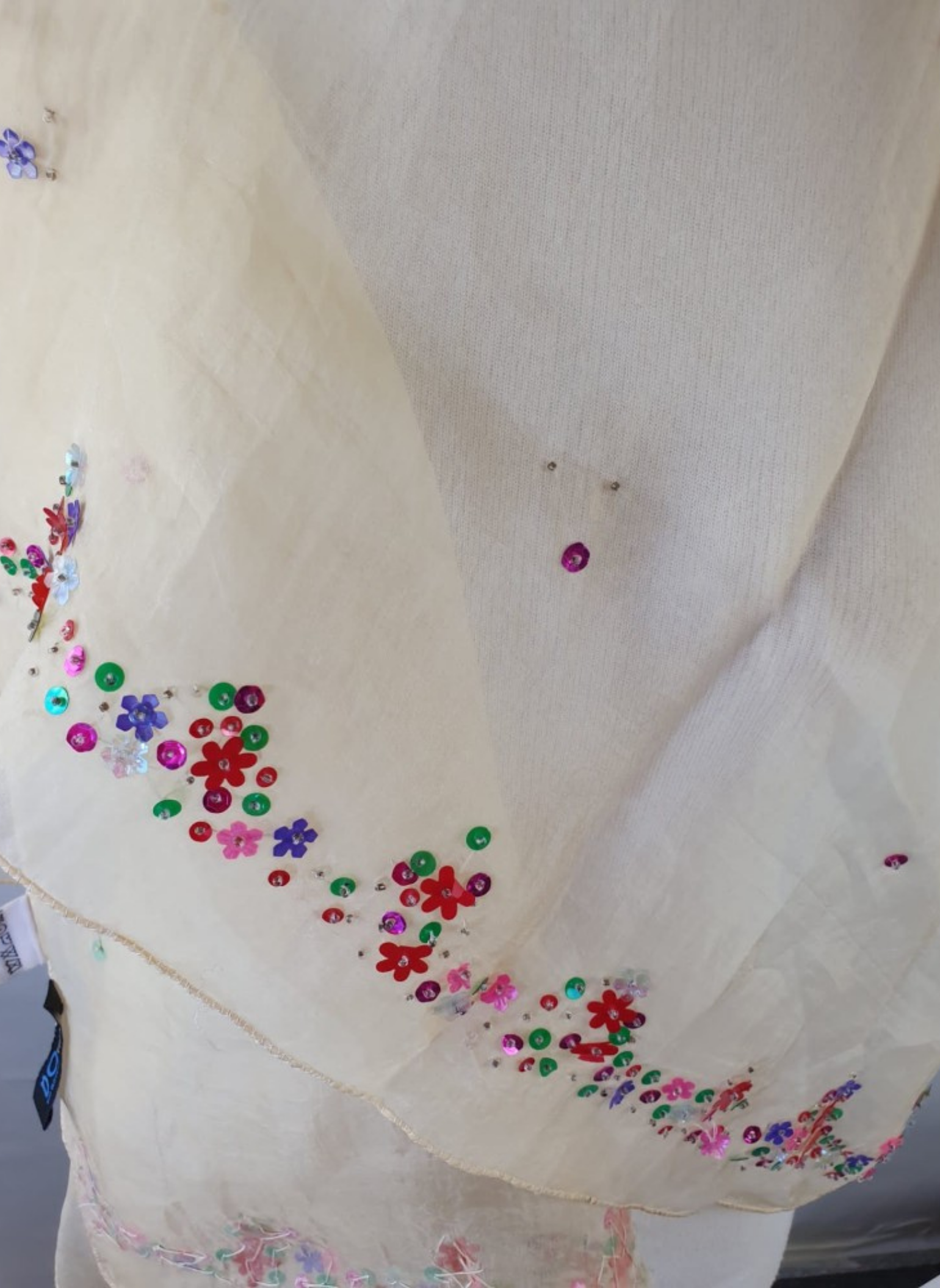 Add a touch of charm to your style with this scarf from Don Algodòn Trends. Made of beige silk, this accessory exudes subtle elegance. Colorful sequins like delicate little flowers add a touch of sparkle and joy, elevating any outfit with a touch of glamour. Its undamaged condition ensures that every time you use it, you are enveloped in a feeling of luxury and style. Whether for a special occasion or for everyday wear, this scarf is the perfect accessory to highlight your personal elegance.