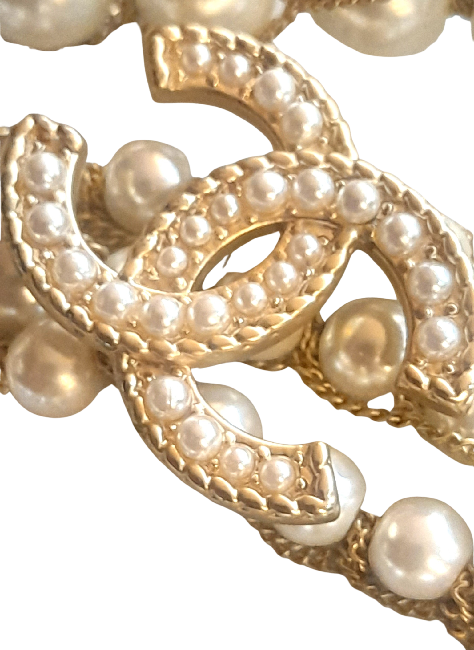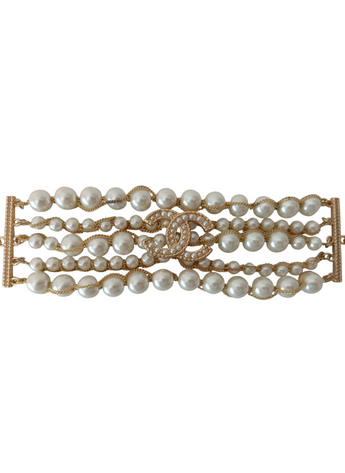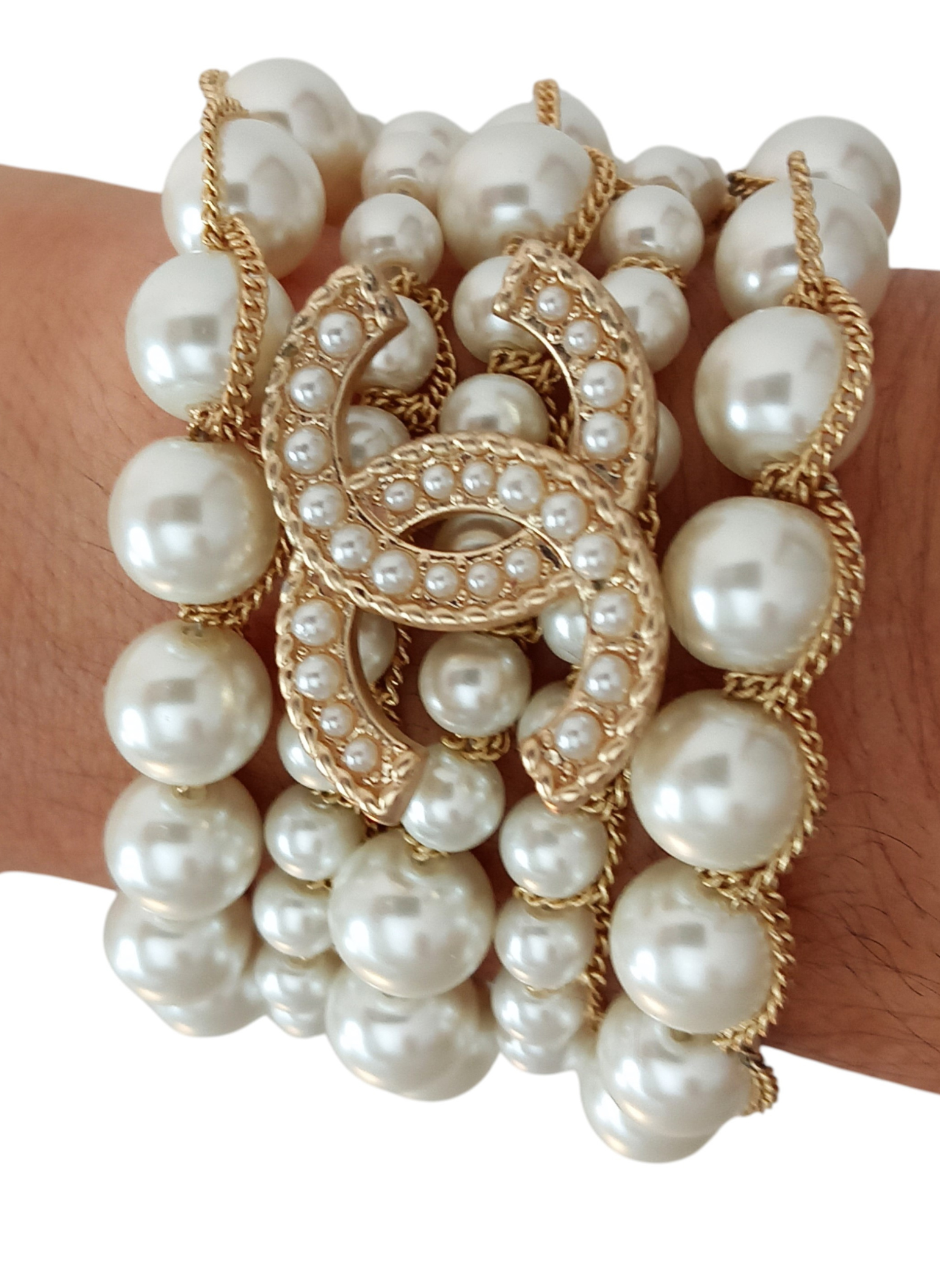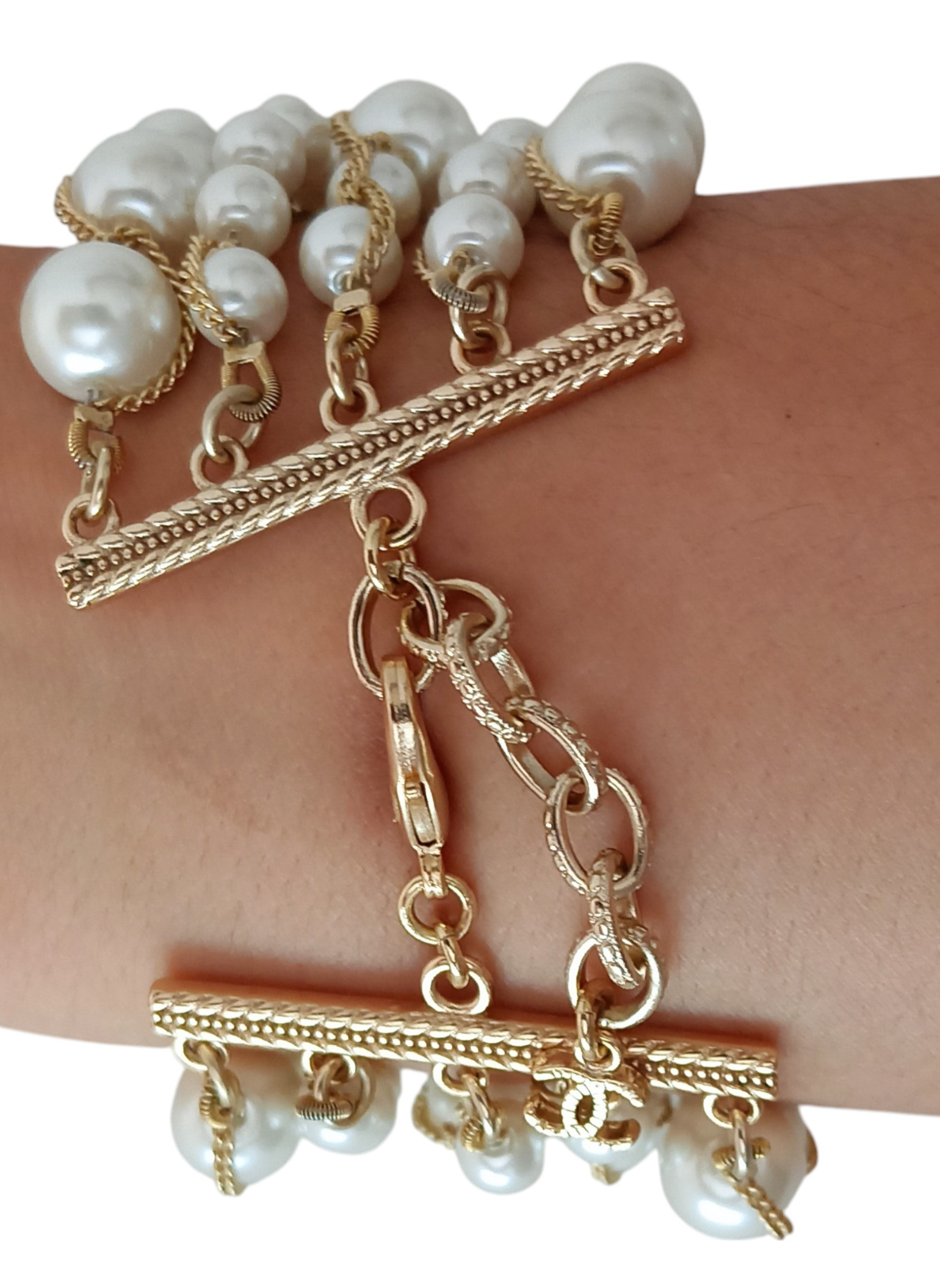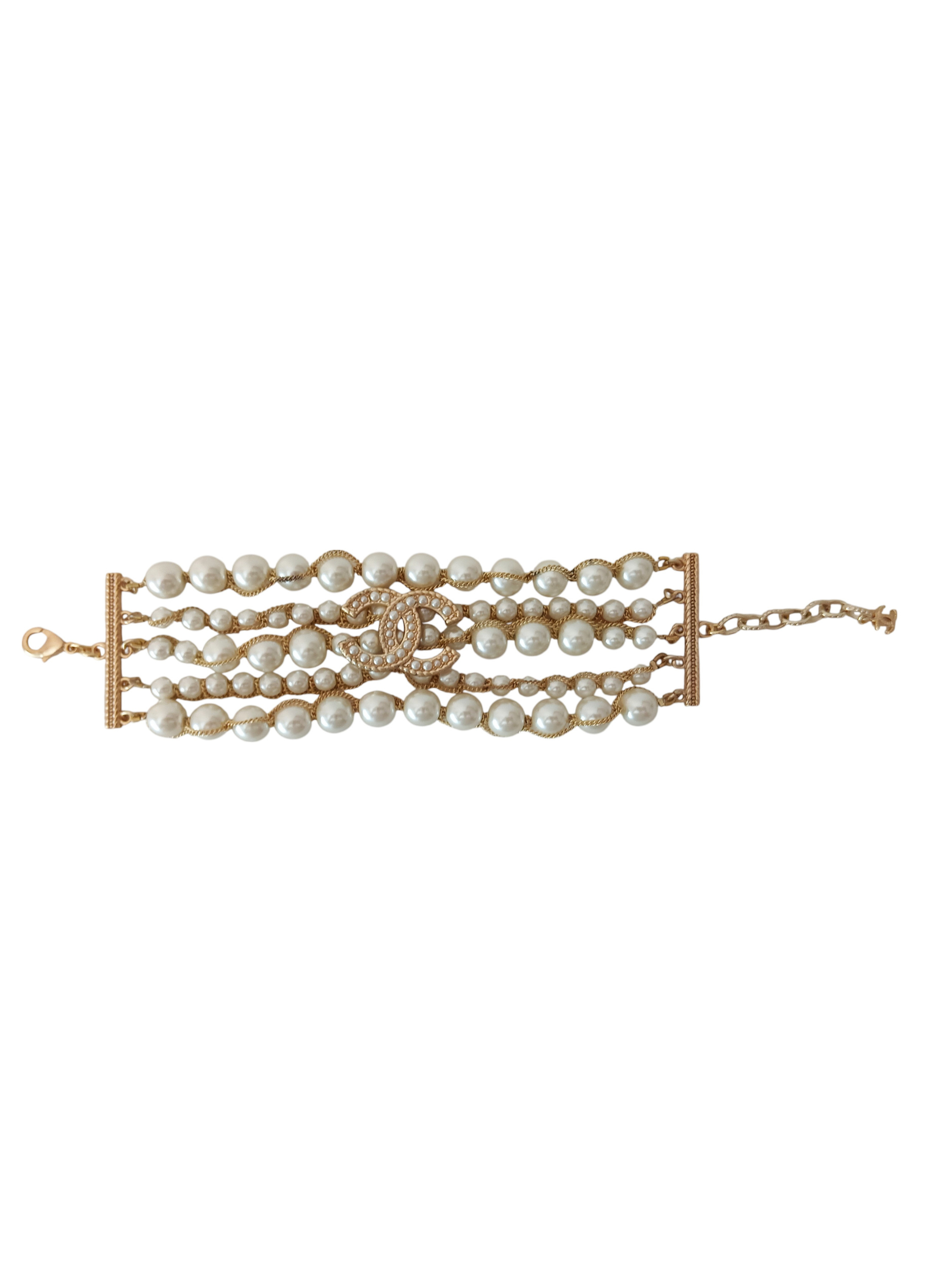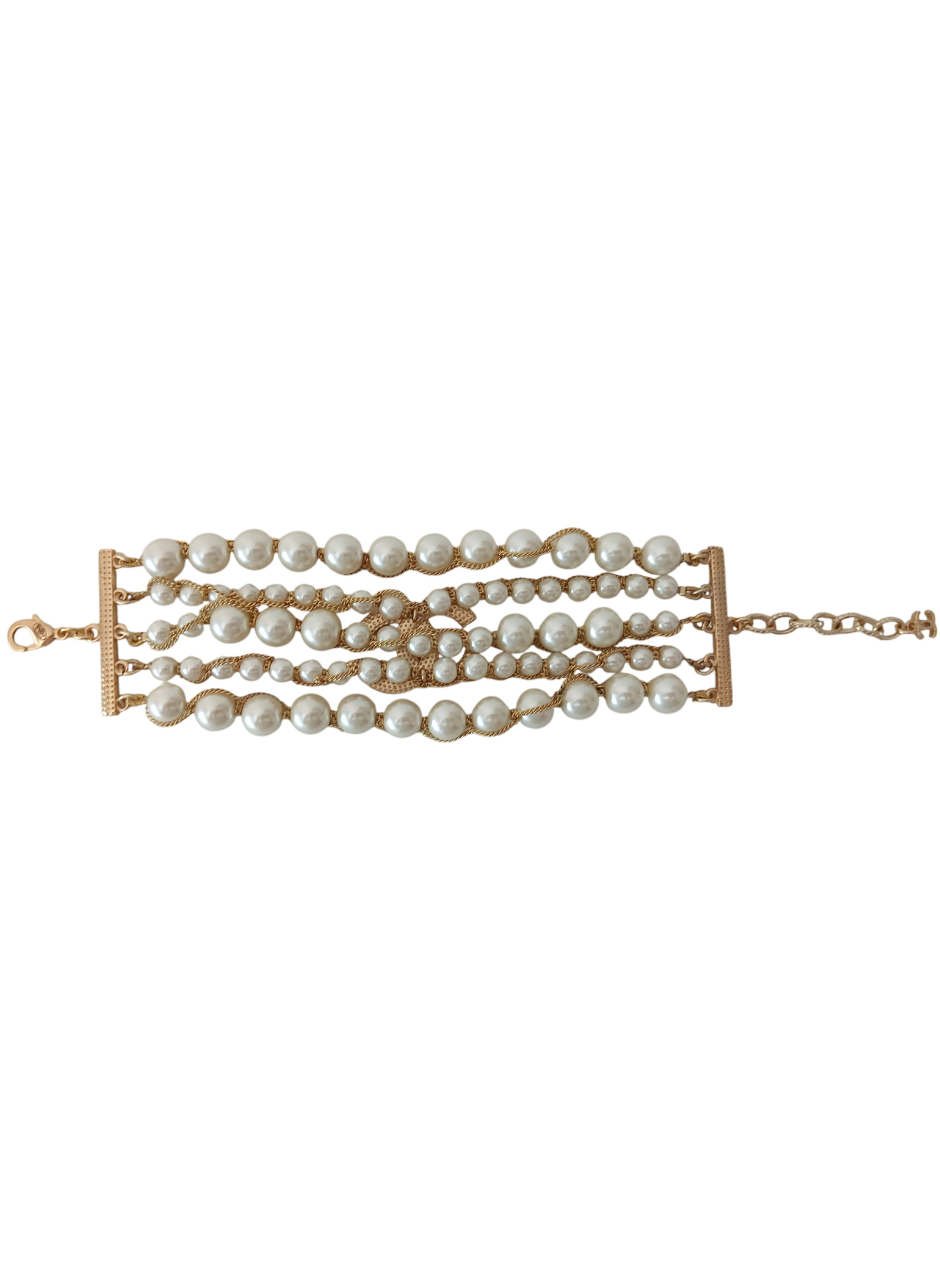 Pulsera de Chanel de metal dorado y perlas.5 filas de perlas de diferentes tamaños con cadena de metal dorado entrelazada,con adorno central CC con perlas.Muy buen estado.medidas : 22 cms de largo x 5 cms de ancho. Tiene cadena para adaptarse a un medida mas pequeña.