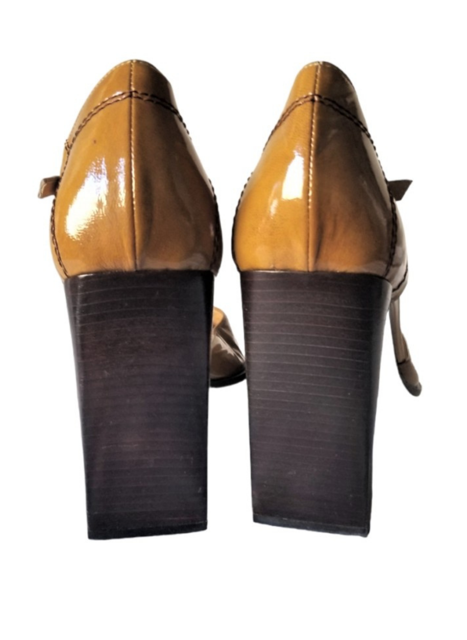 Zapato de tacón de Casadei en charol en color mostaza con costuras cruzadas en la parte de delante. Abrocha al tobillo. Tacones de madera de forma cuadrada de 11 cms. Talla 41.Estos tacones no presentan ningún tipo de señal de uso.