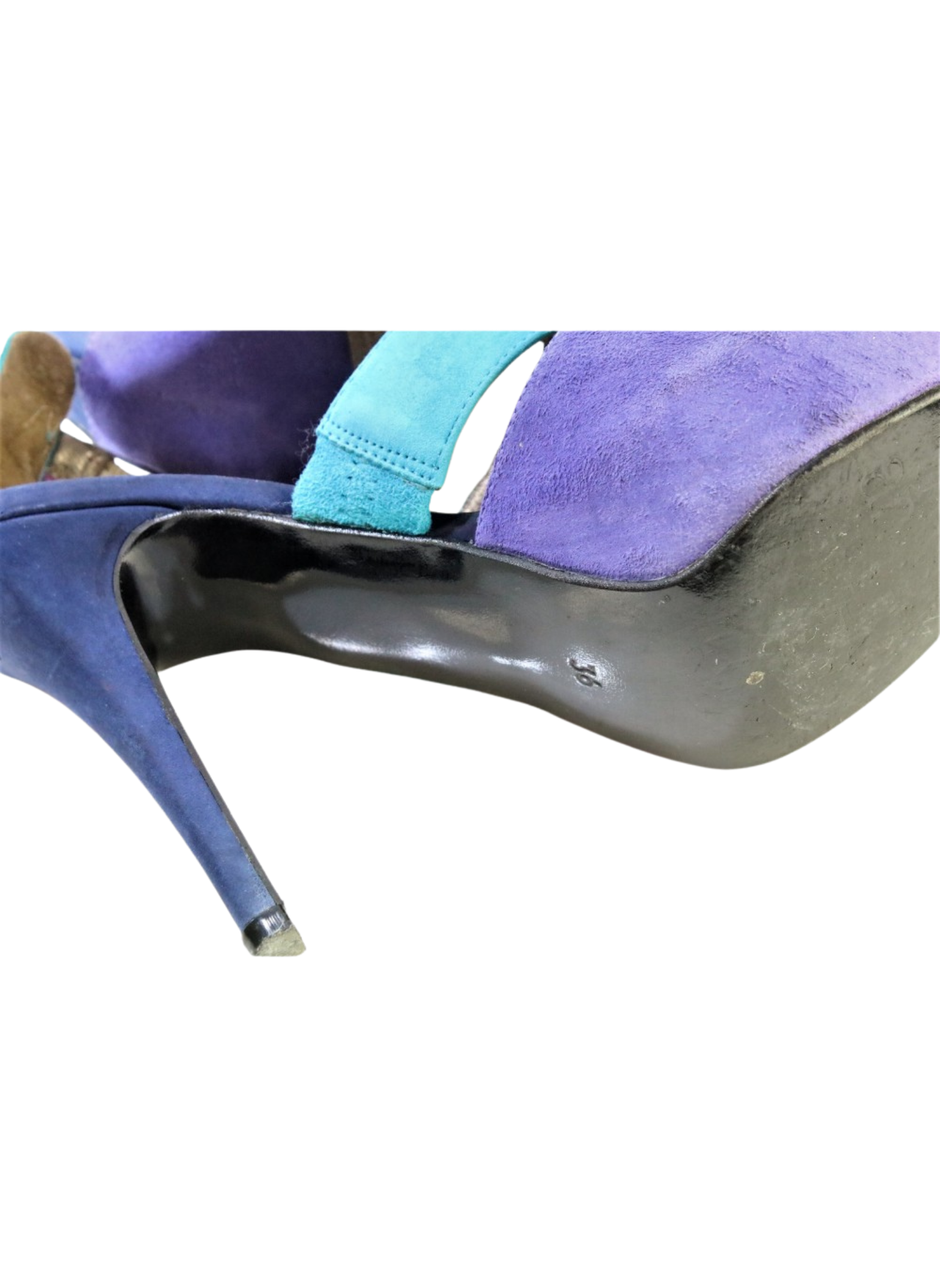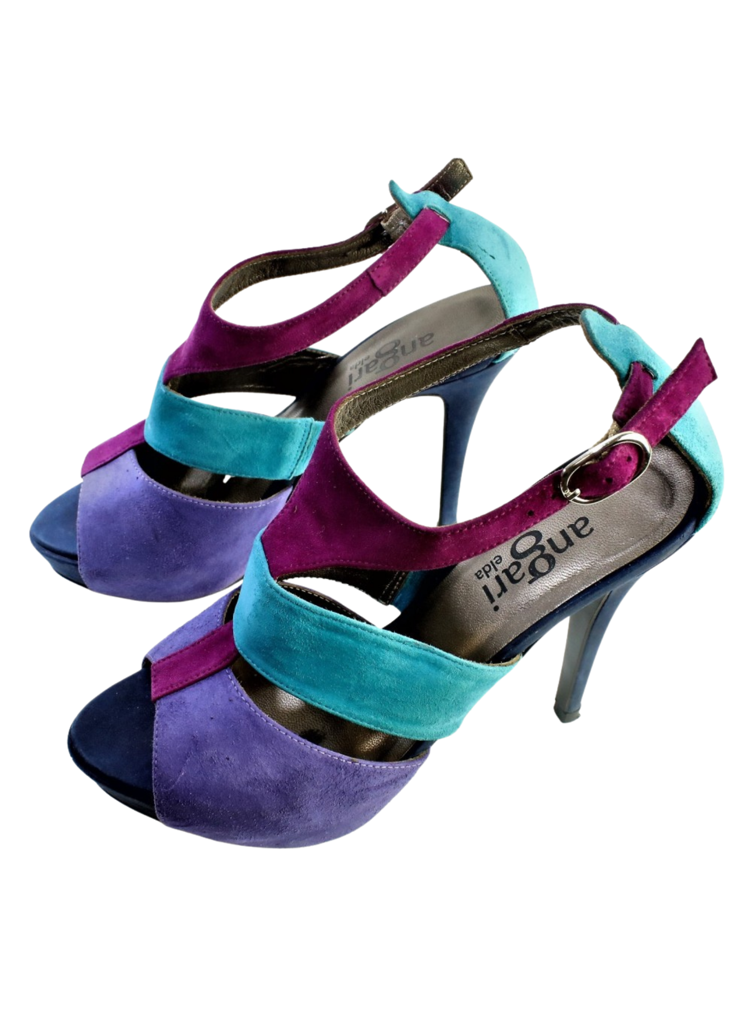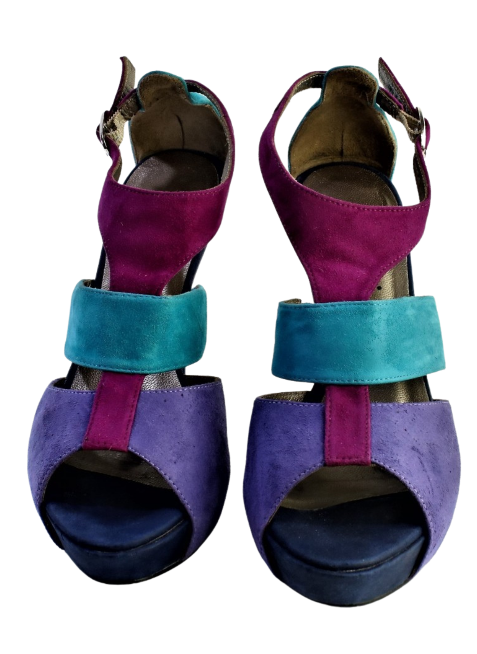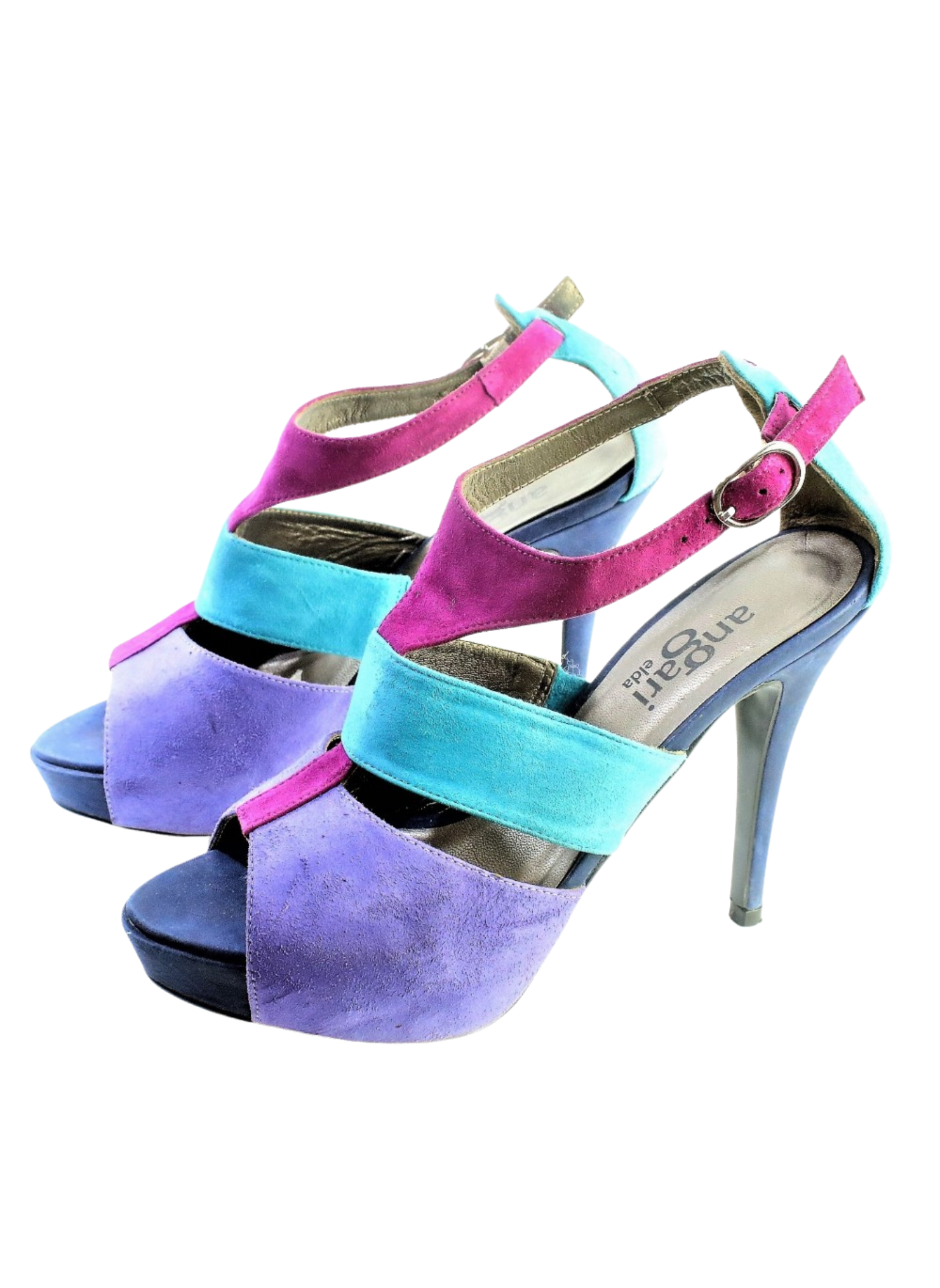 Sandalias en ante y con plataforma. Tacón alto de 11.5cm y plataforma de 2cm en color morado, turquesa y frambuesa. Son una talla 36. Estos tacones presentan muy pocas señales de uso.