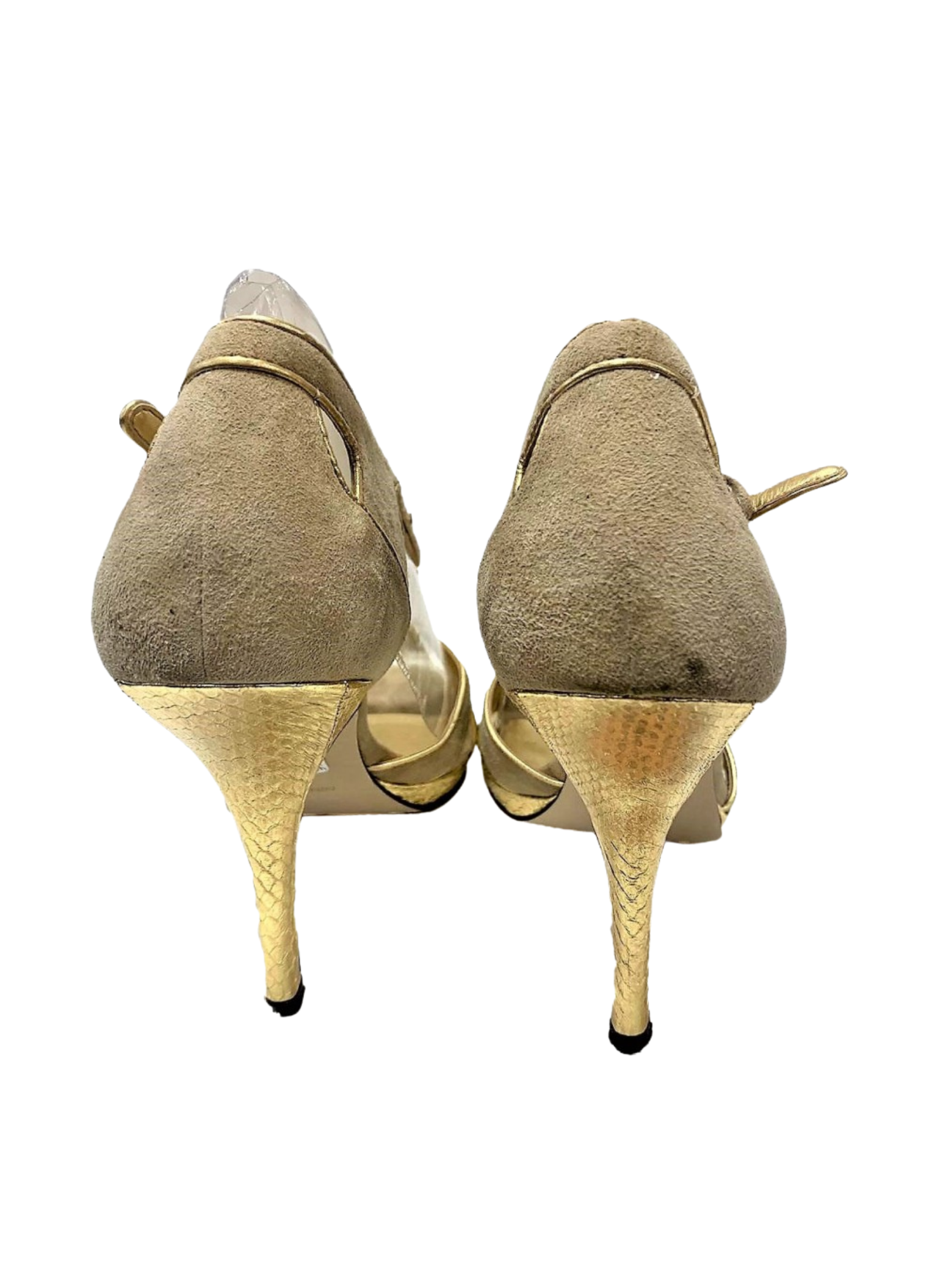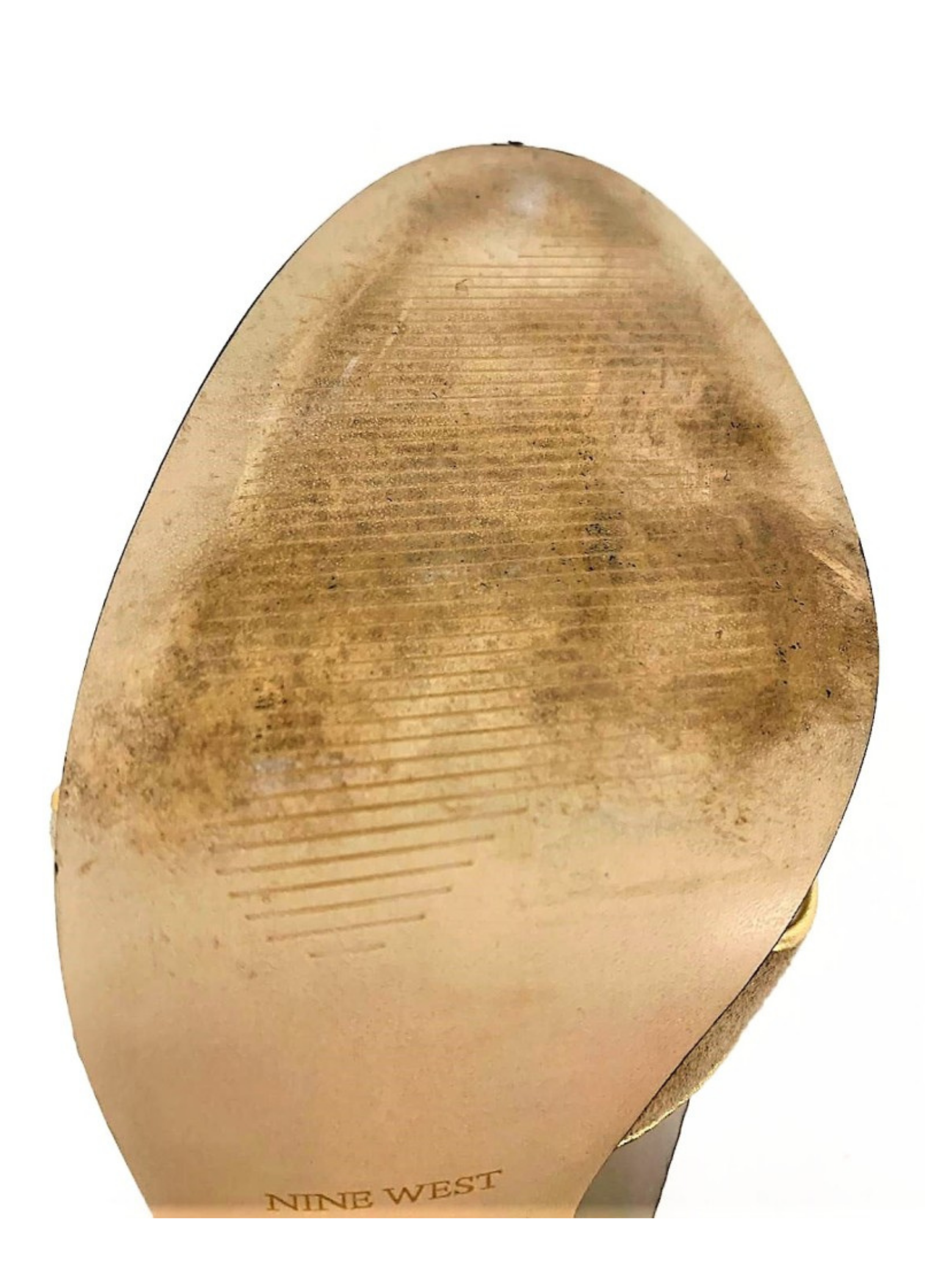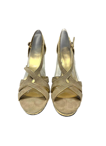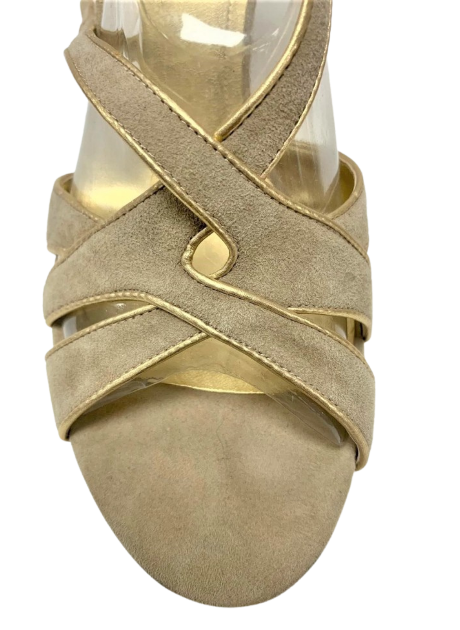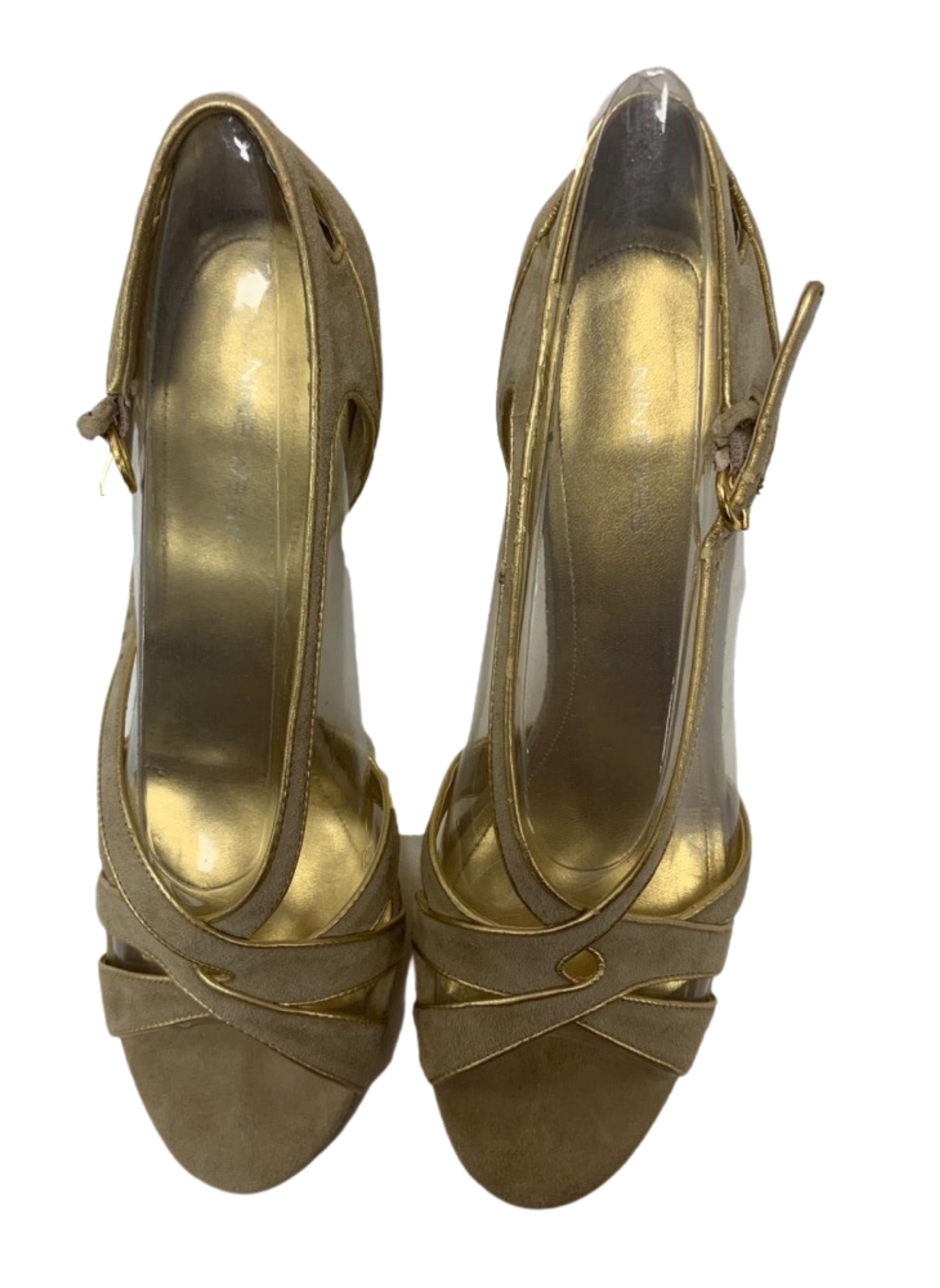 Sandalia de tacón de la marca Nine West de ante beige con los bordes en dorado. Tacón y plataforma de piel dorada. Son una talla 41. Estos tacones no presentan señales de uso.