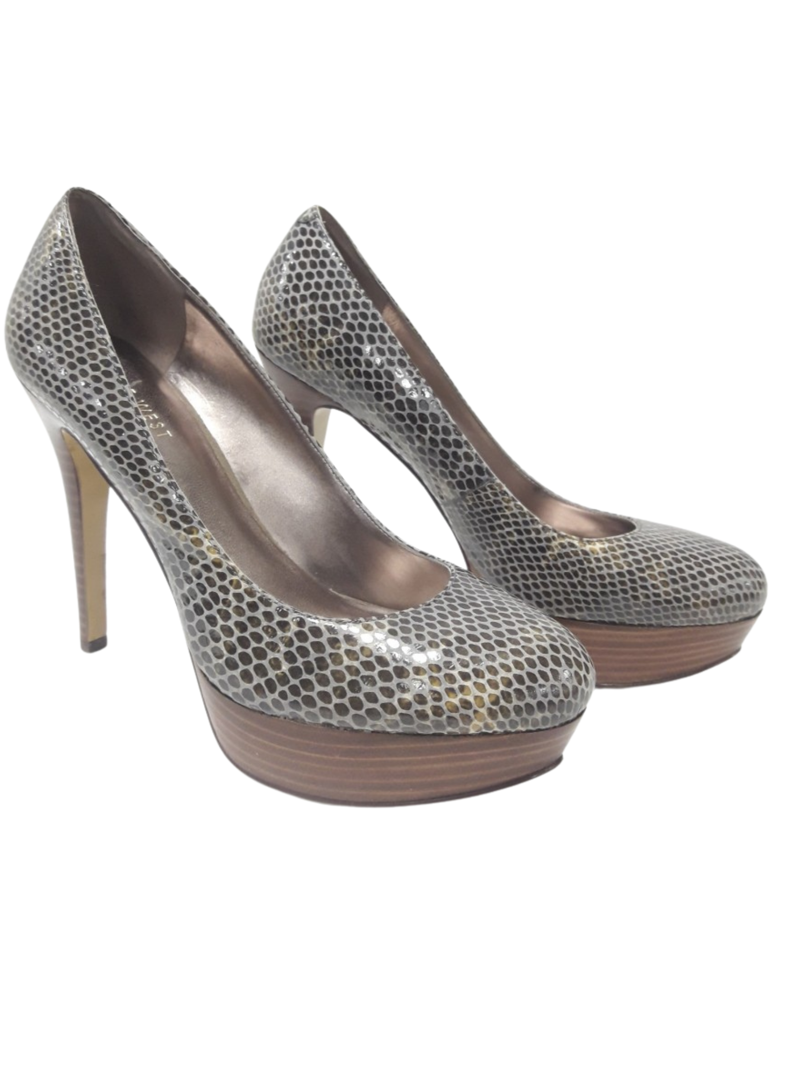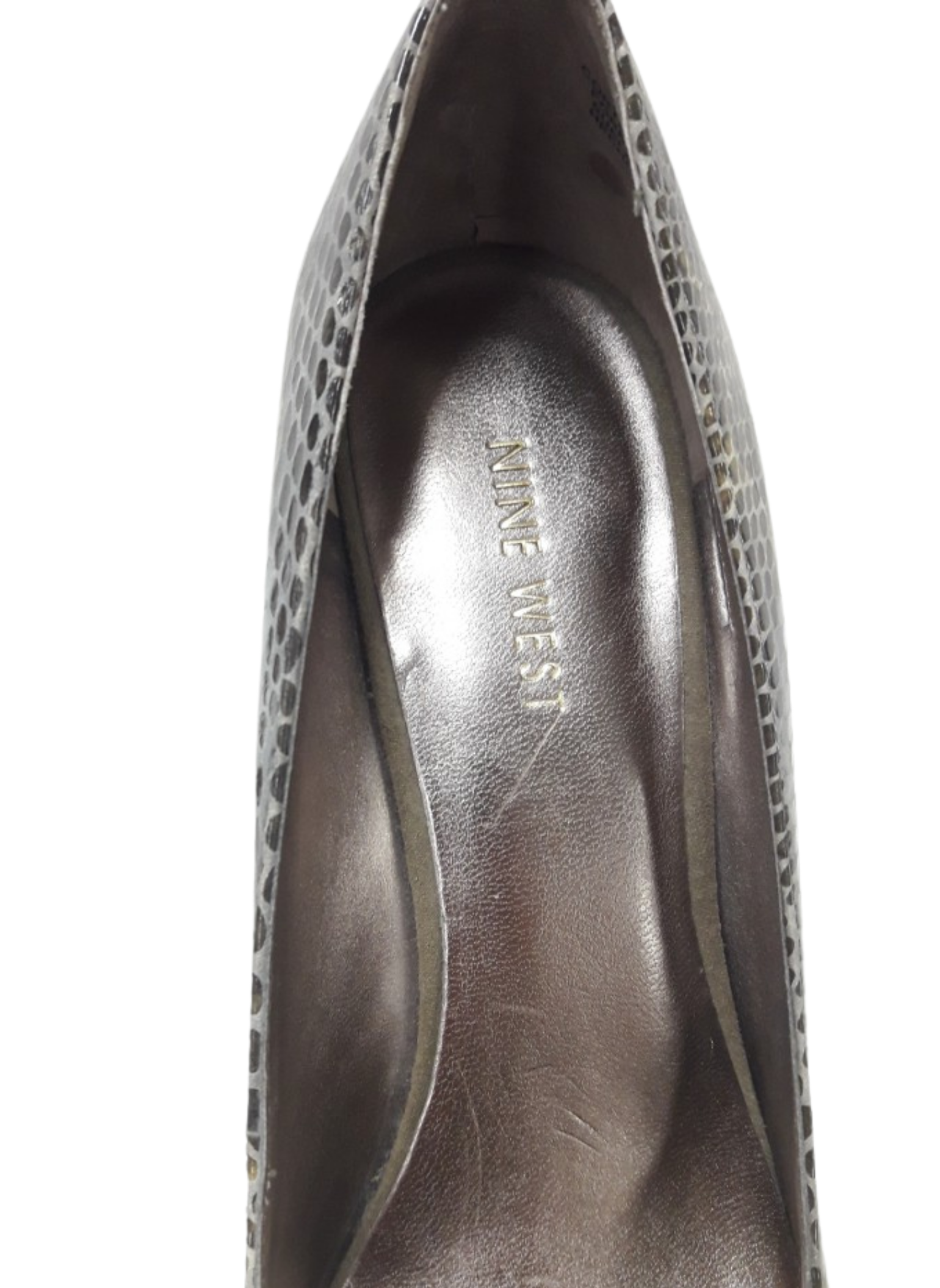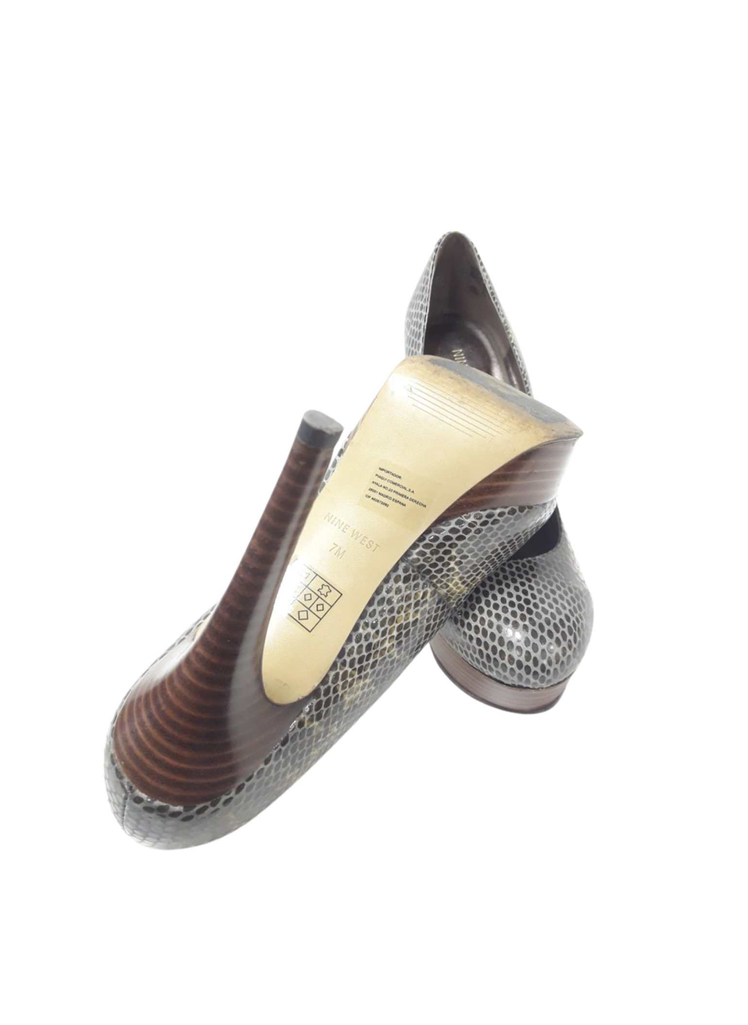 Zapatos de la marca Nine West en piel con efecto serpiente. Tacón alto de madera de 12cms y plataforma de madera de 3cms. Talla 38. Estos tacones no presentan señales de uso.