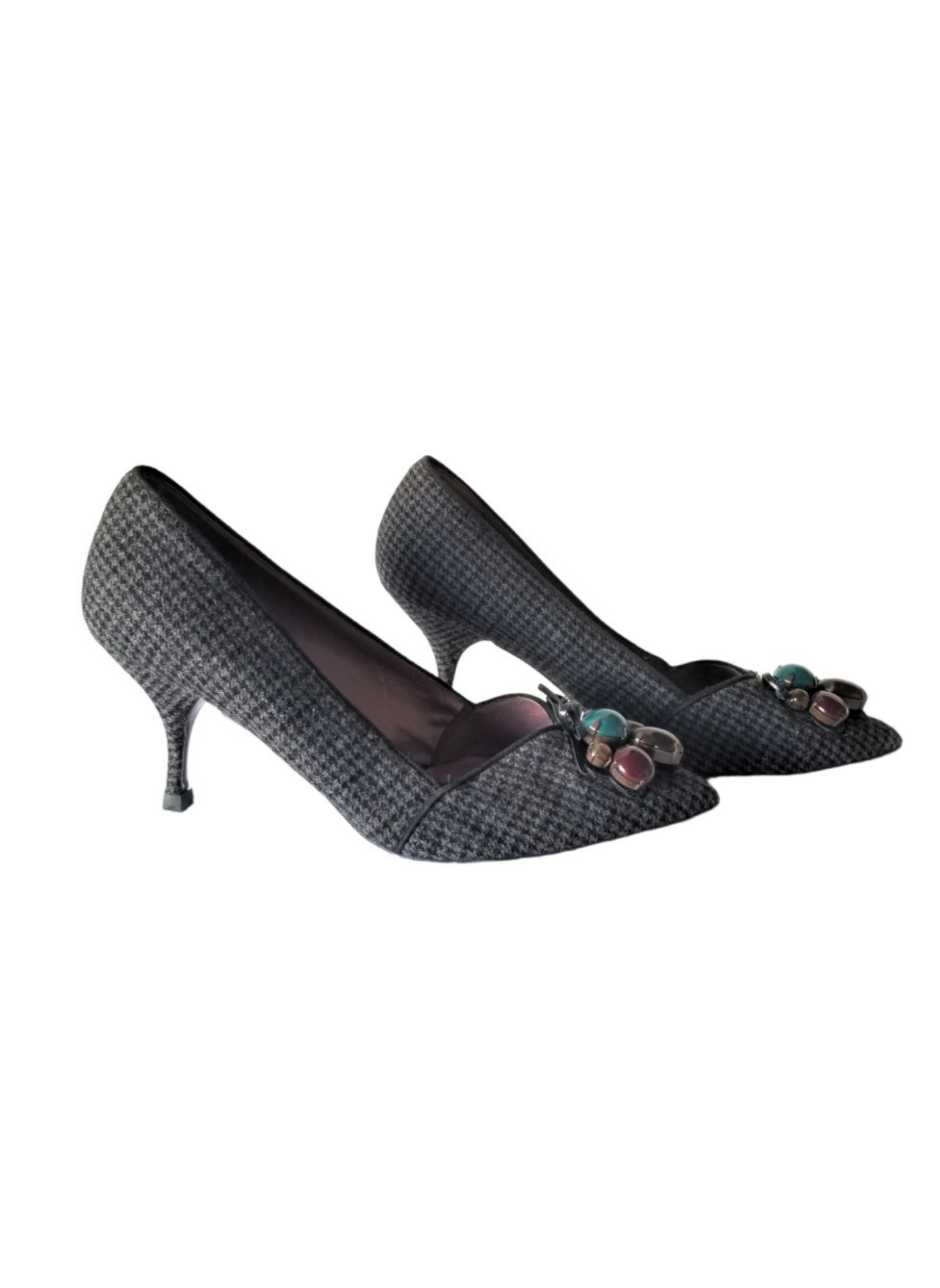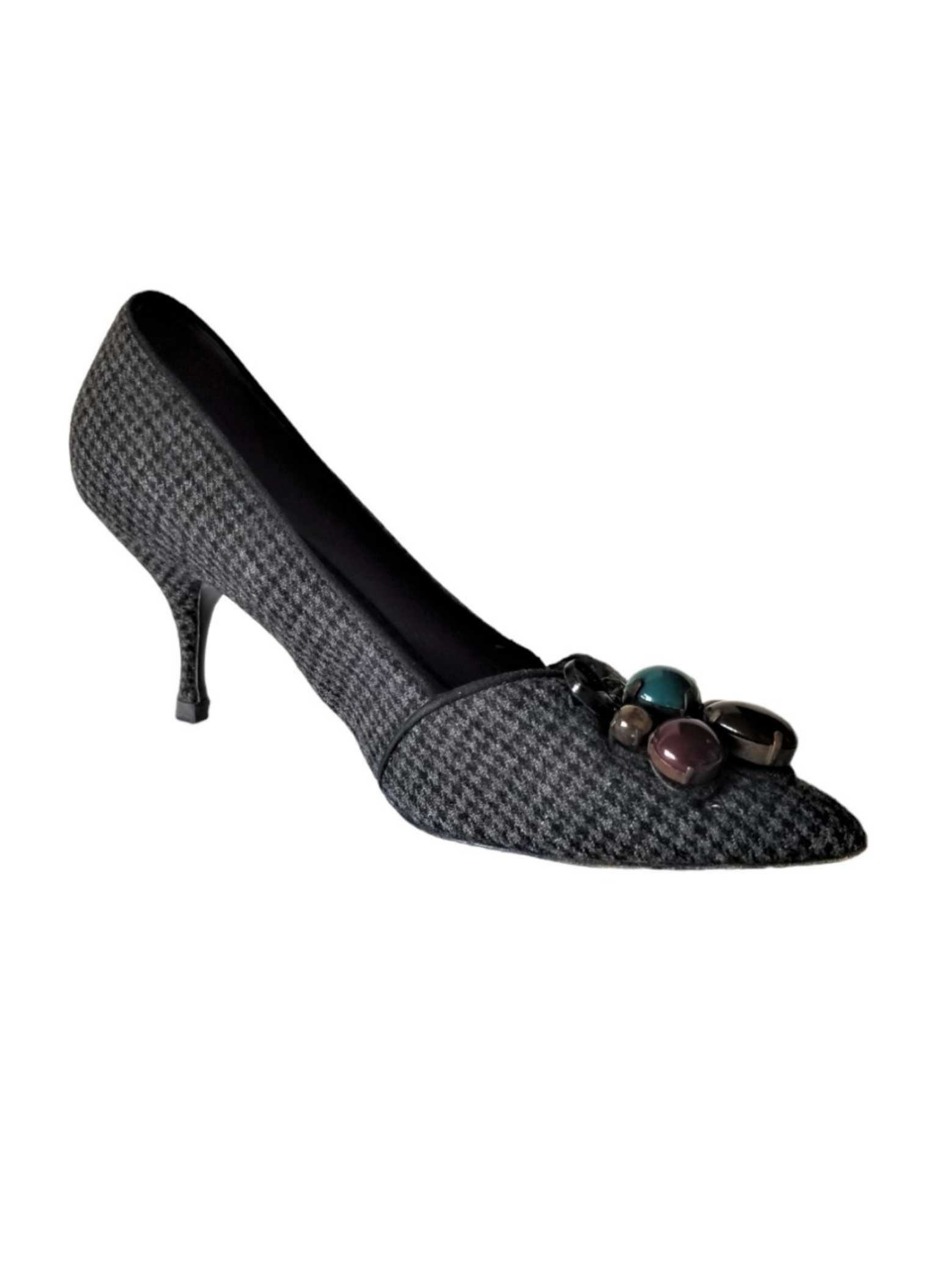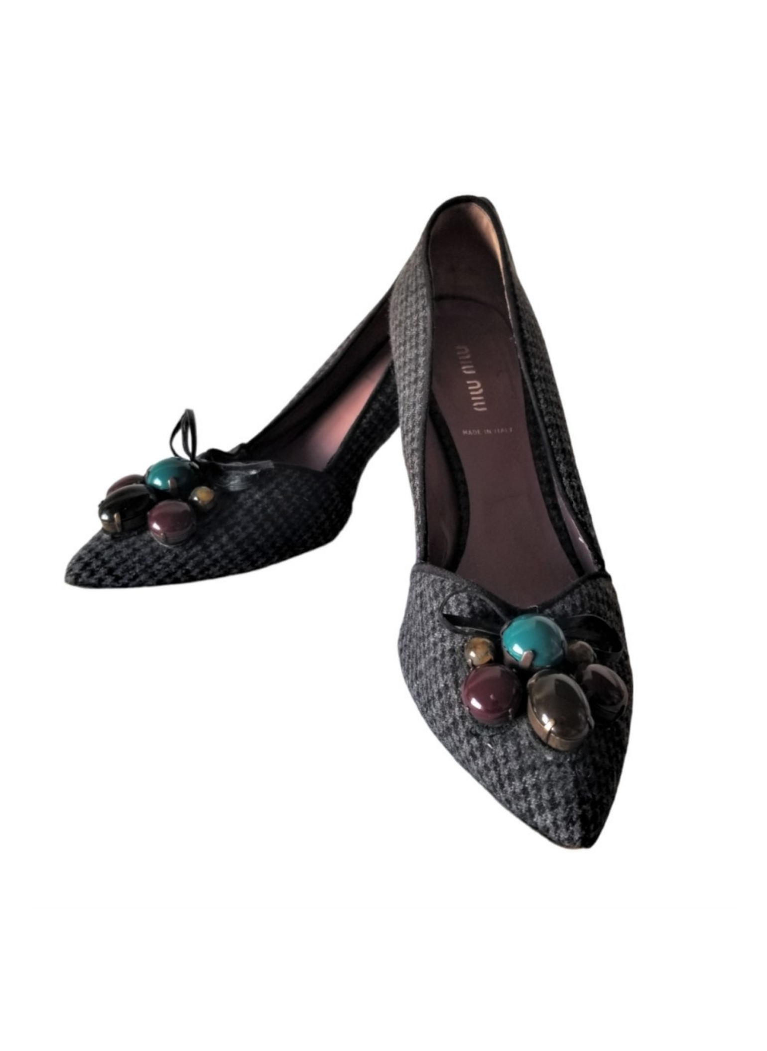 zapato de la marca Miu Miu de tela con estampado de pata de gallo en negro y gris con piedras de colores delante. El tacón es mediano.Talla 39,5. El tacón presenta muy pequeñas señales de uso.