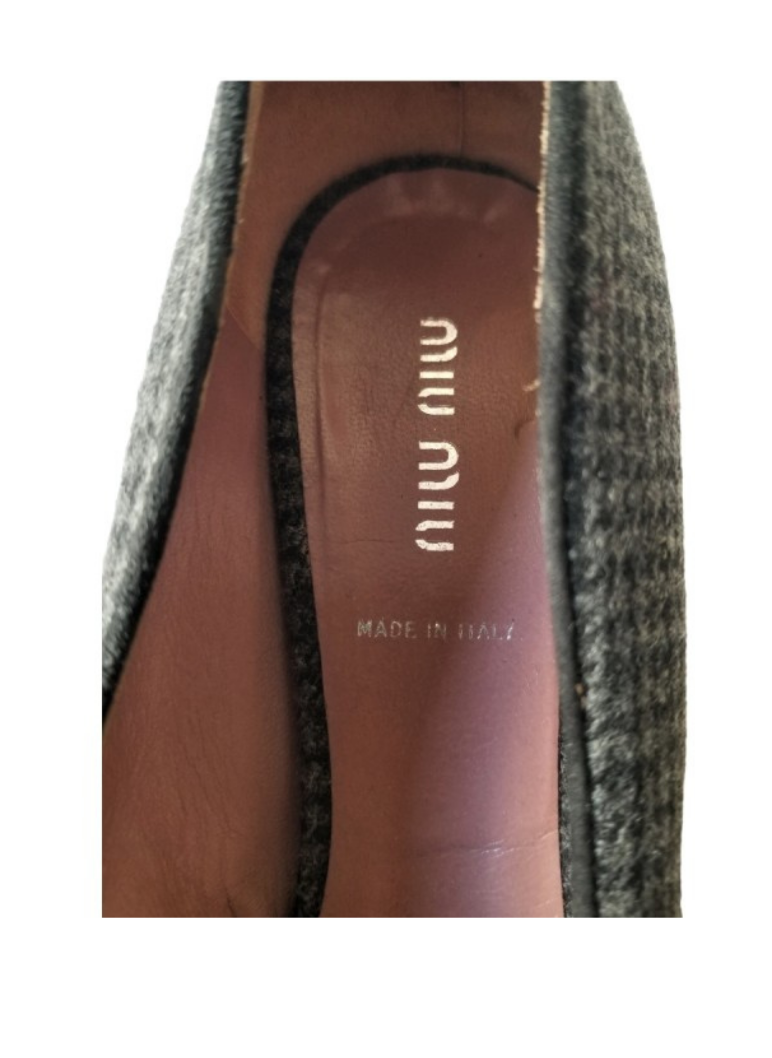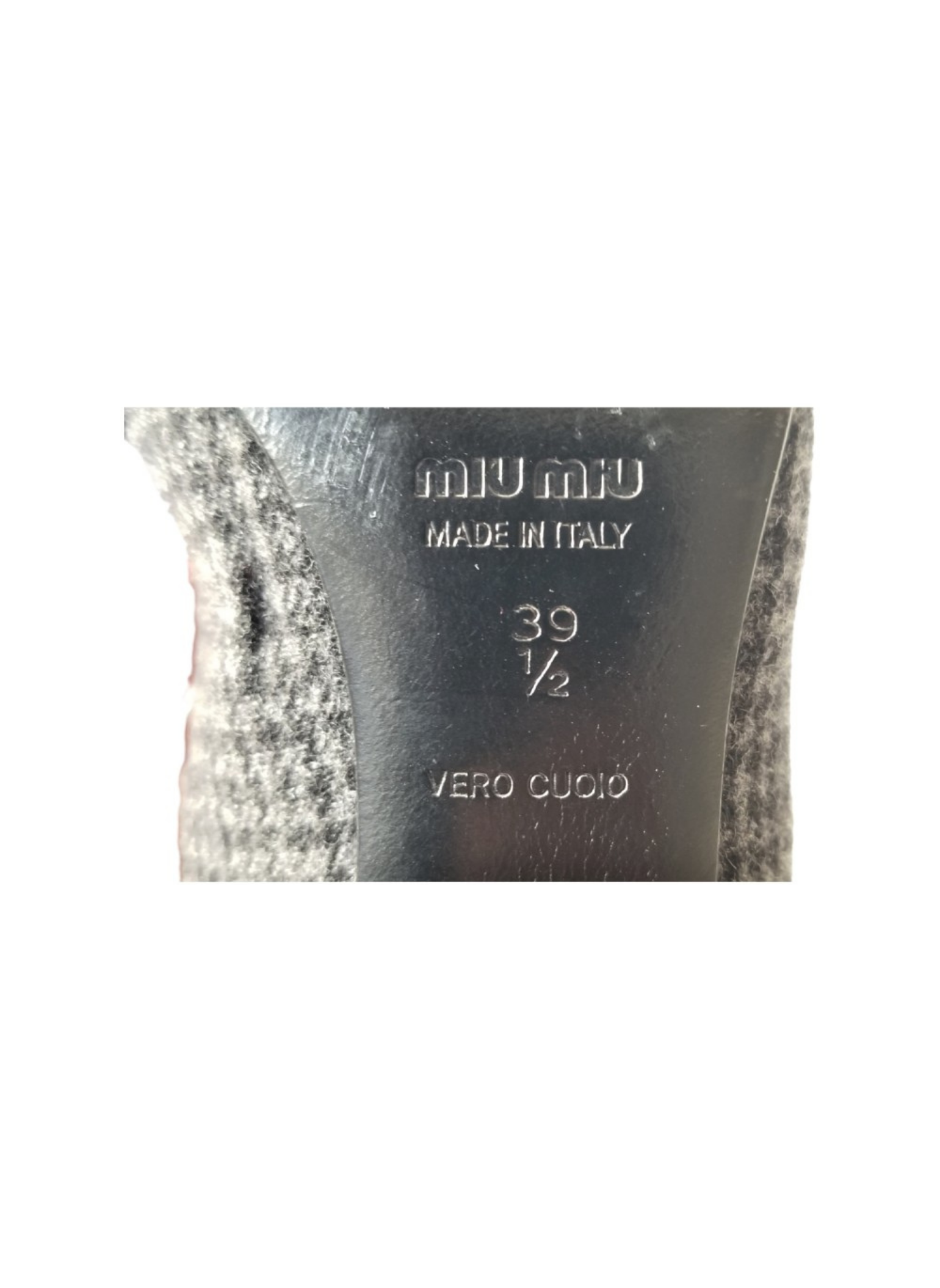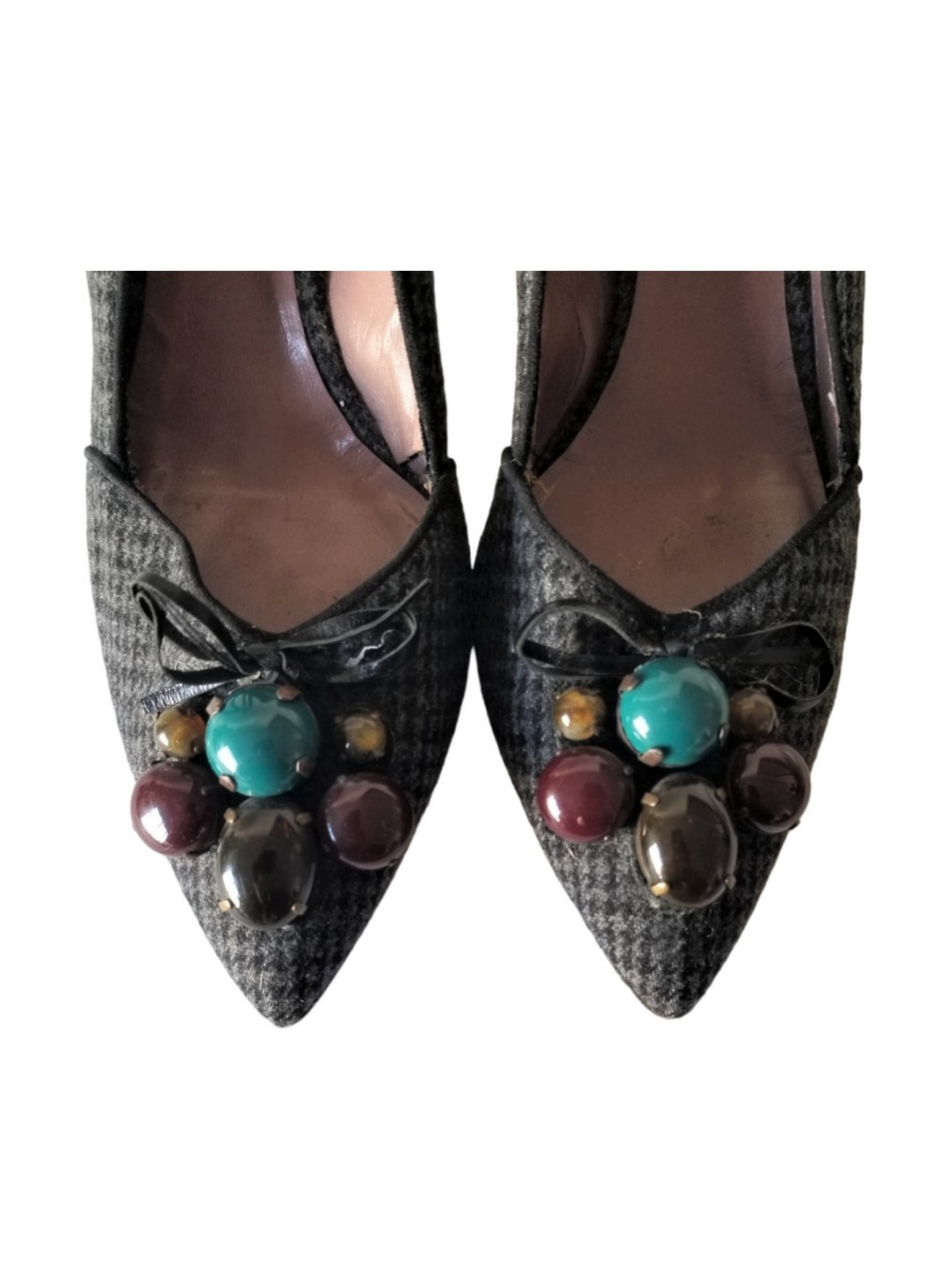 zapato de la marca Miu Miu de tela con estampado de pata de gallo en negro y gris con piedras de colores delante. El tacón es mediano.Talla 39,5. El tacón presenta muy pequeñas señales de uso.