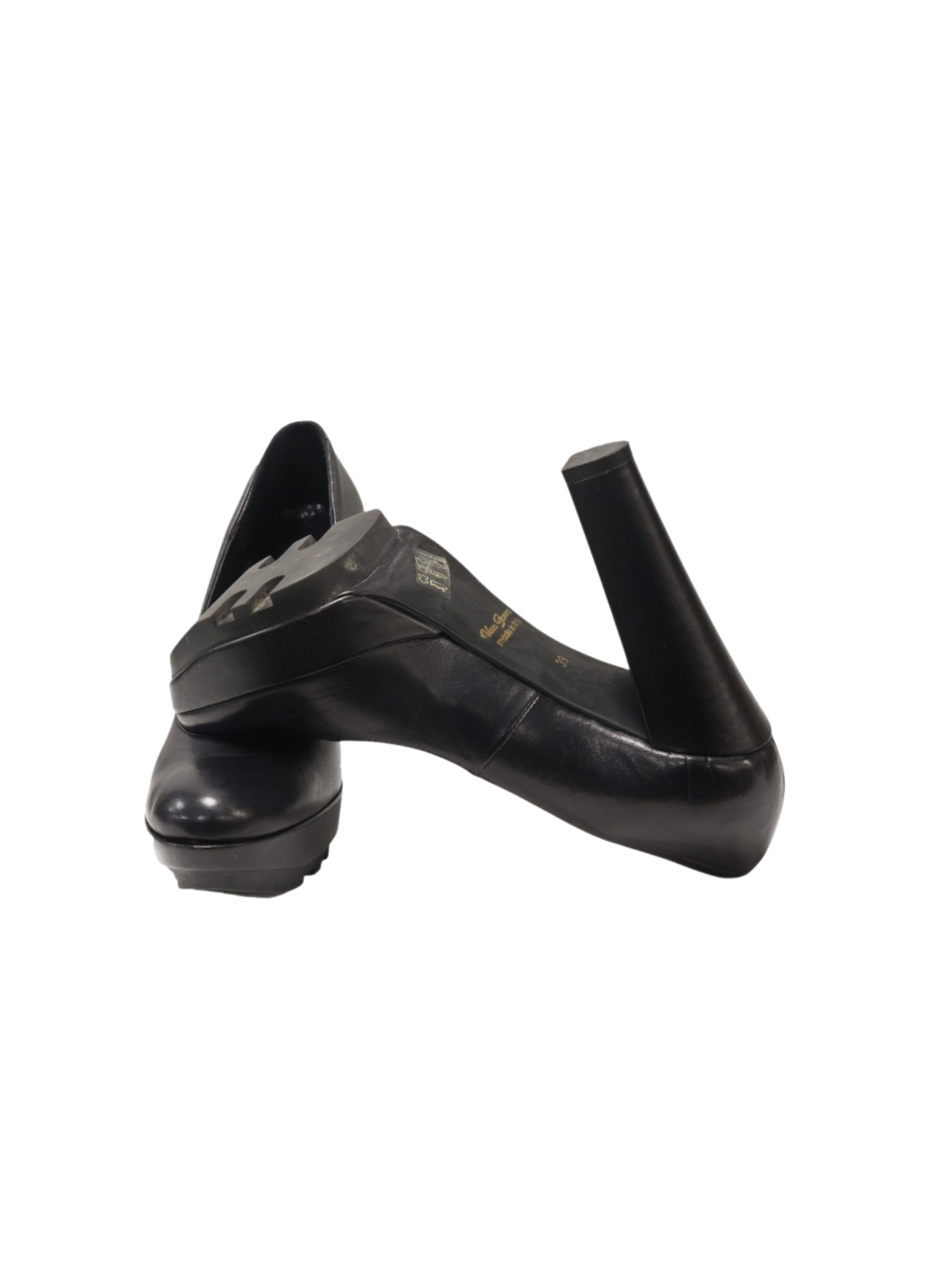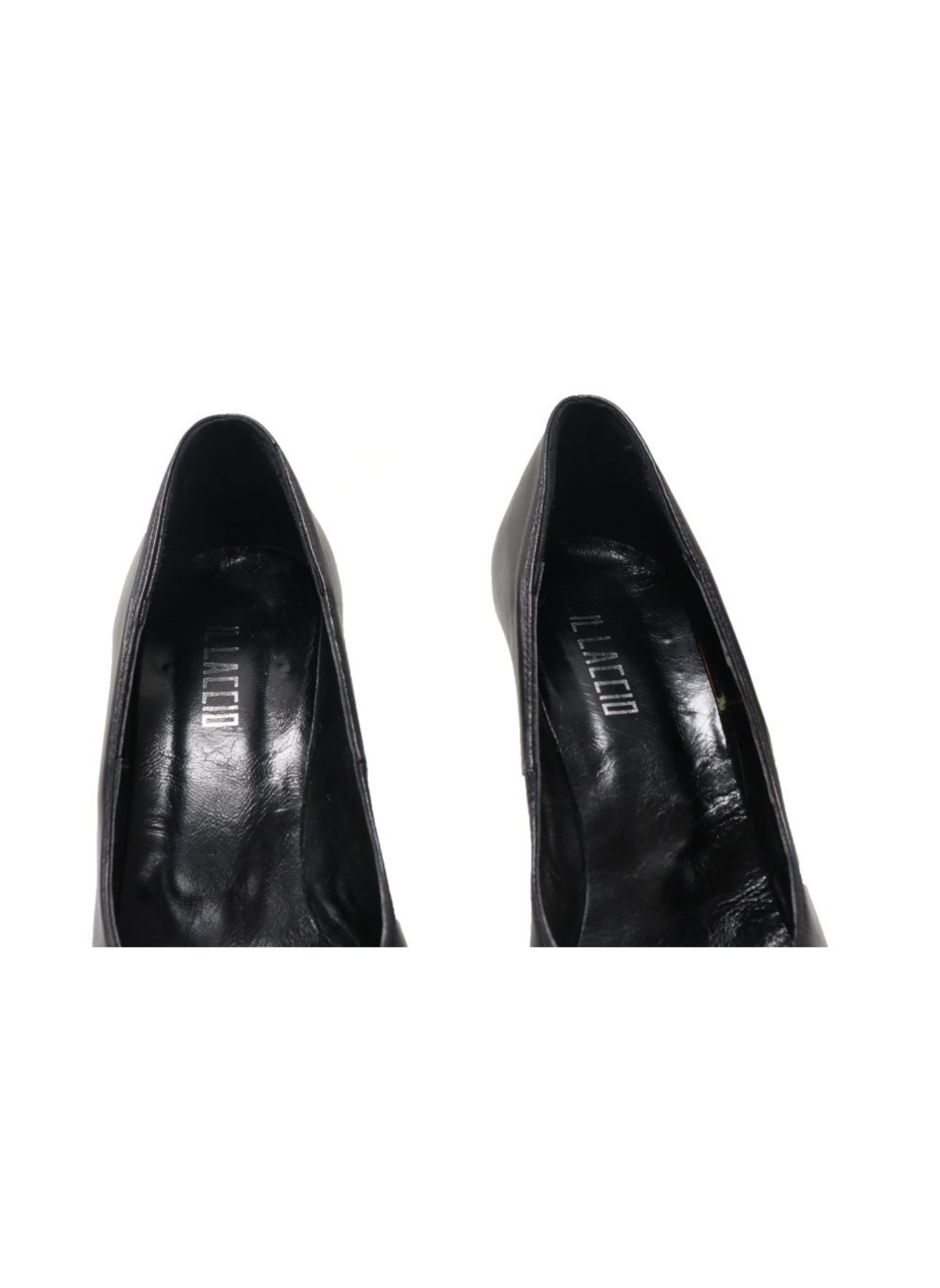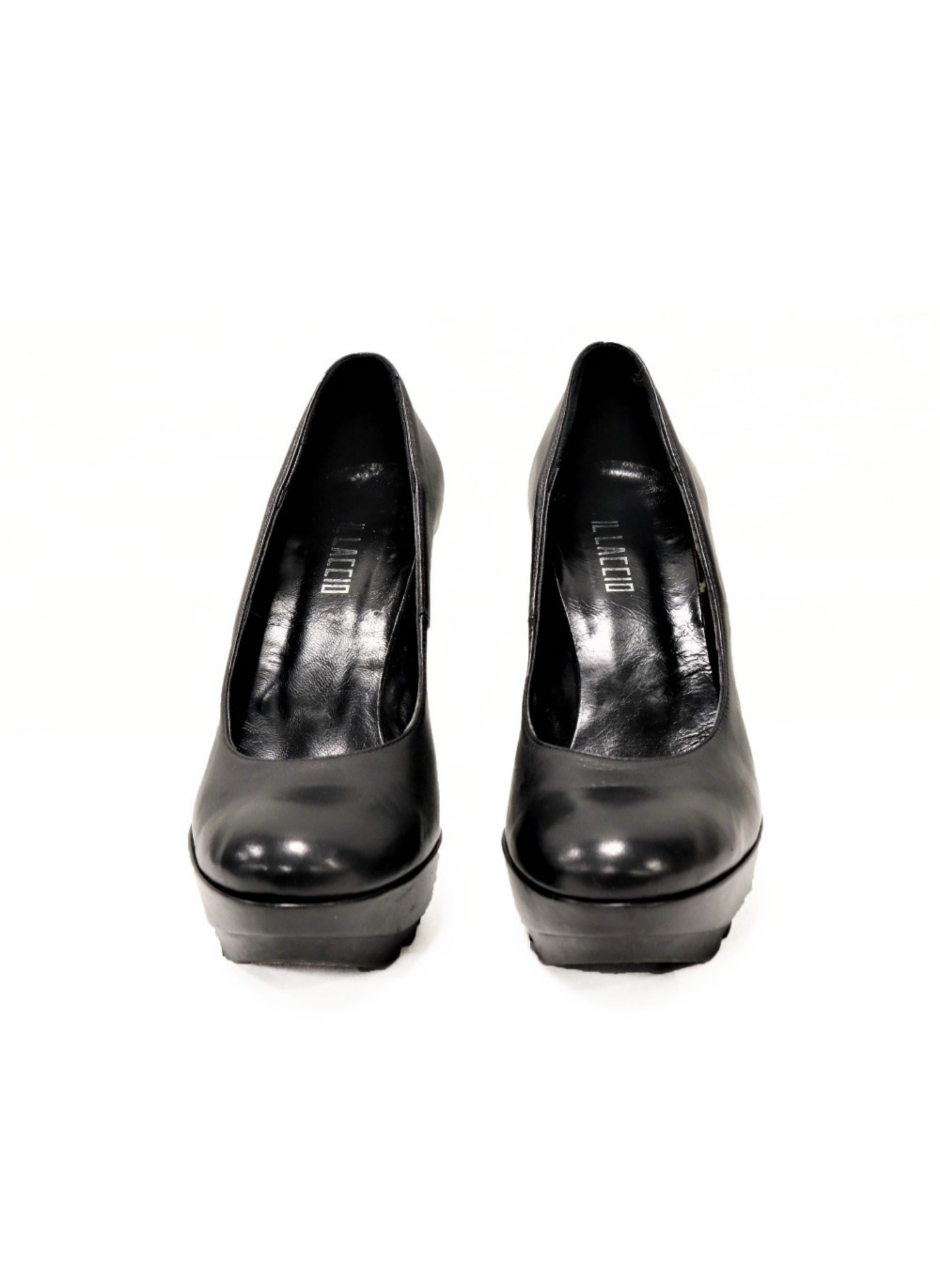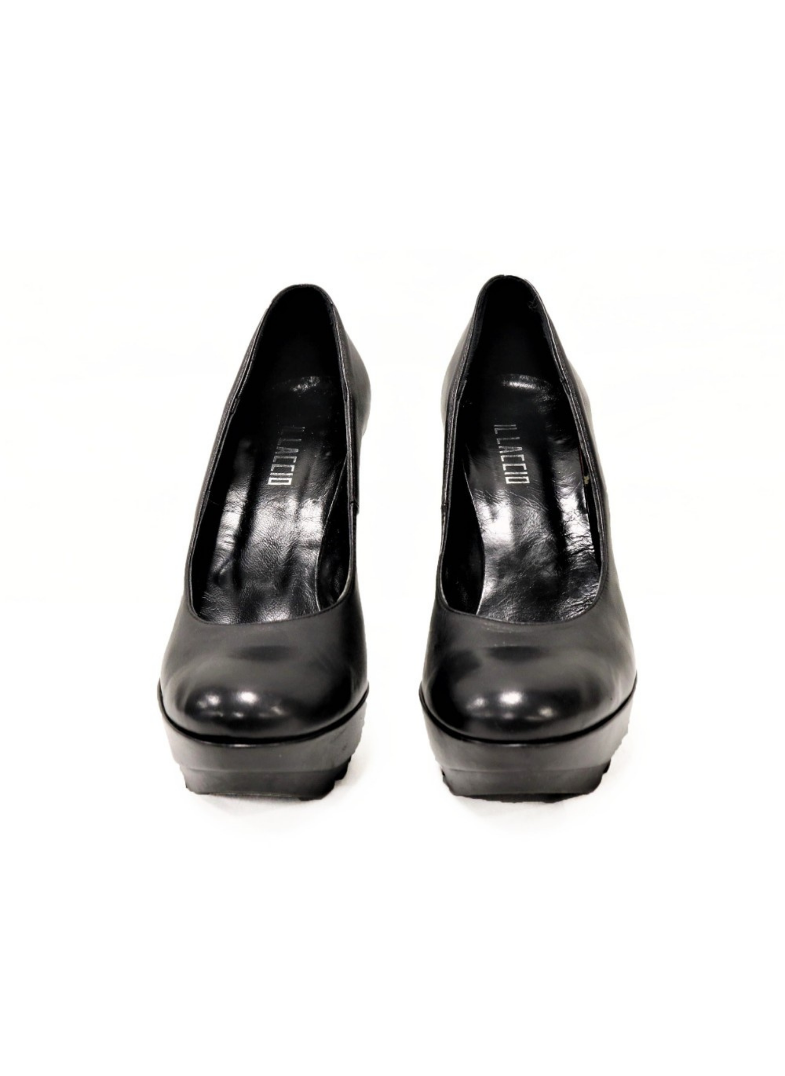 IL Laccio brand shoes with heels and court style. They are black leather with rubber soles. The heel is 12 cm high and has a 3cm platform. These heels are a size 39. They show no signs of wear.