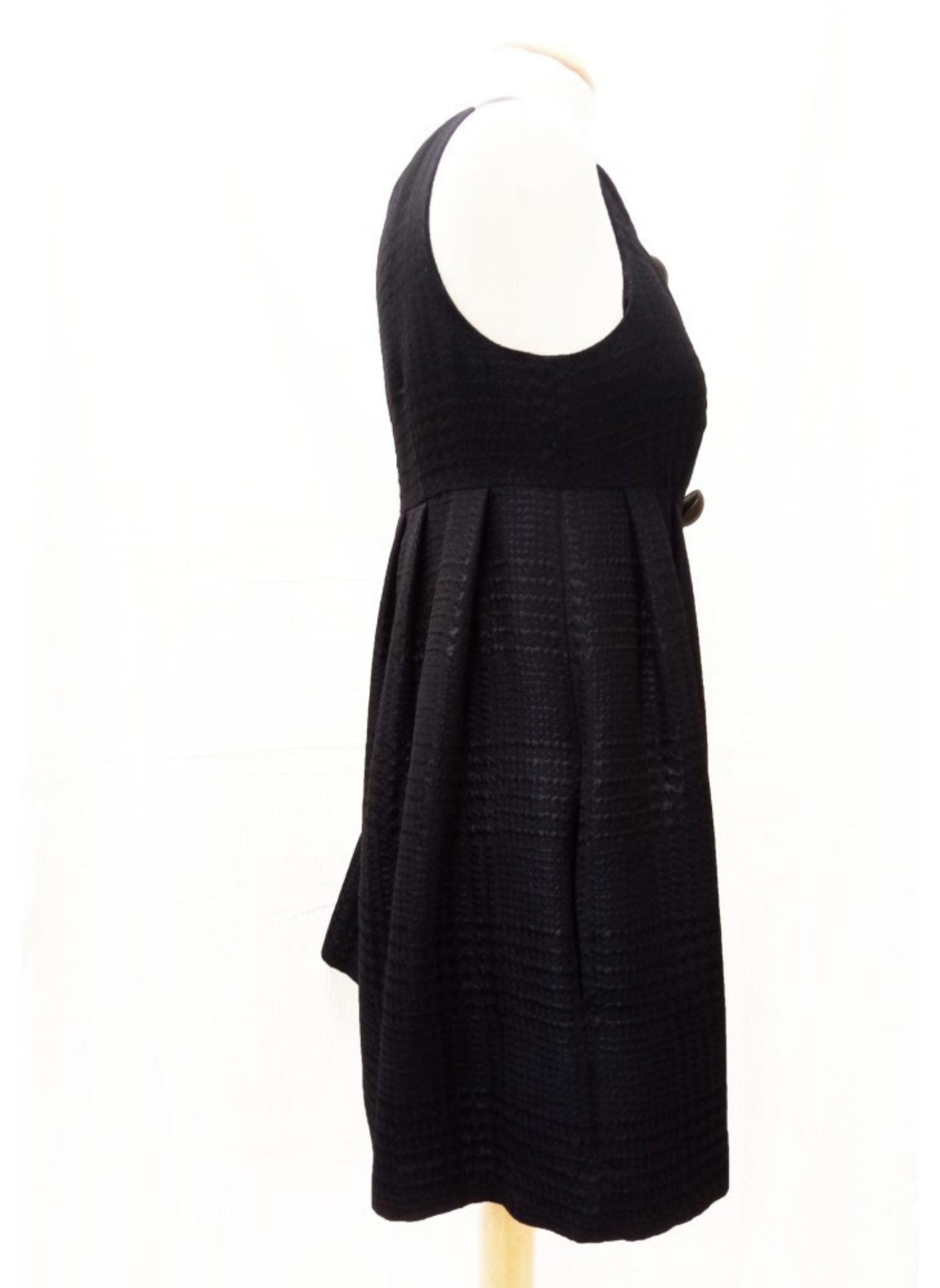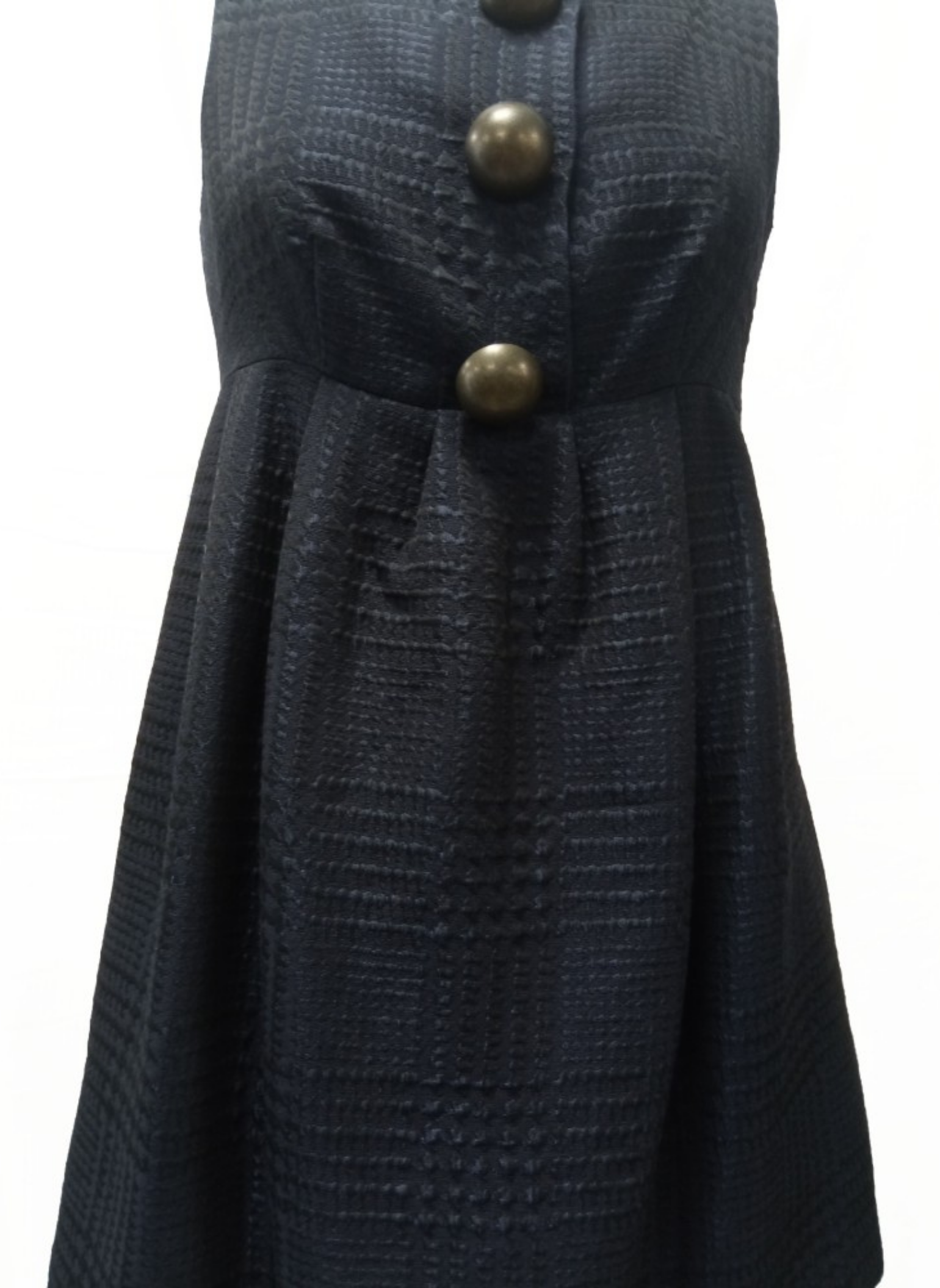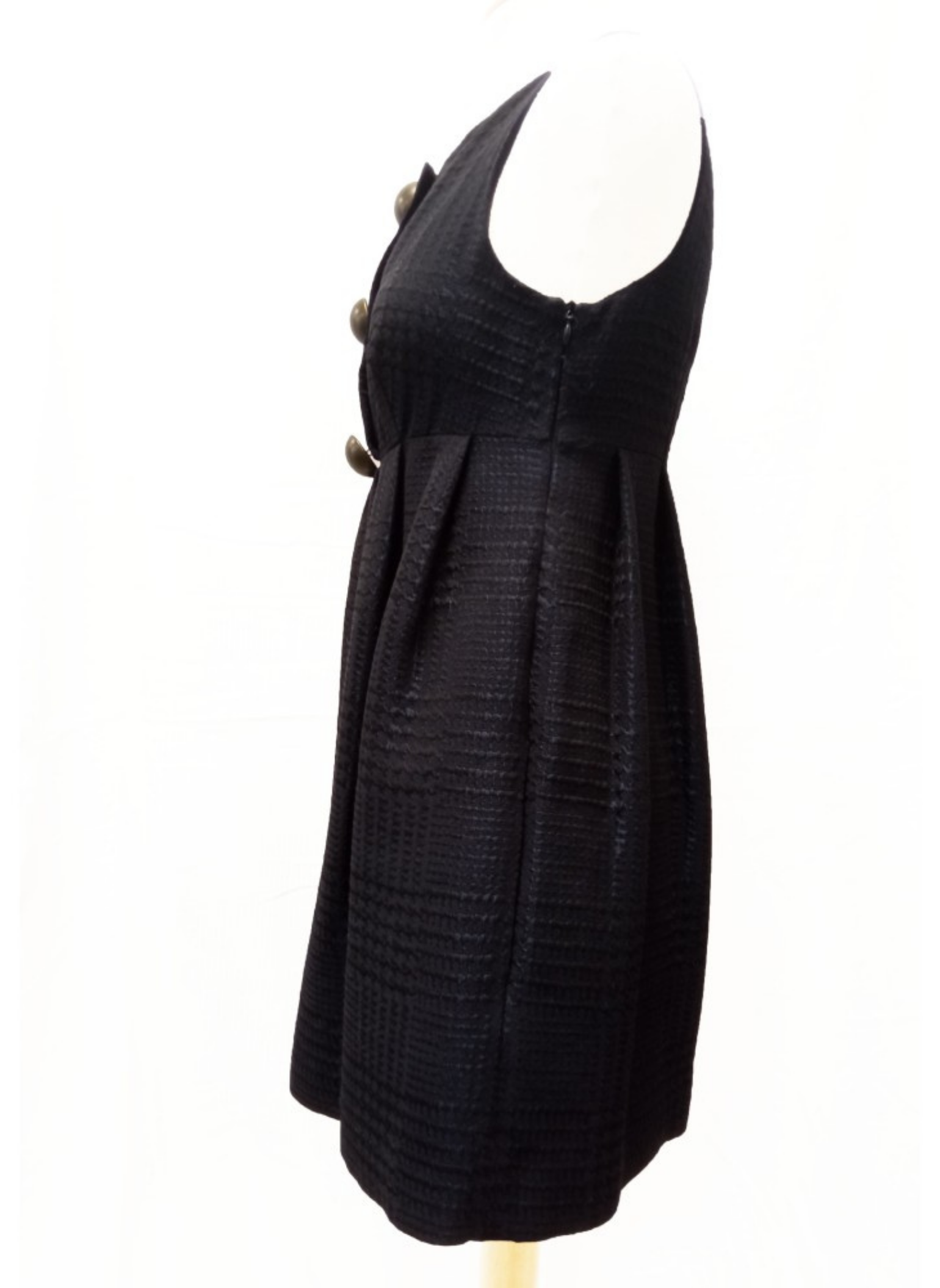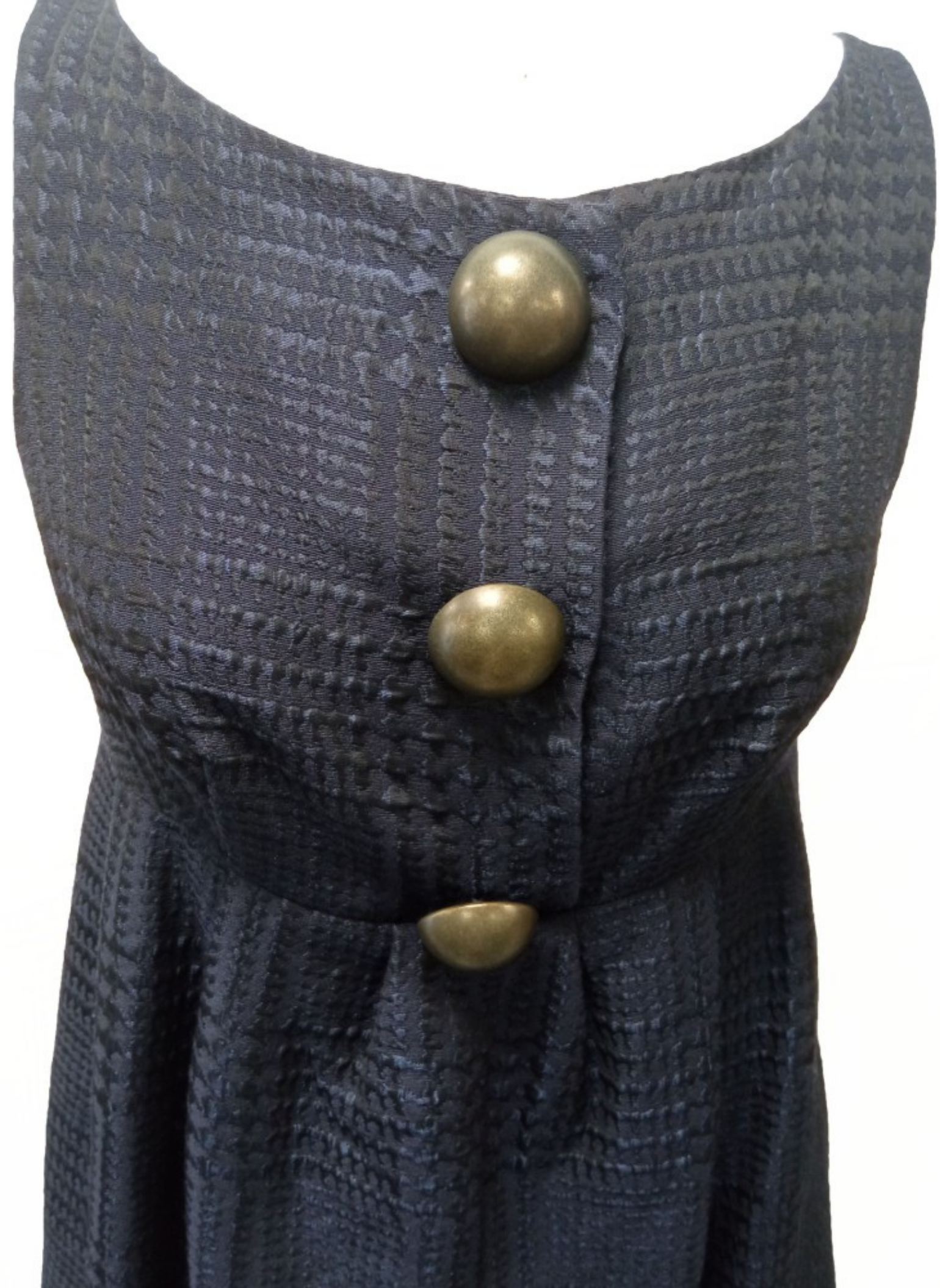 Sleeveless navy blue Moschino brand dress with 3 large decorative half-ball buttons. It contains a zipper on the side. This dress is a size 40.