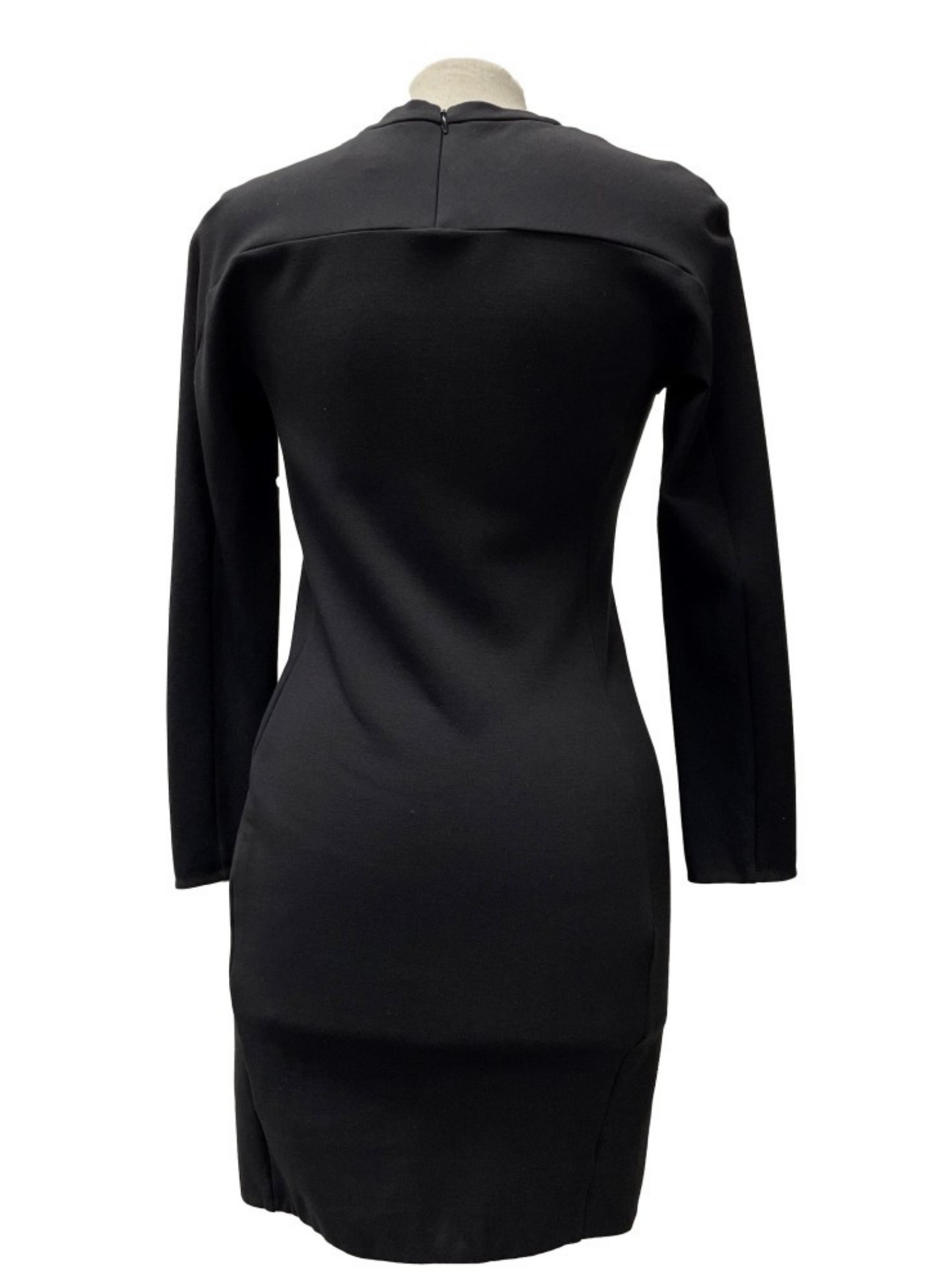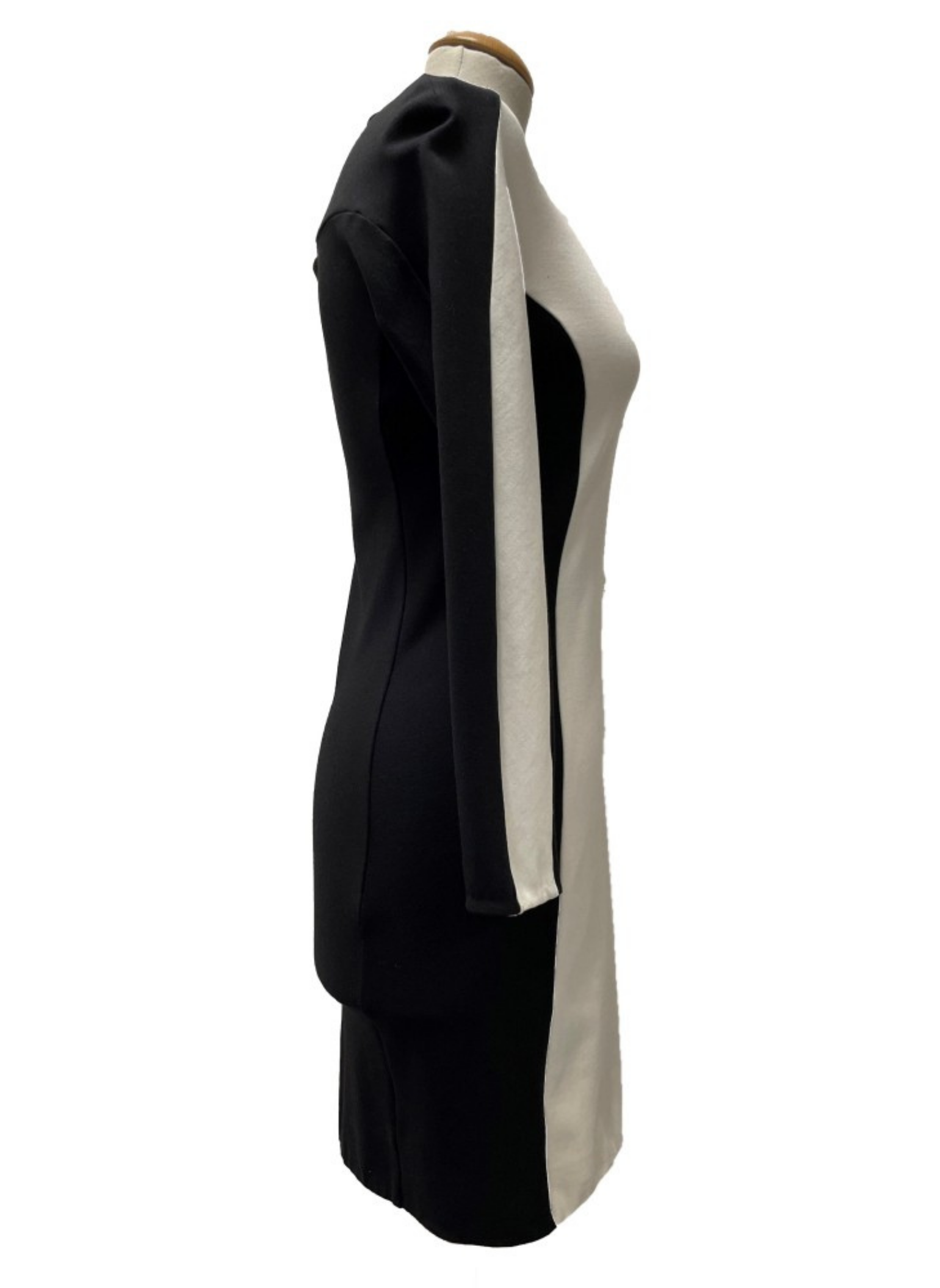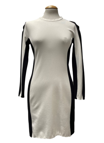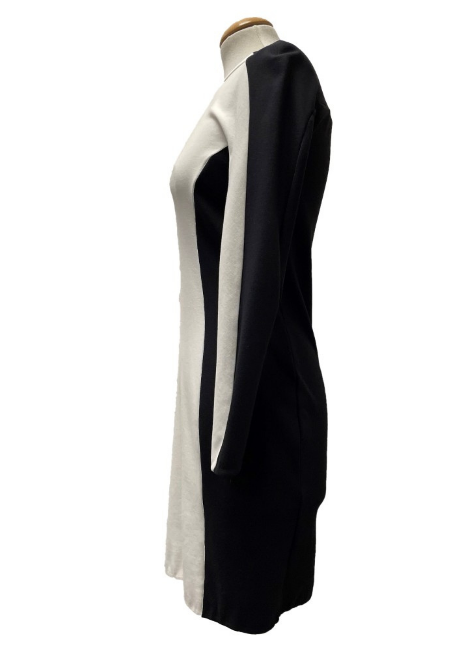 Original Phillip Lim brand dress in black and white cotton with elastine, fits tight and has long sleeves. It is a size 36. It does not have a marked shoulder so it has a dropped shoulder. This dress does not show any signs of wear.