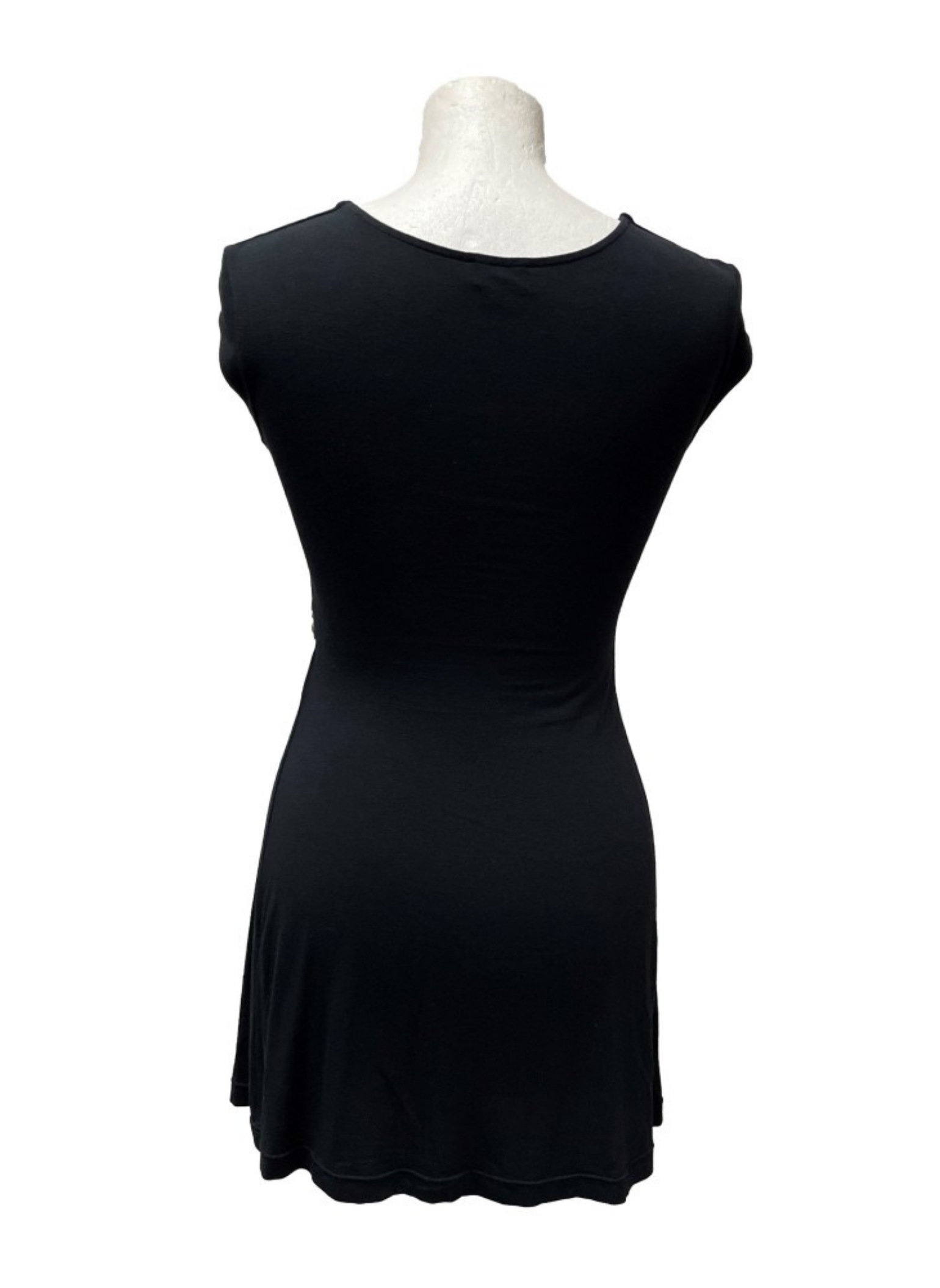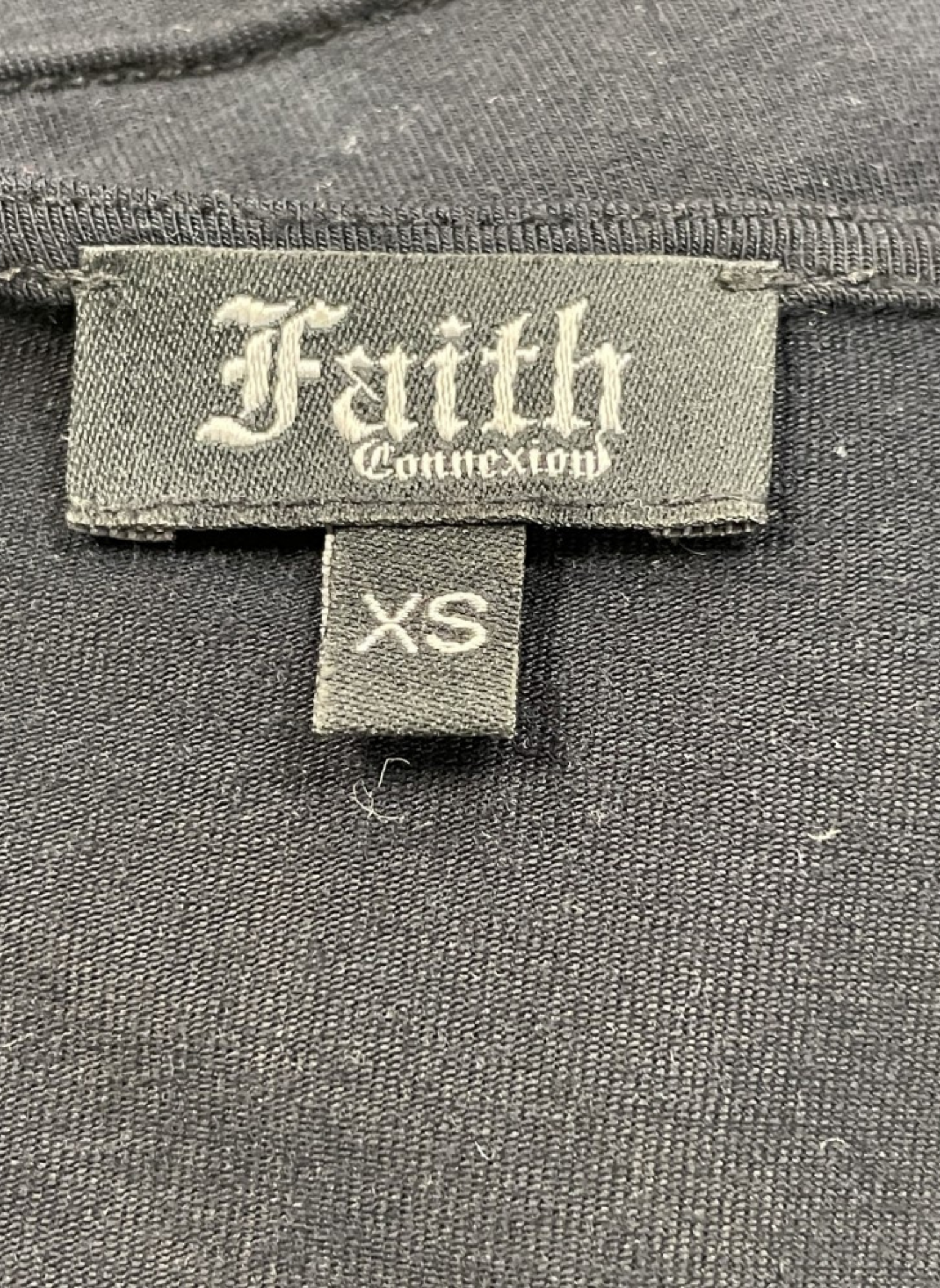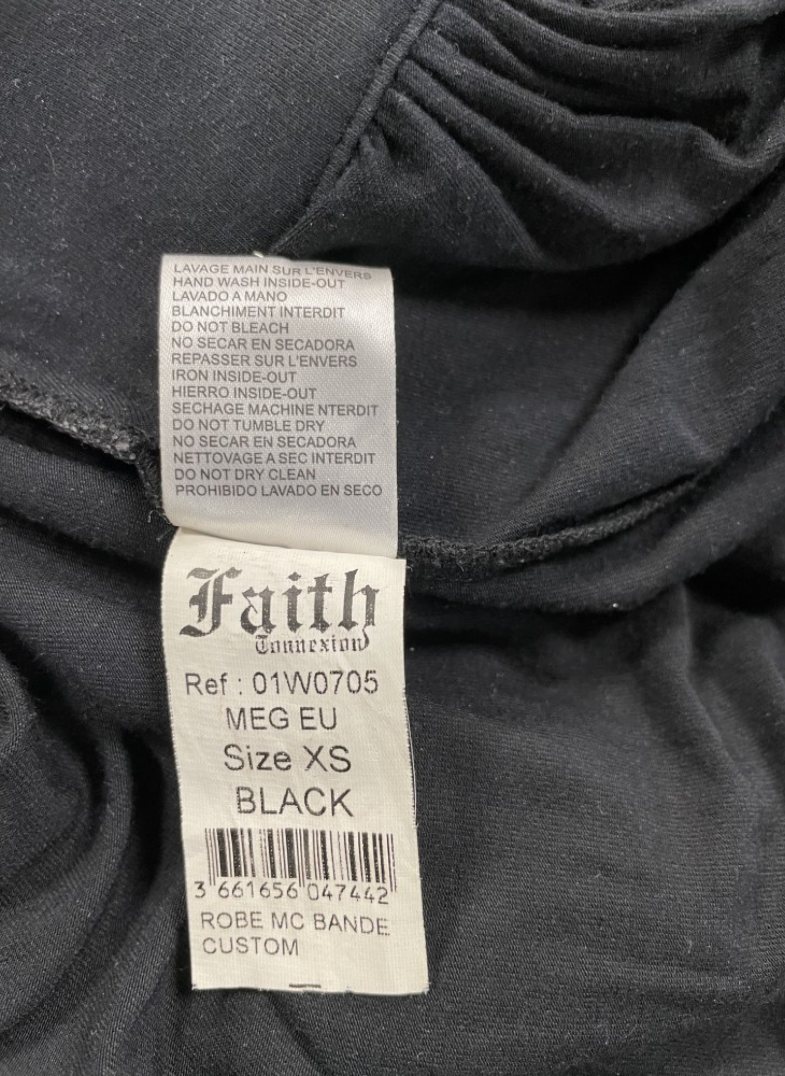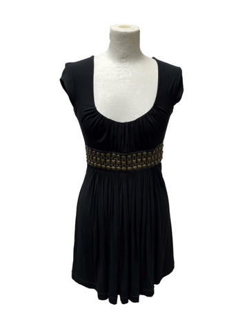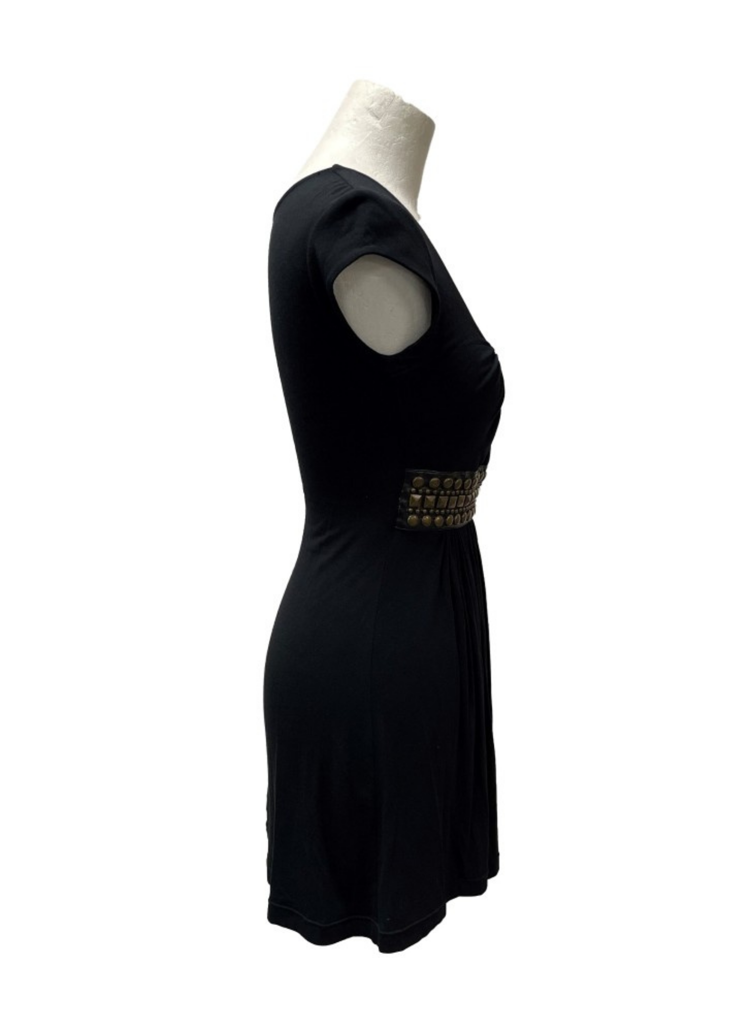 Short dress from the Faith brand in black with short sleeves. At waist level it features leather with round and square metal stones. There is slight wear on the leather. It is a size XS (36).