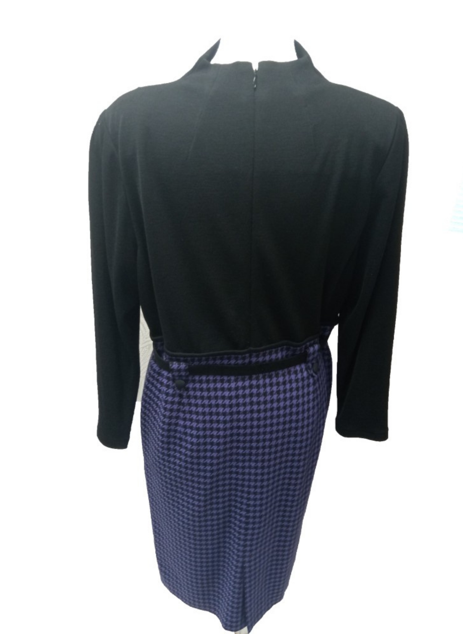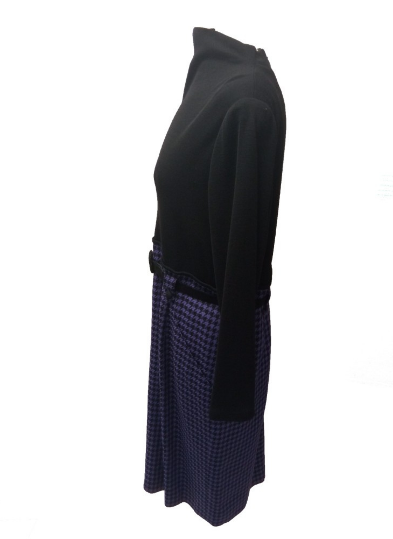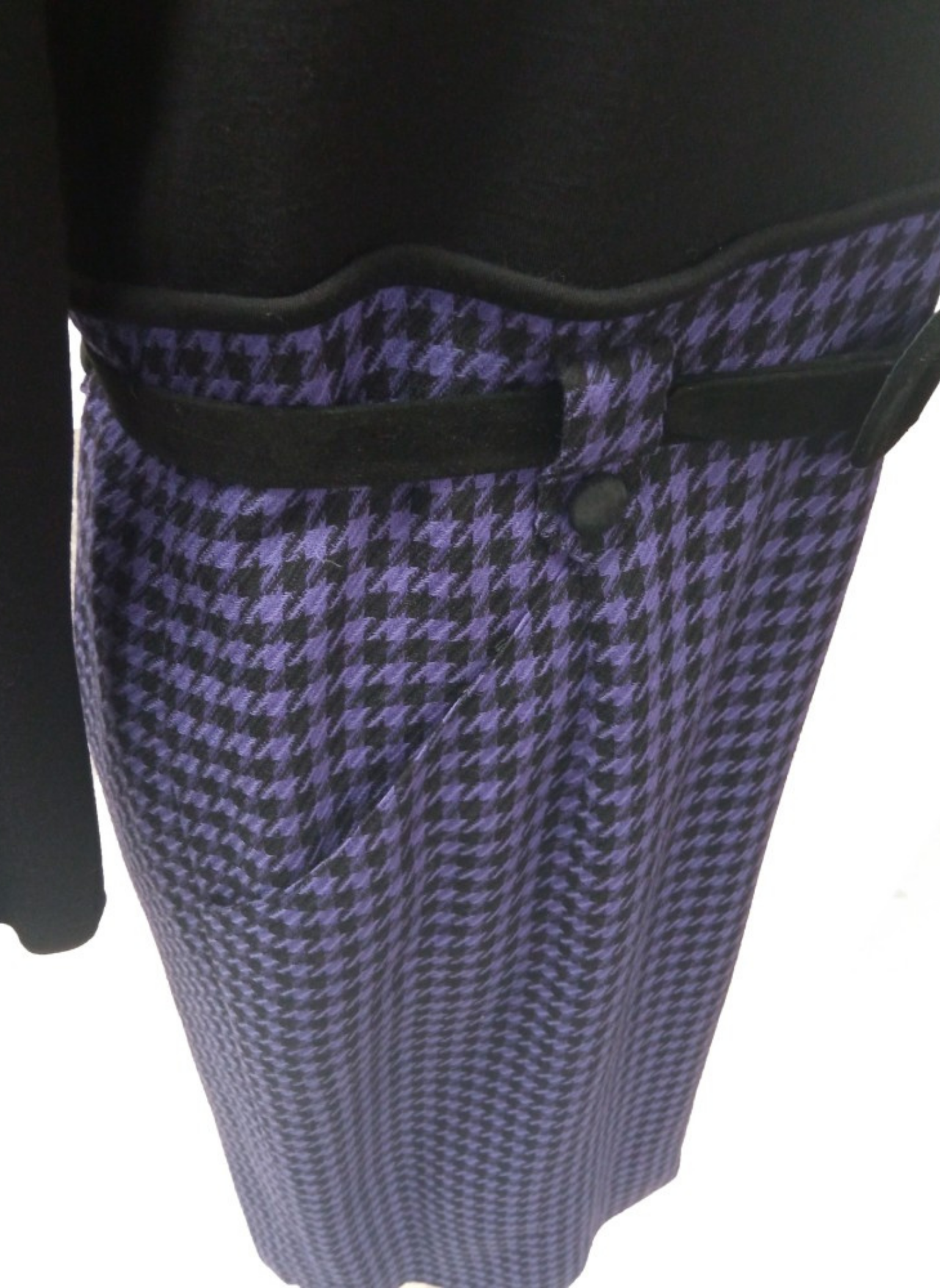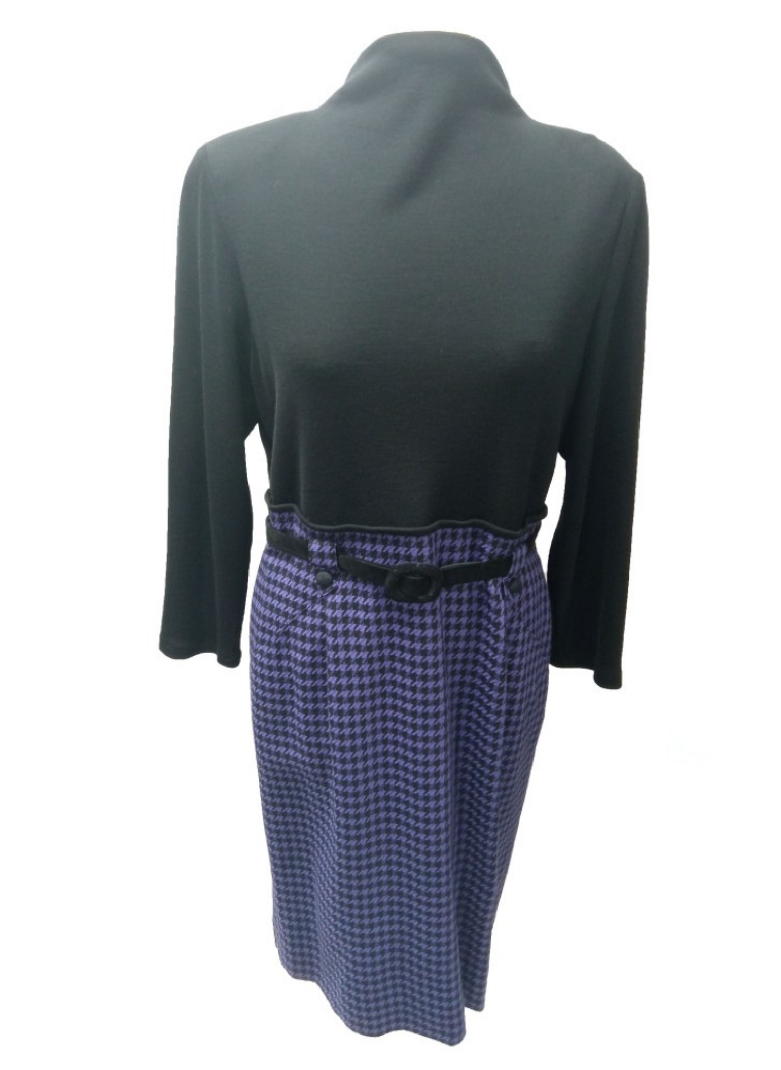 Jun Ashida brand black knit dress with purple houndstooth skirt with plaid. Contains a slightly damaged black suede belt. Zipper on the back and small opening.
