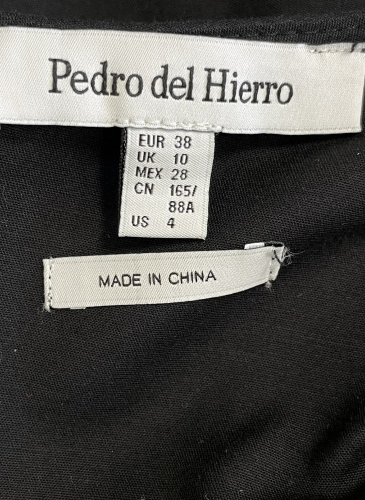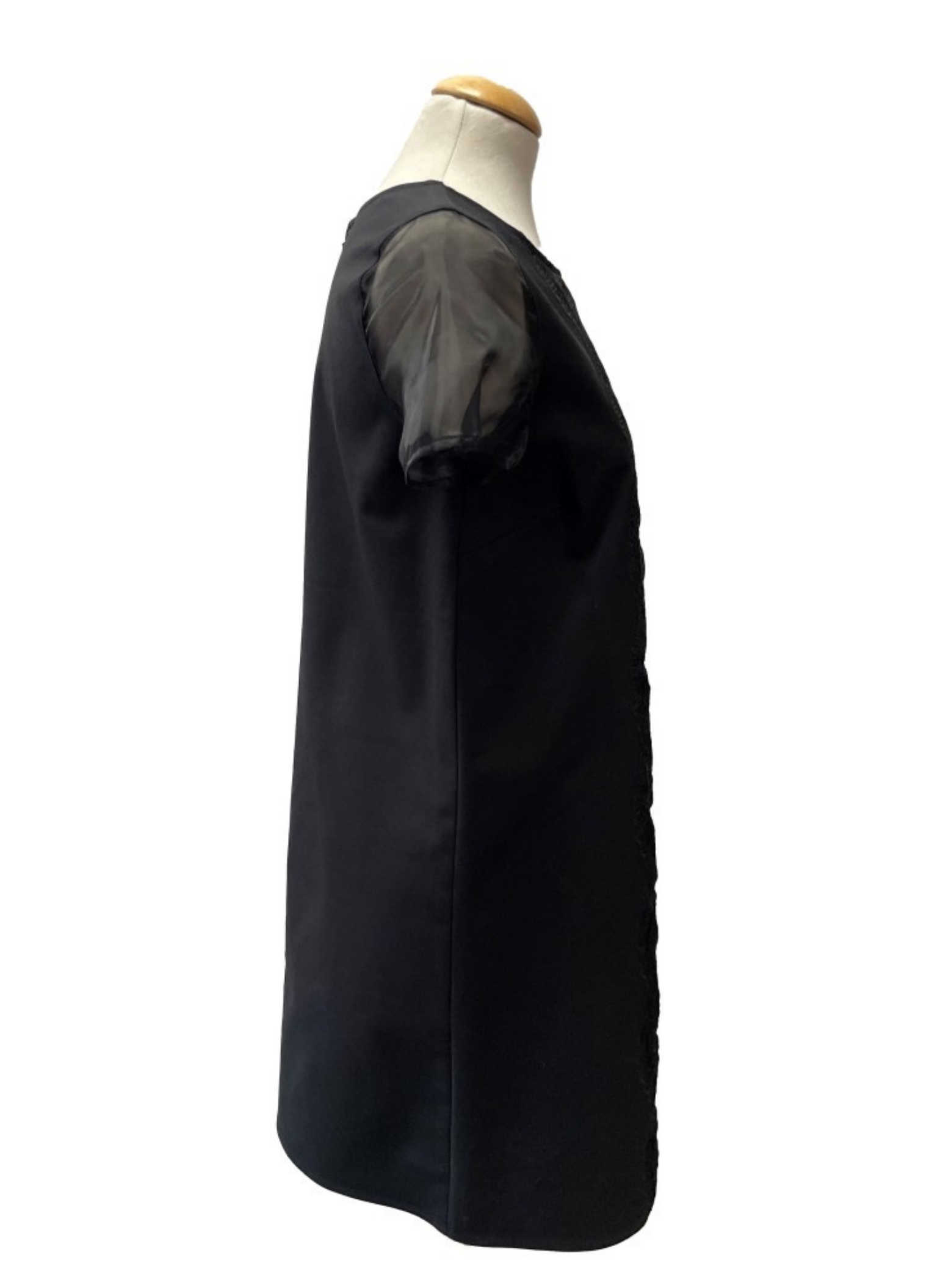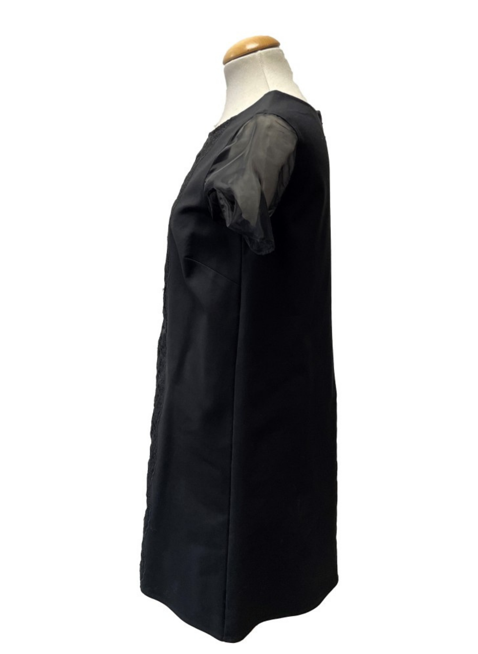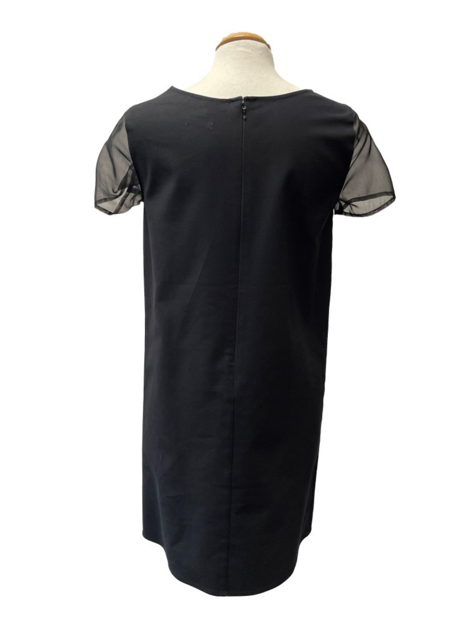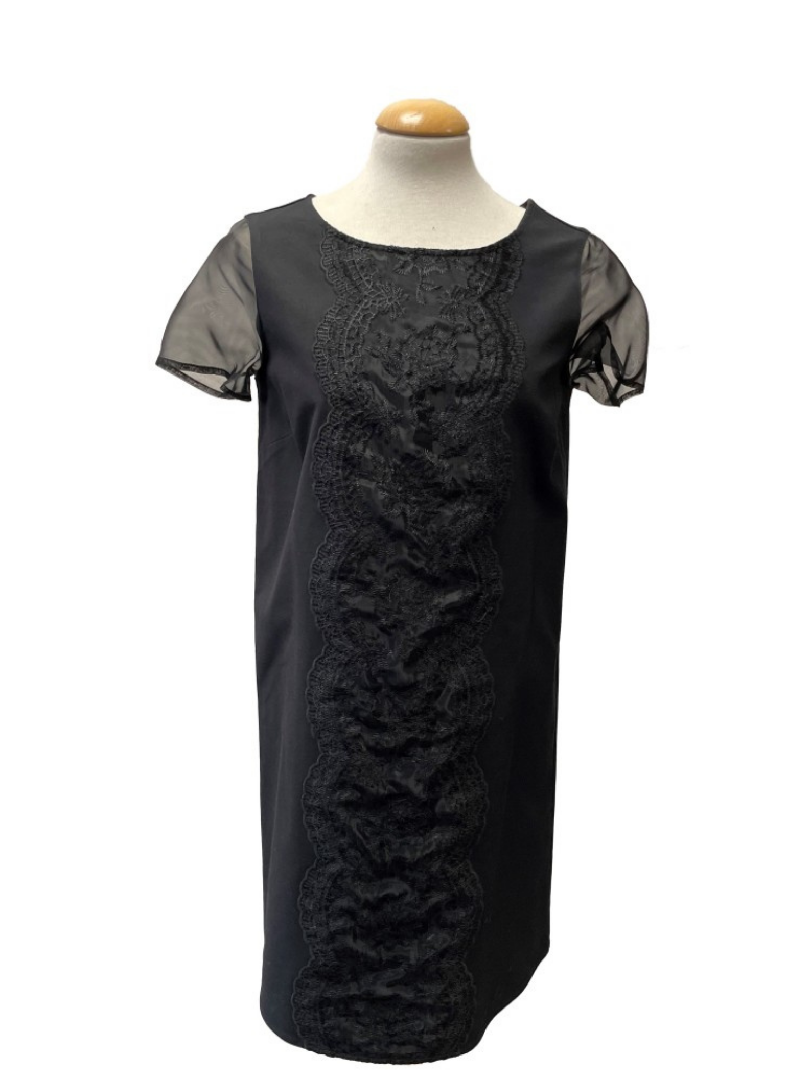 Black dress from the Pedro del Hierro brand with sleeves and central organza lace. It is a size 38. This dress does not show any signs of wear. It is made of 100% polyester.