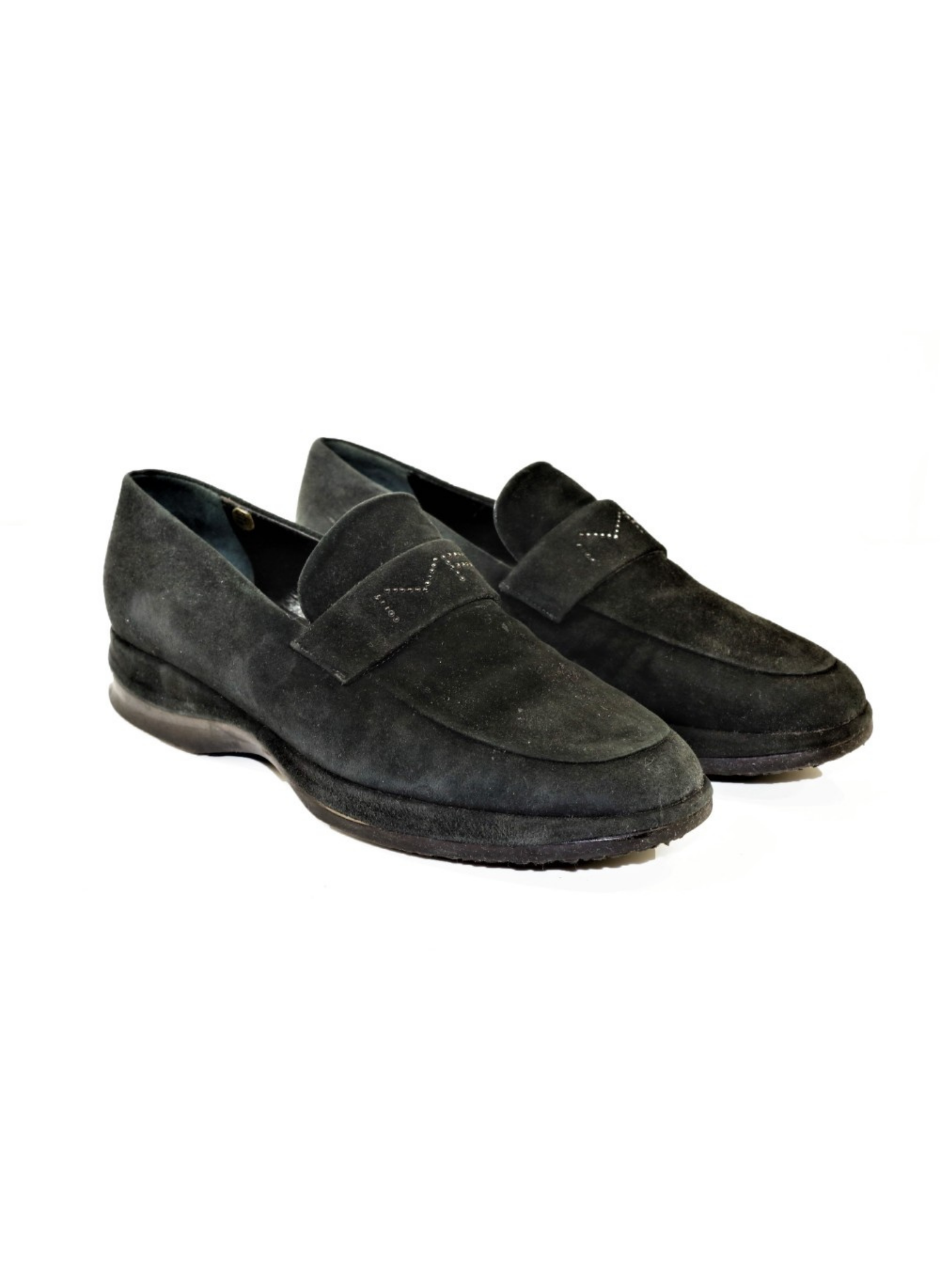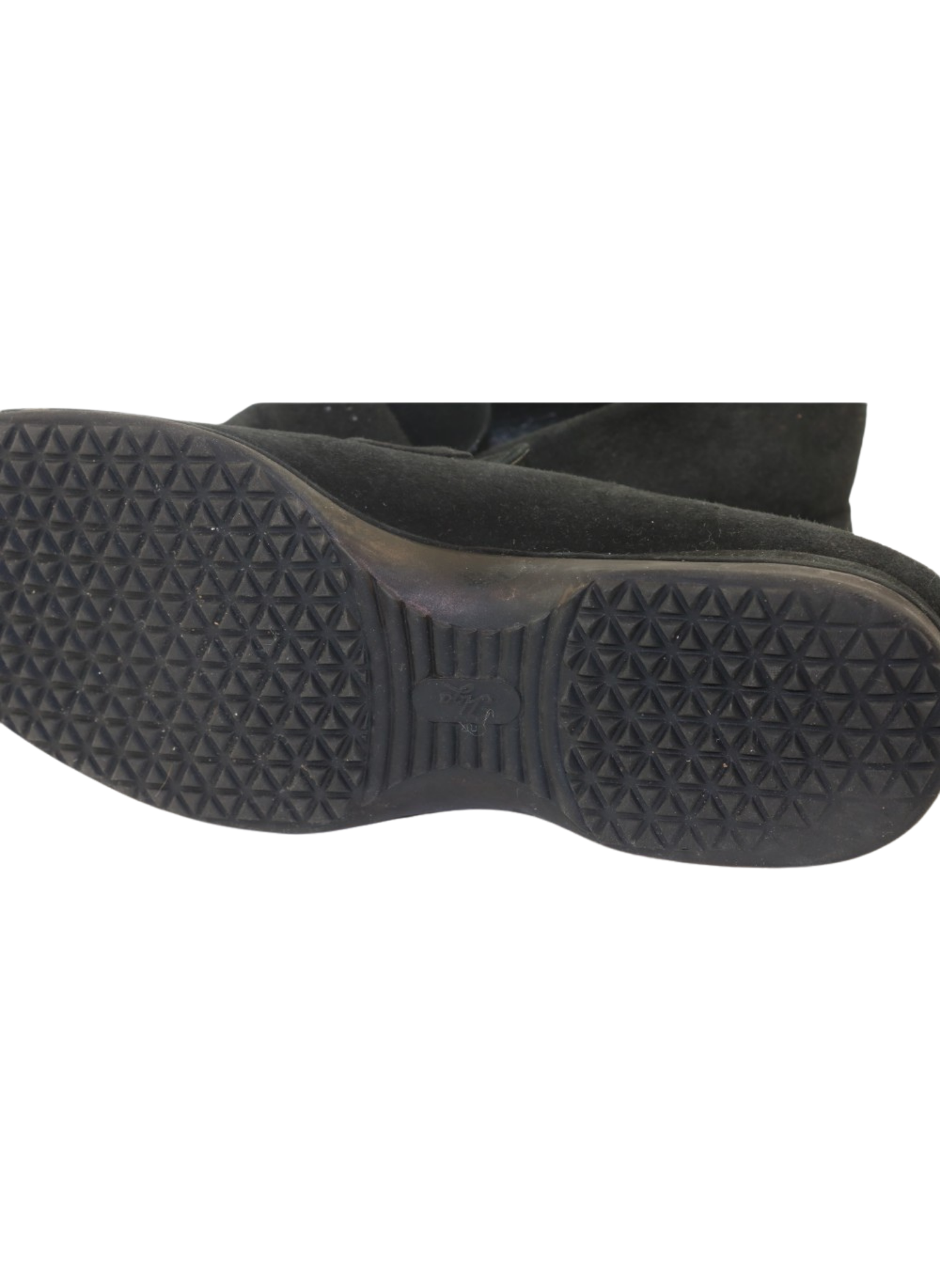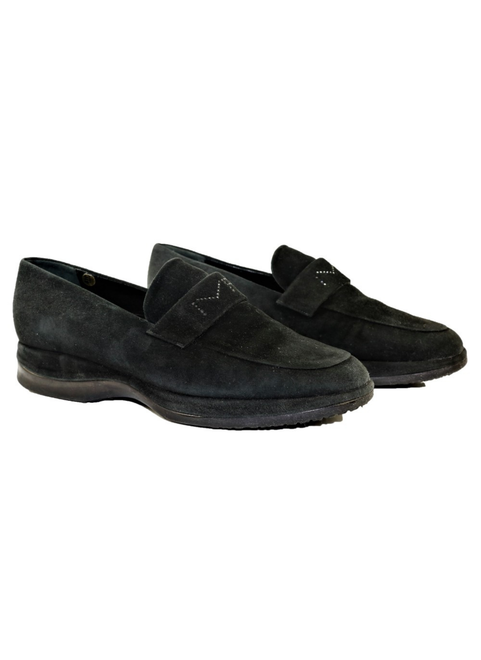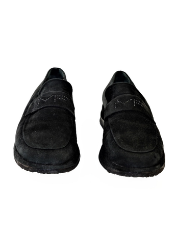Mocasines de la marca Maud Frizon en ante de color negro con MF en tira de ante en lengueta, con plantilla de cuero y suela de goma. Son una talla 37 1/2 y suela de 1.5 cm. Estos mocasines no presentan ninguna señal de uso.