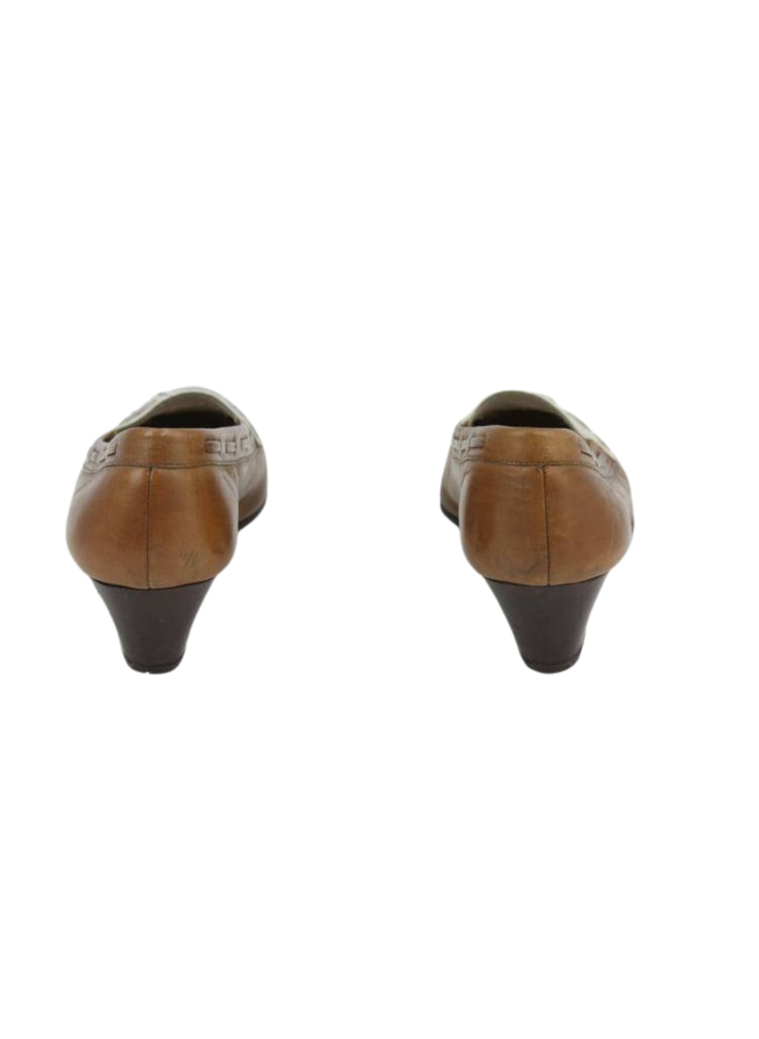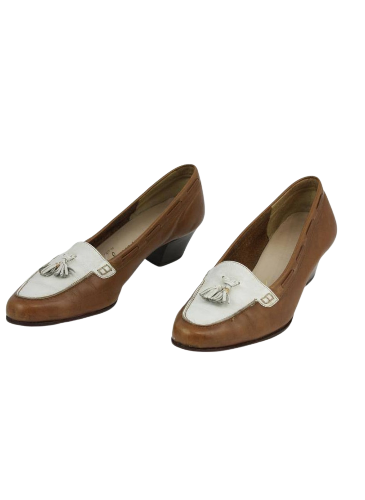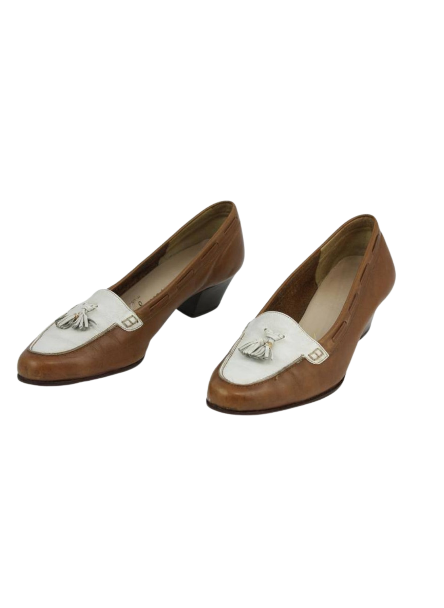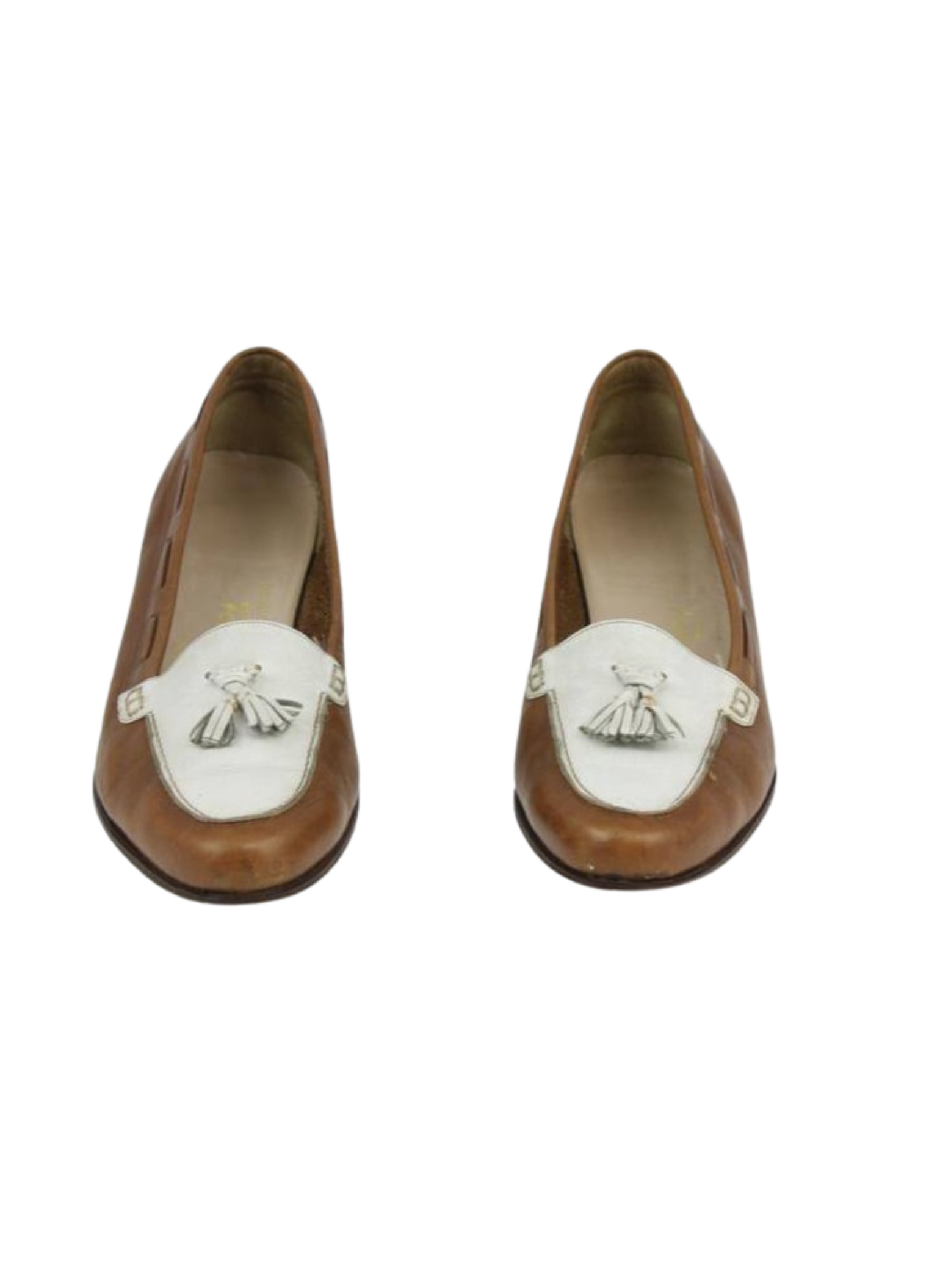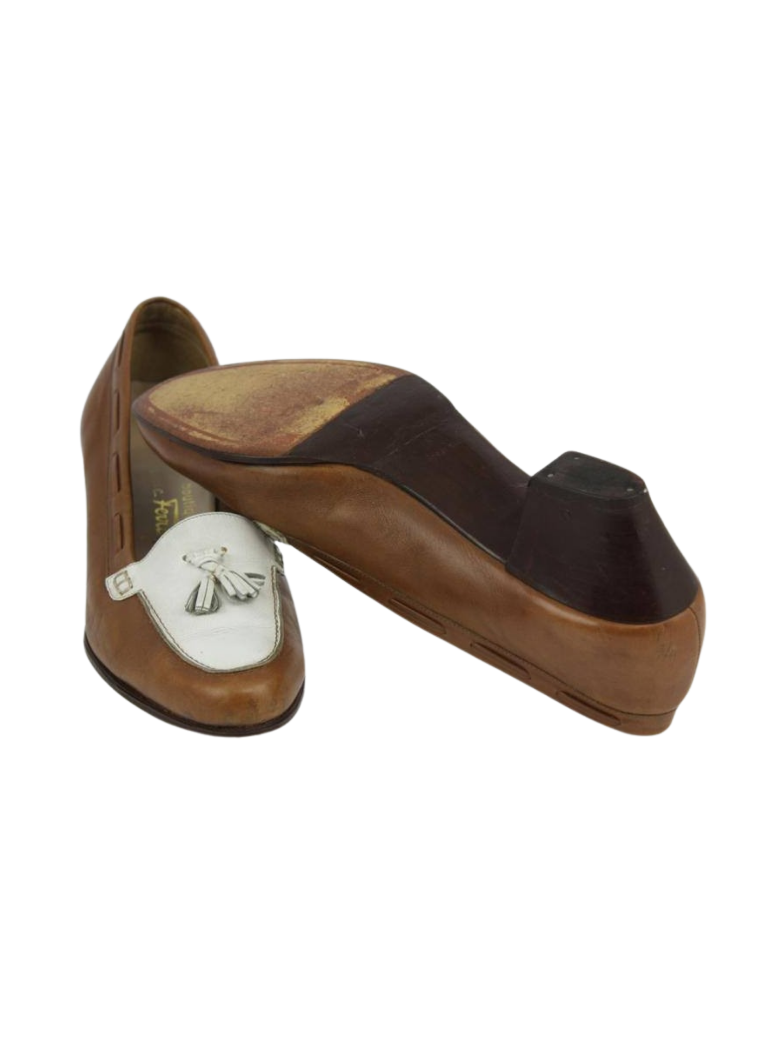 Moccasin shoes from the Salvatore Ferragamo brand with low heel leather in camel and white. It has two pompoms on the toe. These shoes show very few signs of use. They are a Size 36.