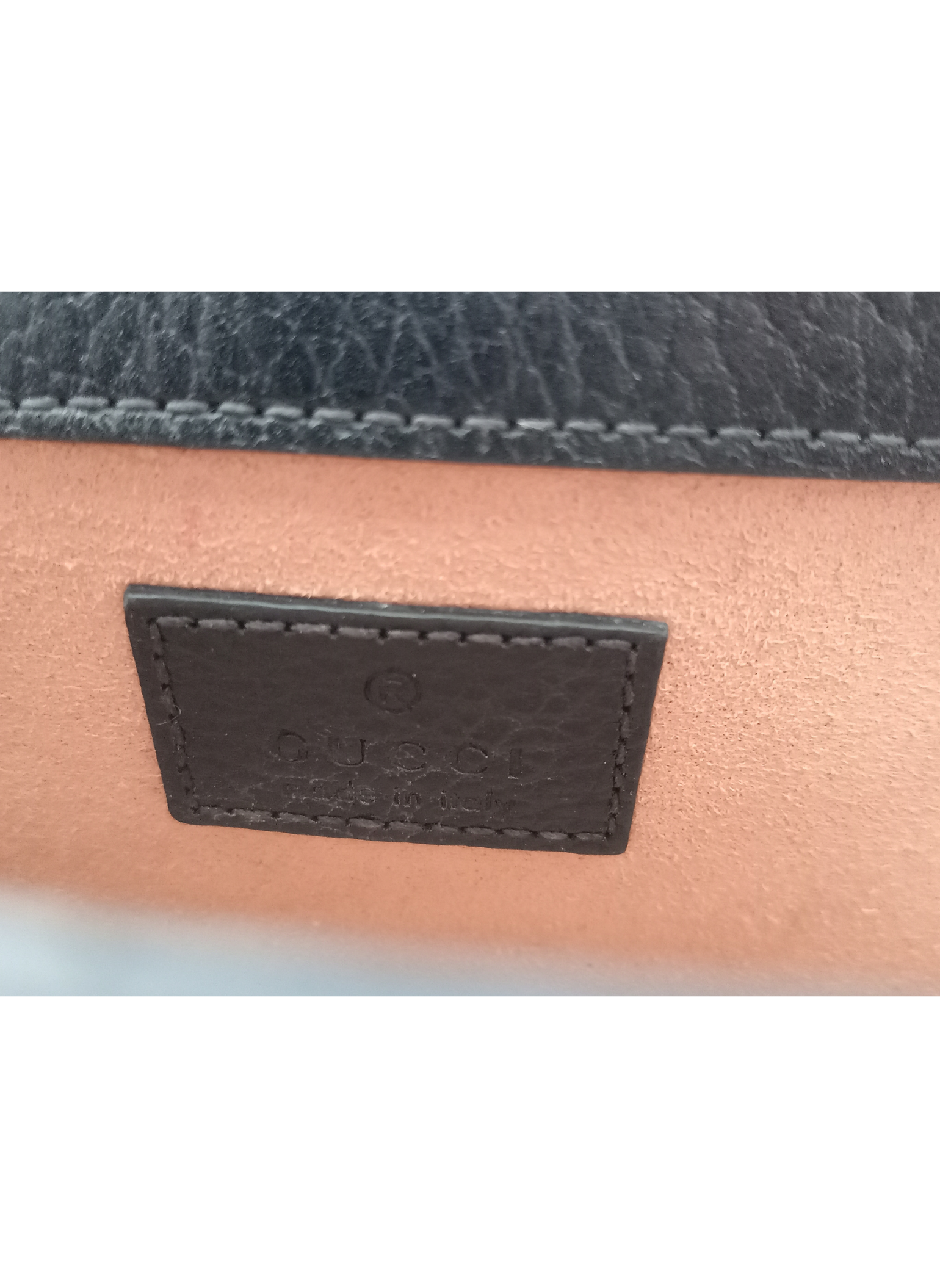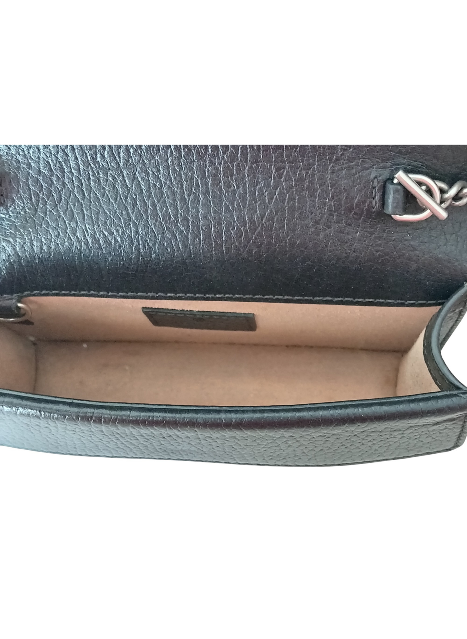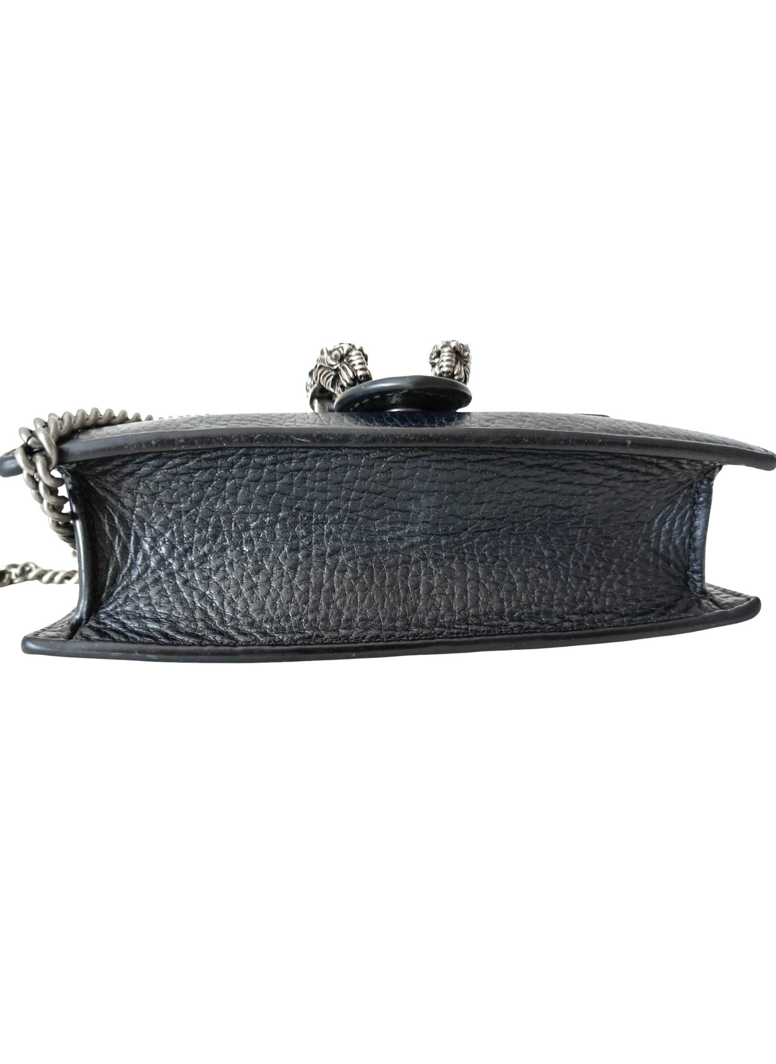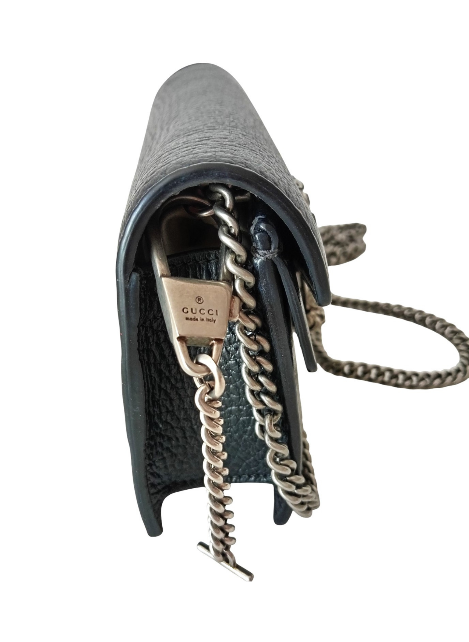 Mini bolso de Gucci,bandolera Dyonisus,de piel negra con cadena para bandolera y llavero que puede incorporarse a otro bolso mas grande.Cierre de espuela con cabeza de tigre ornamentado con cristales de Swarovski.Interior de ante beige.Piezas metalicas de color paladio.Contiene su bolsa guardapolvos y su caja.Muy buen estado.Medidas: 10 cms de alto x 16,5 cms de ancho x 4 cms de profundidad.