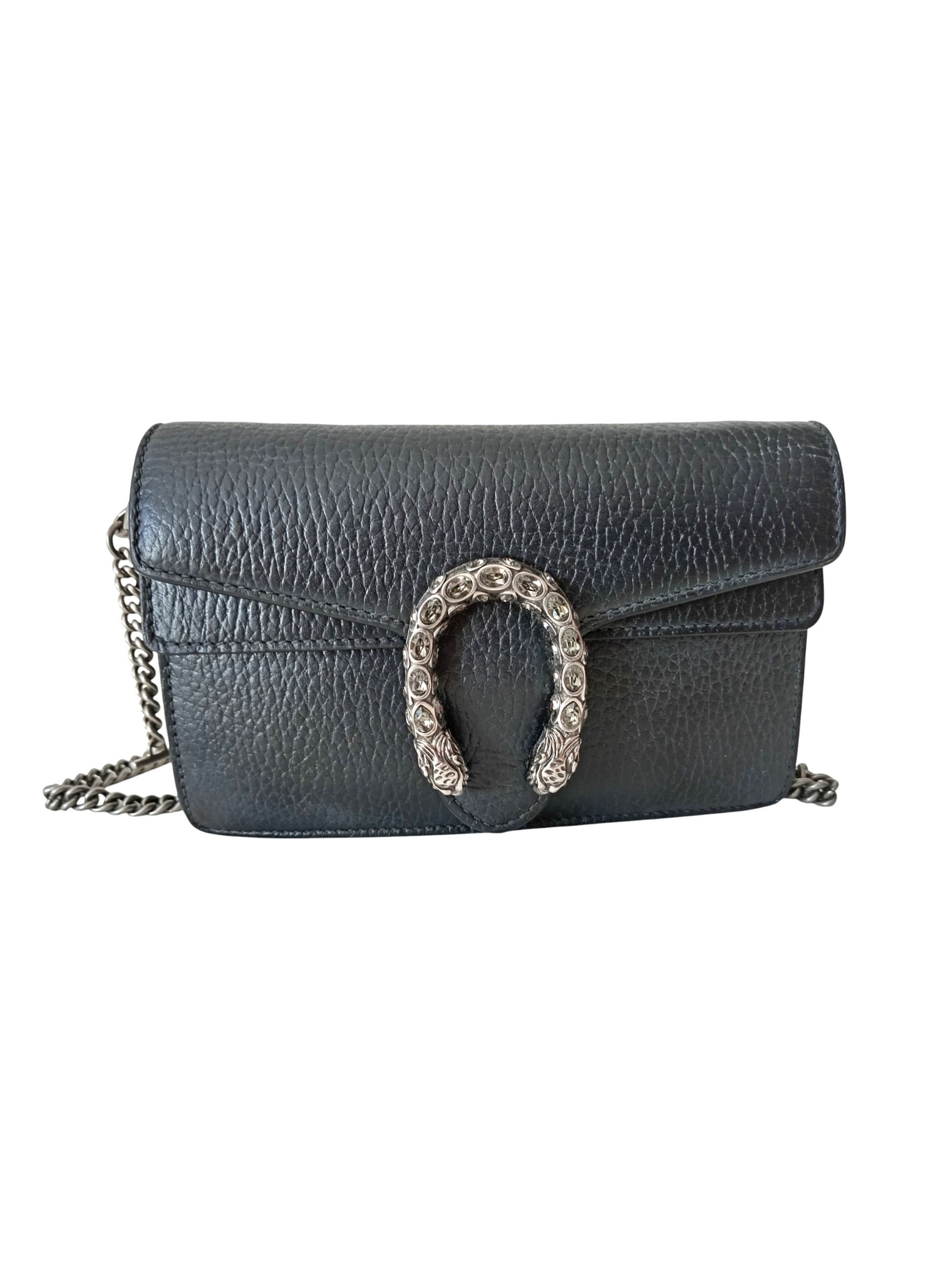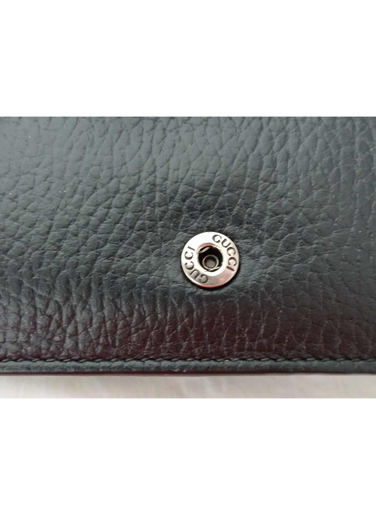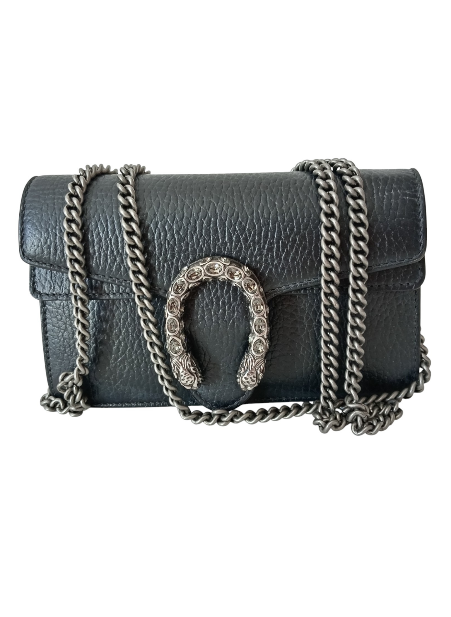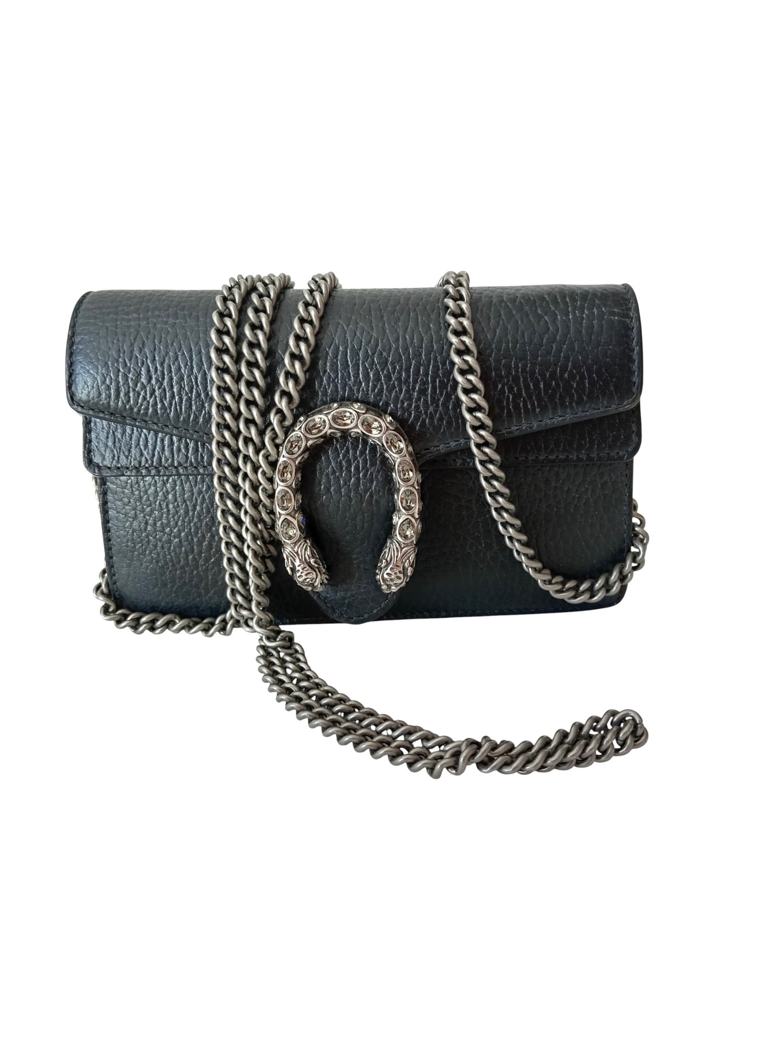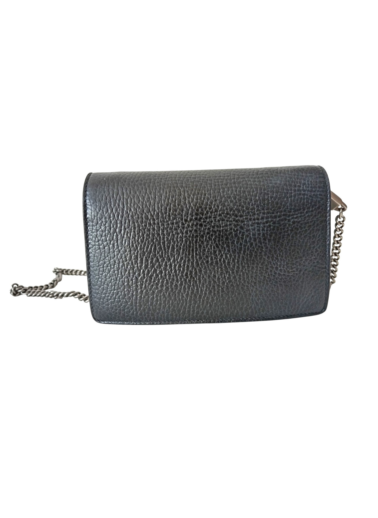 Mini bolso de Gucci,bandolera Dyonisus,de piel negra con cadena para bandolera y llavero que puede incorporarse a otro bolso mas grande.Cierre de espuela con cabeza de tigre ornamentado con cristales de Swarovski.Interior de ante beige.Piezas metalicas de color paladio.Contiene su bolsa guardapolvos y su caja.Muy buen estado.Medidas: 10 cms de alto x 16,5 cms de ancho x 4 cms de profundidad.