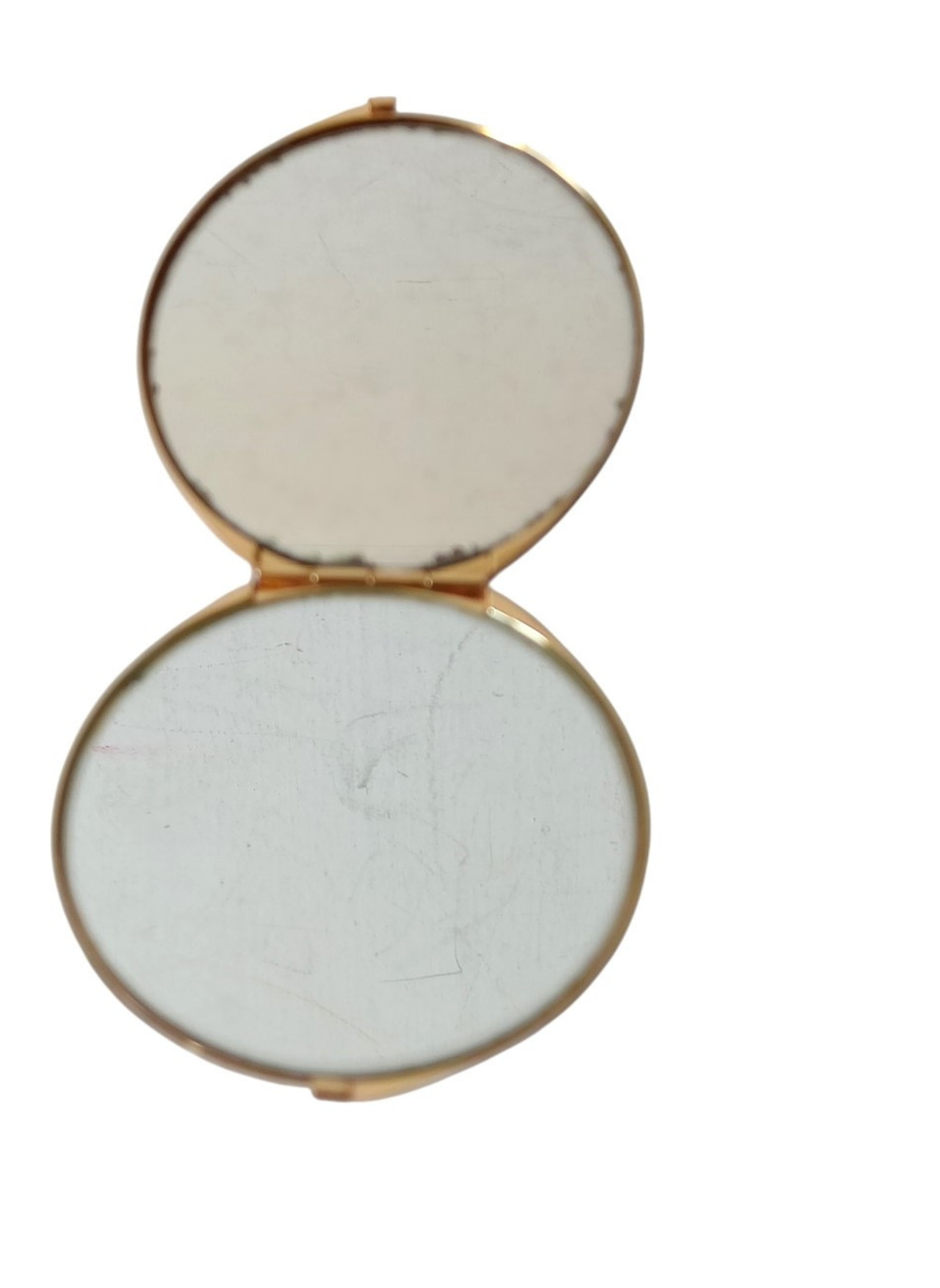 Espejo para bolso de Loewe,Vintage.De metal dorado con piel de cocodrilo marrón,la parte de abajo metal dorado matizado.Interior dos espejos,uno normal y otro de aumento.Muy buen estado.Medidas: 7 cms de circunferencia.