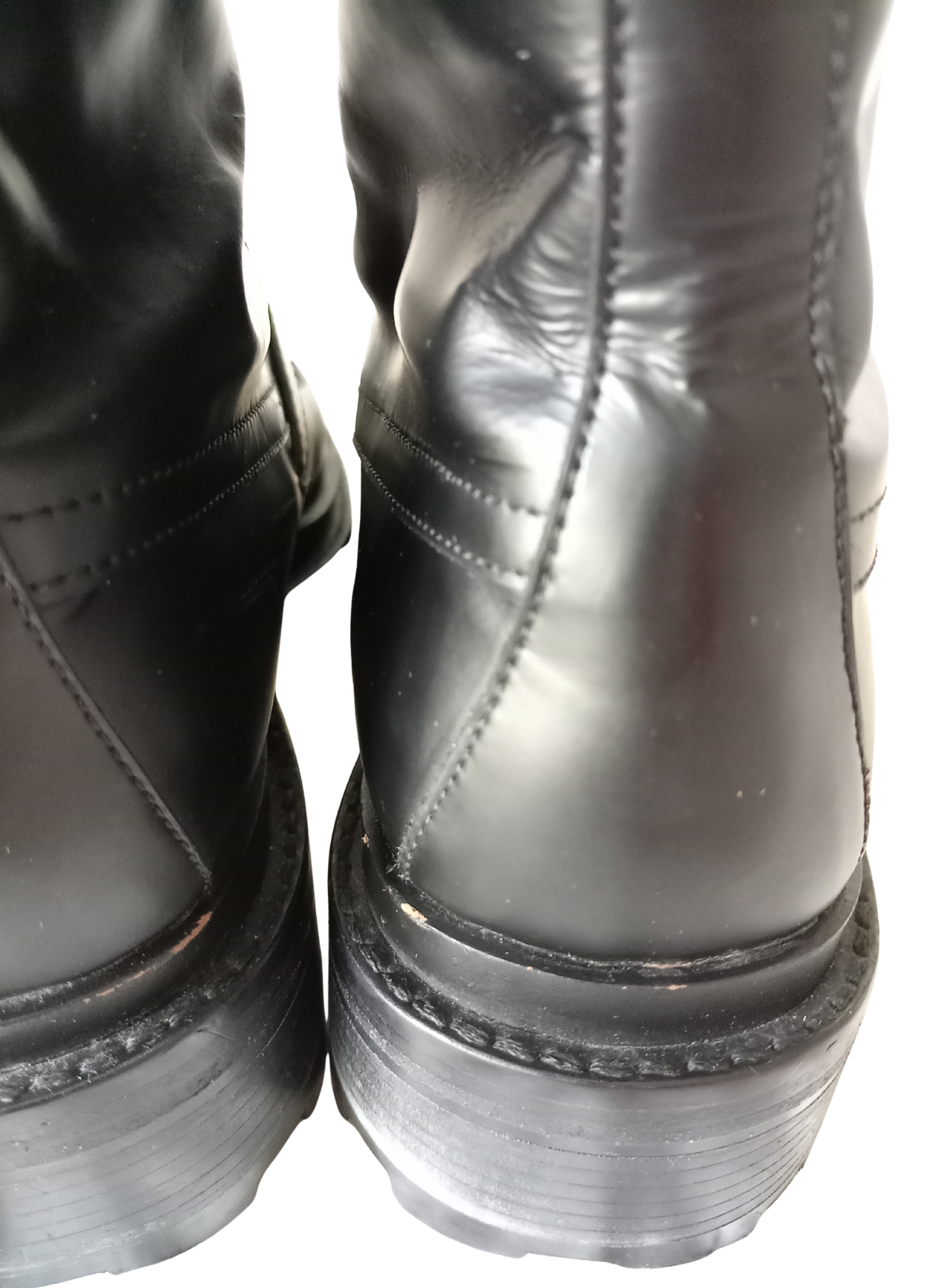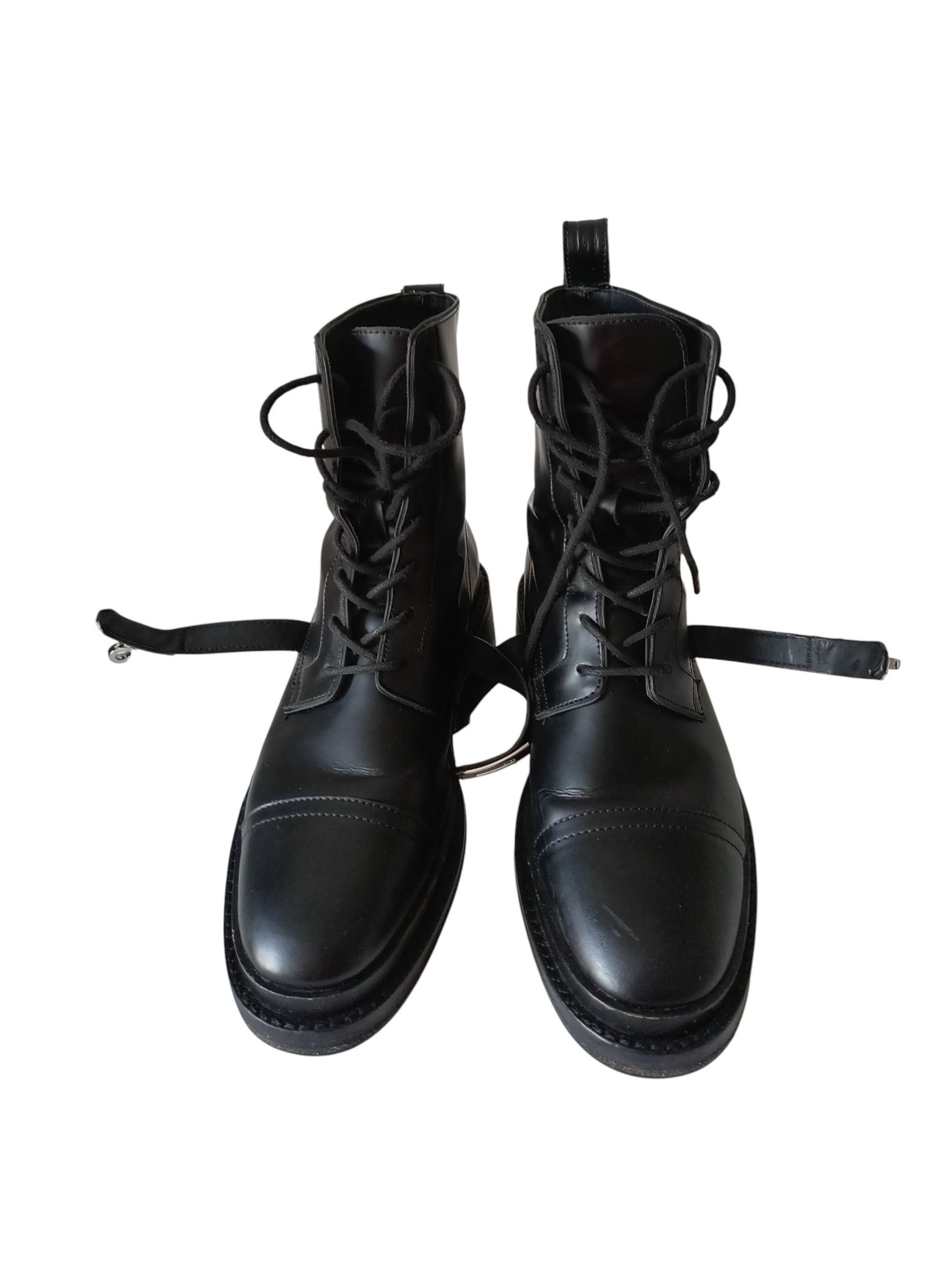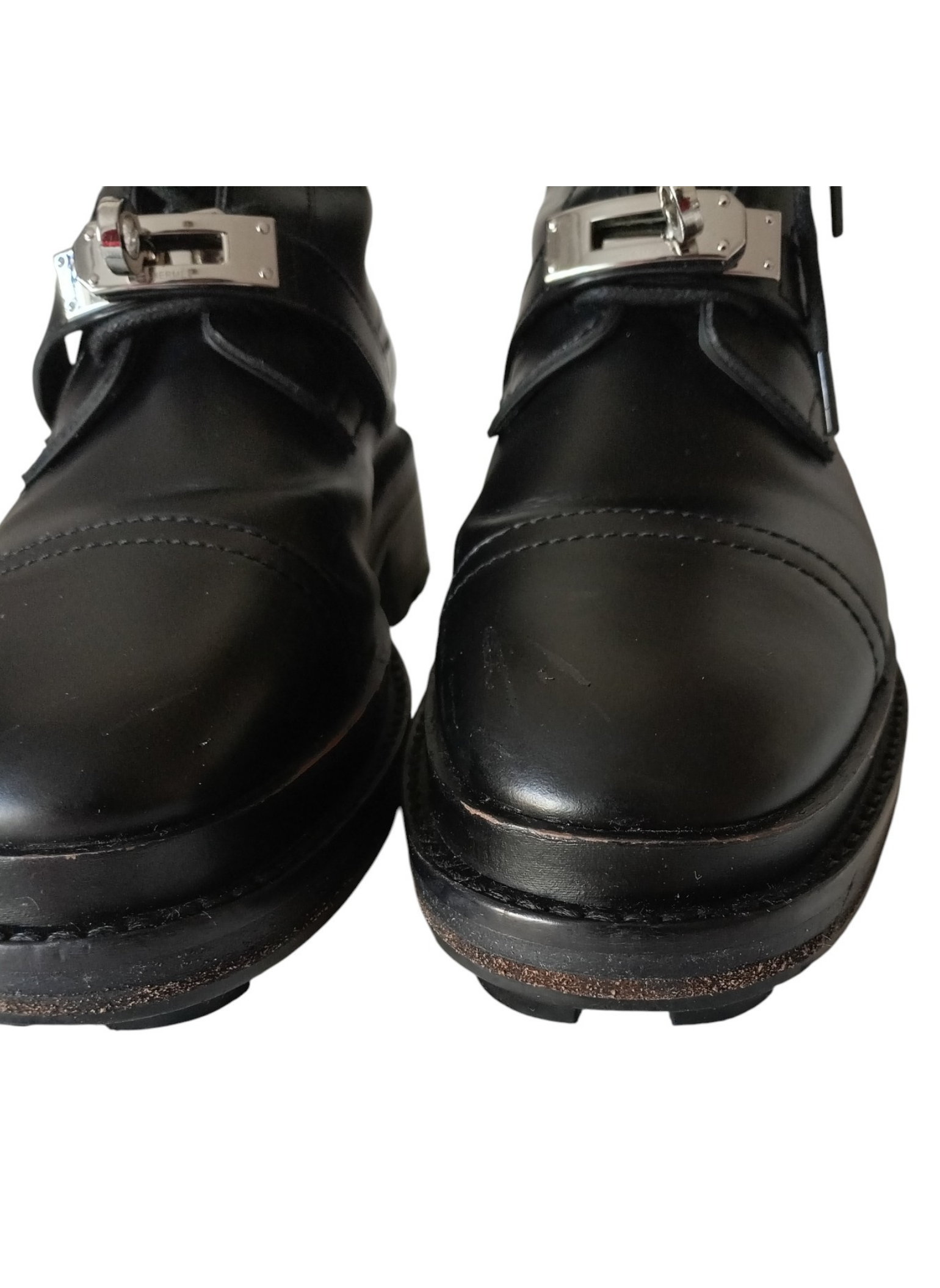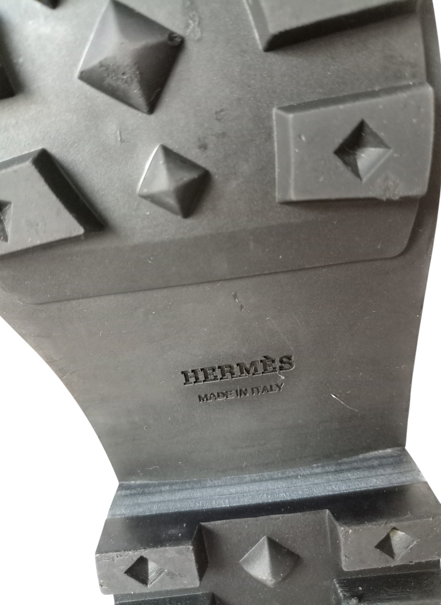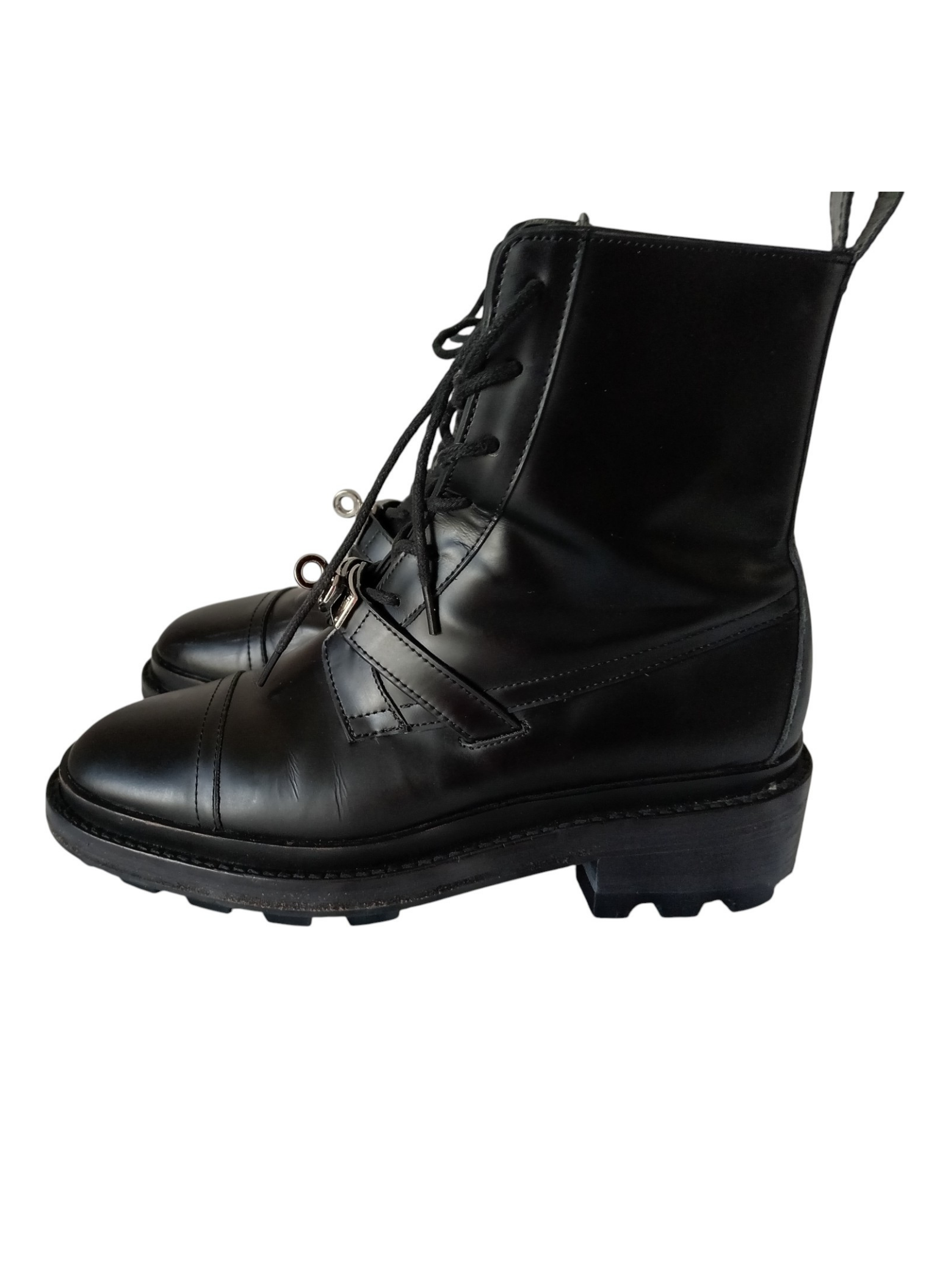 Botas tobilleras o botines de Hermés,modelo Funk.Hechas con piel de becerro,negras,cierra con cordones y remata con cierre metalico Kelly en paladio.Suela de goma negra con muescas para mayor firmeza.Son un numero 37.Estan en muy buen estado exterior,la suela de dentro un poco desgastada.Mide 20 cms de alta.