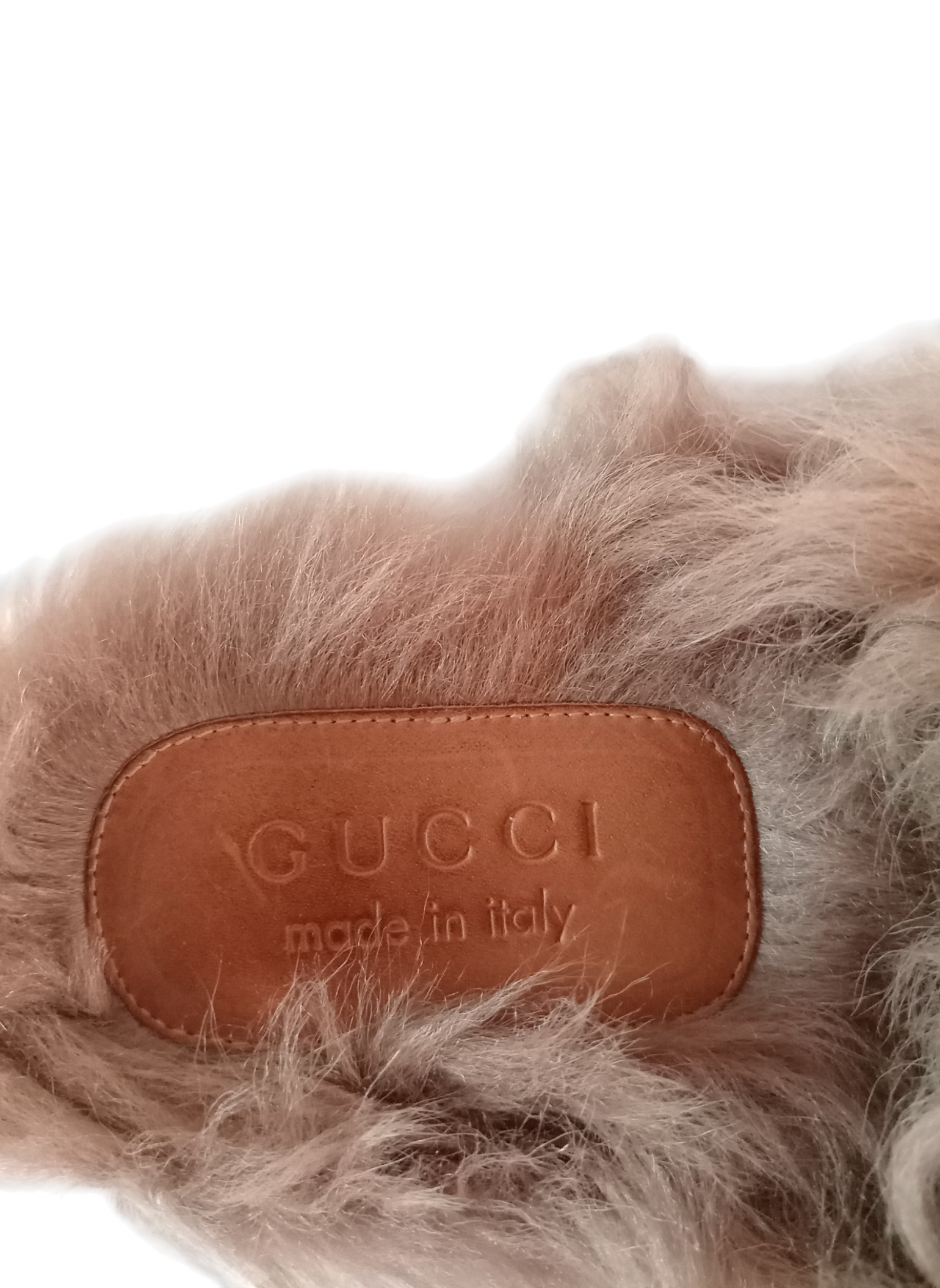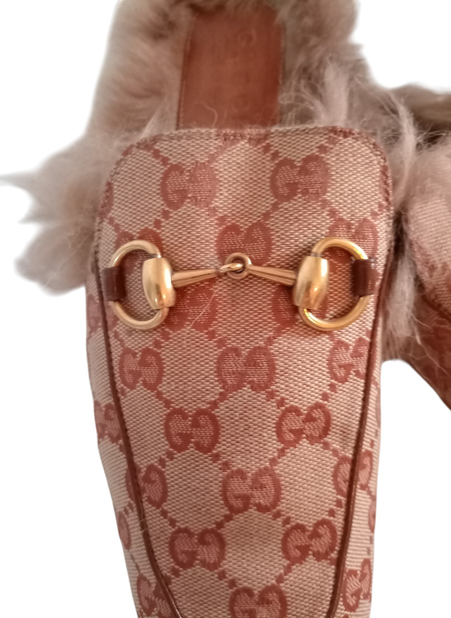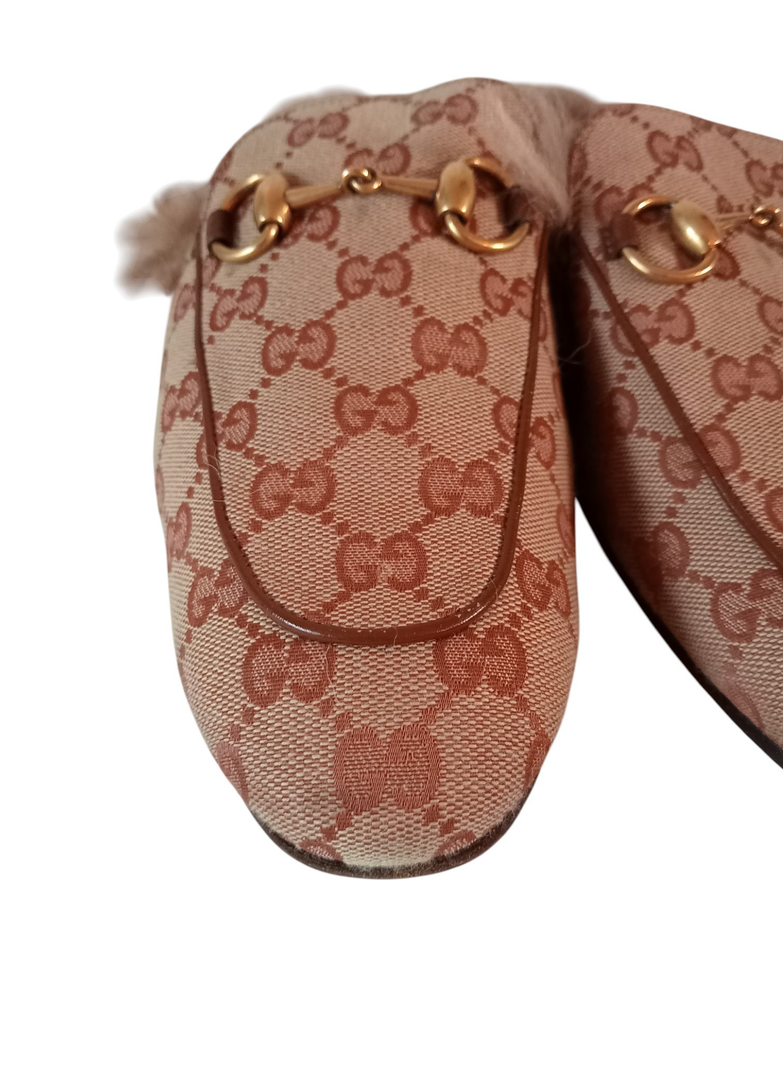 Zapatos Mules de Gucci,modelo Princetown con forro de piel.Logotipo GG en lona marron y beige,detalle horsebite en metal dorado,tipico de la firma. Son un numero 39.Estan usadas pero en buen estado.