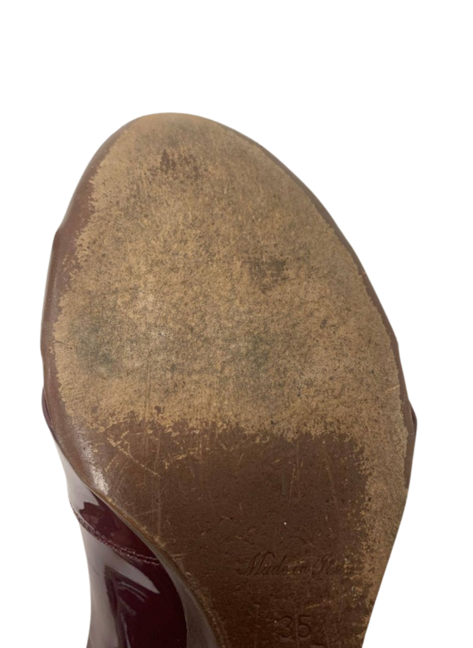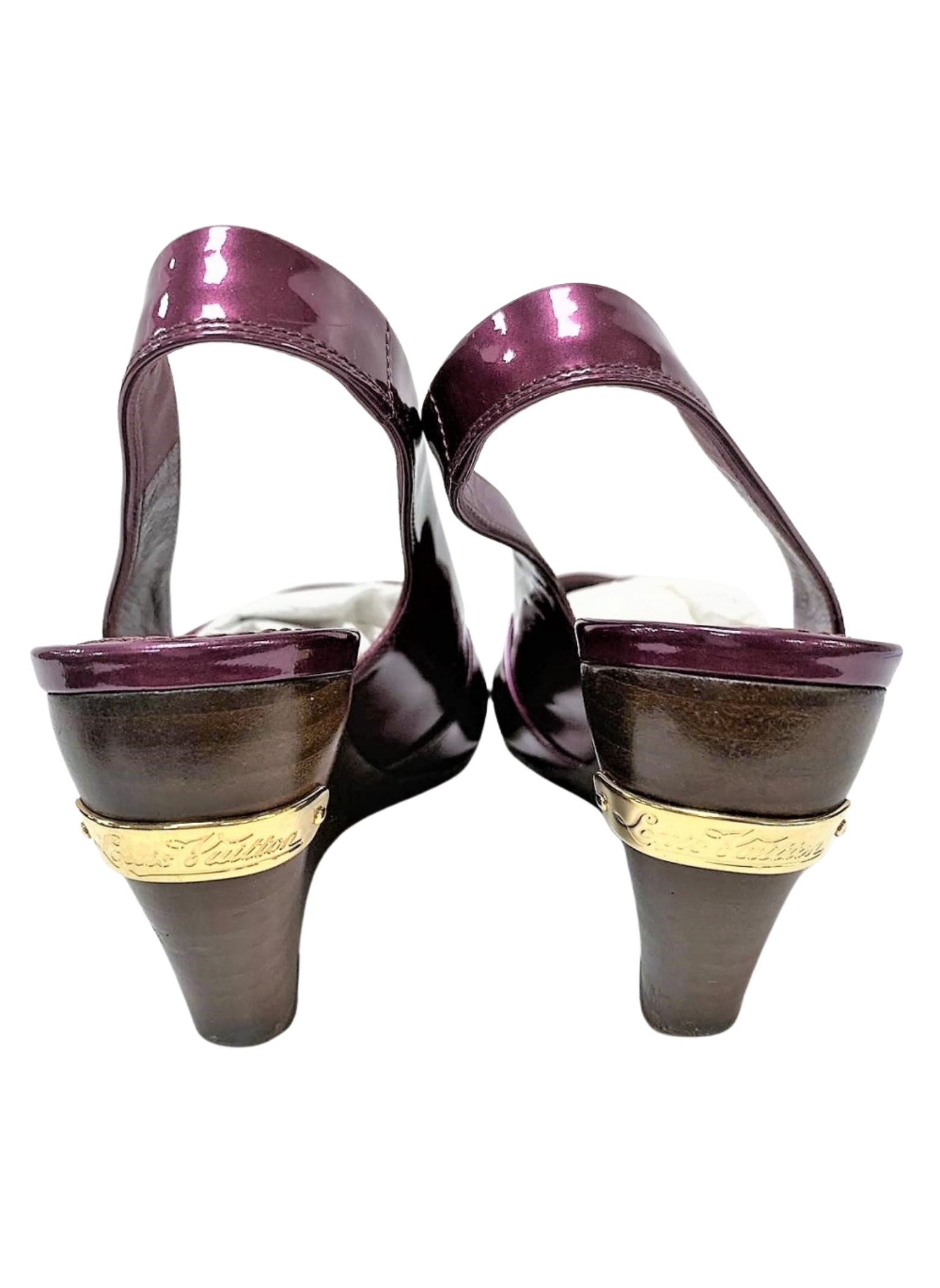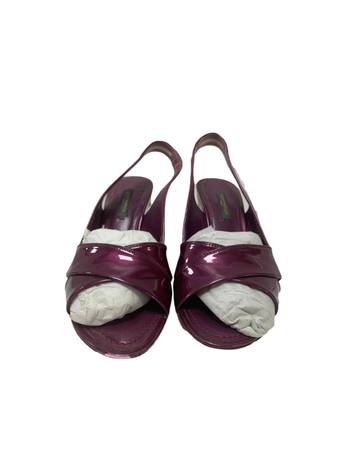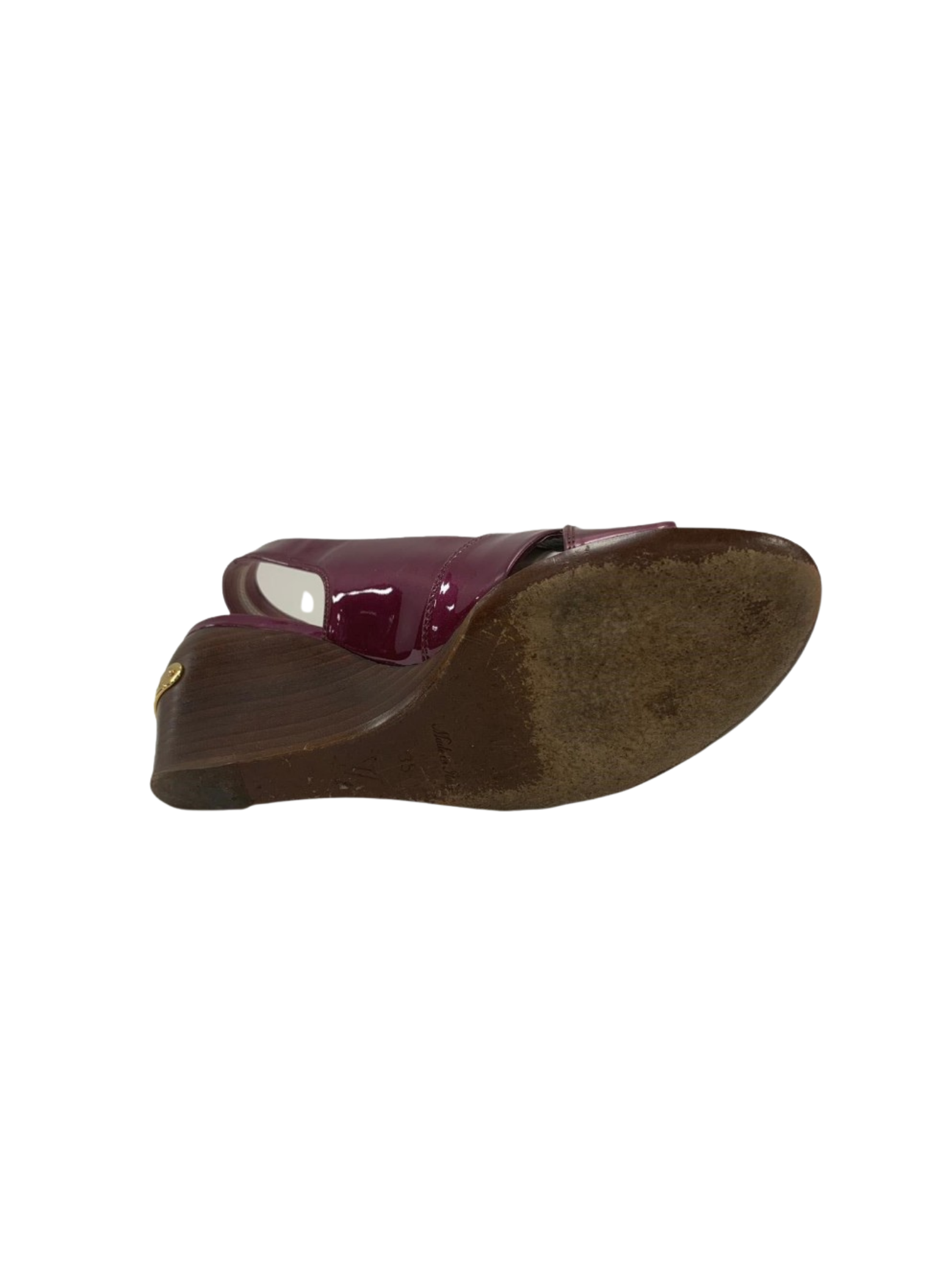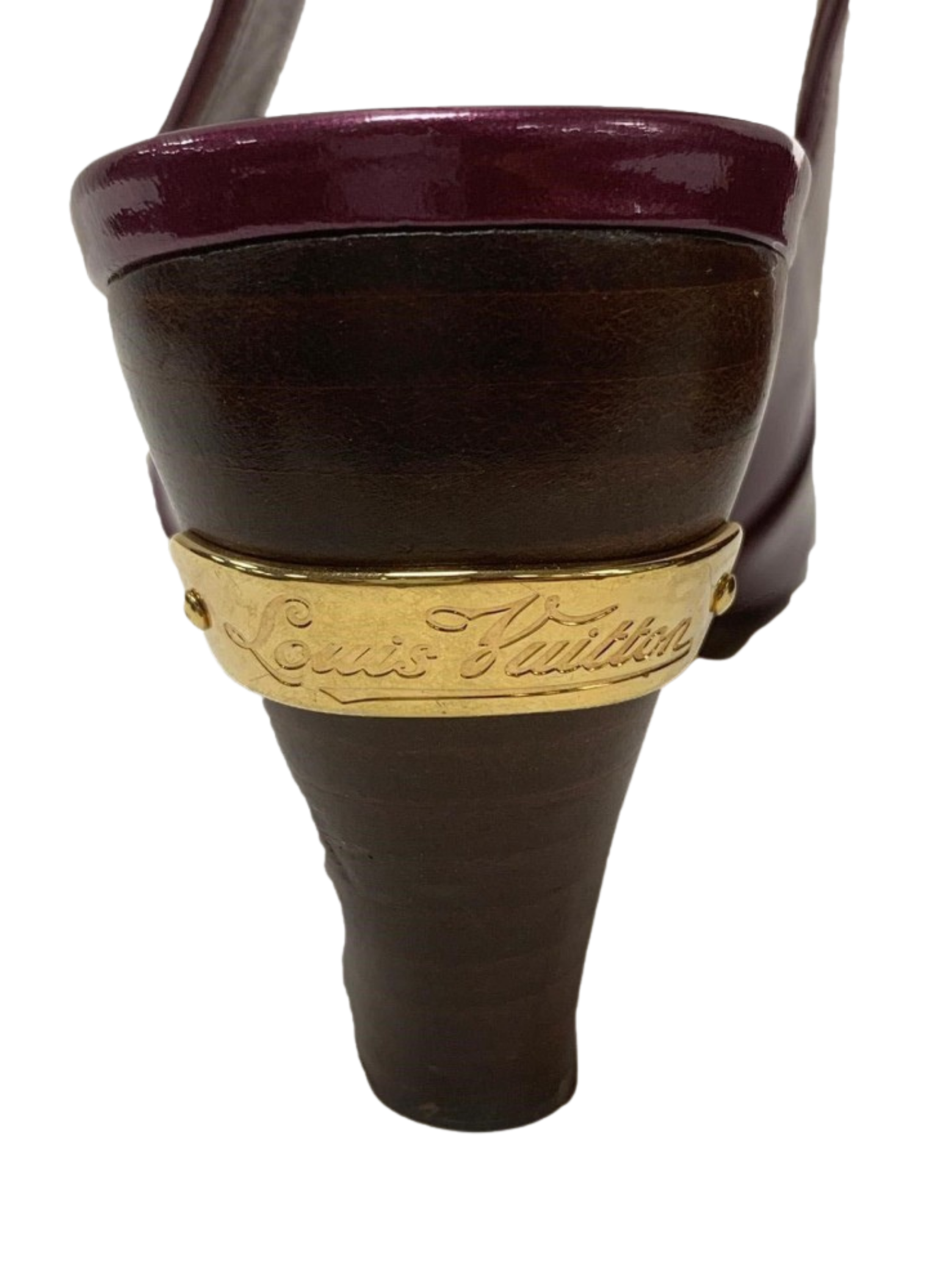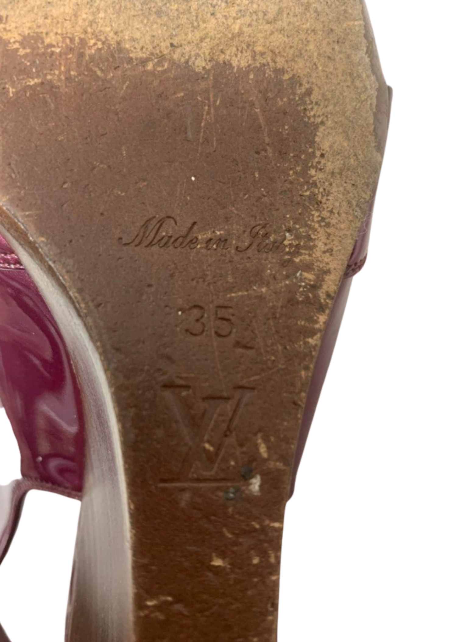 Sandalias de cuña de la marca Louis Vuitton de charol morado con tiras gordas cruzadas en la parte frontal. Son de estilo sandalias con tacón de madera con chapa dorada de Louis Vuitton.Son una talla 35.El tacón mide 7cm. Estos zapatos no presentan ningún tipo de señal de uso.