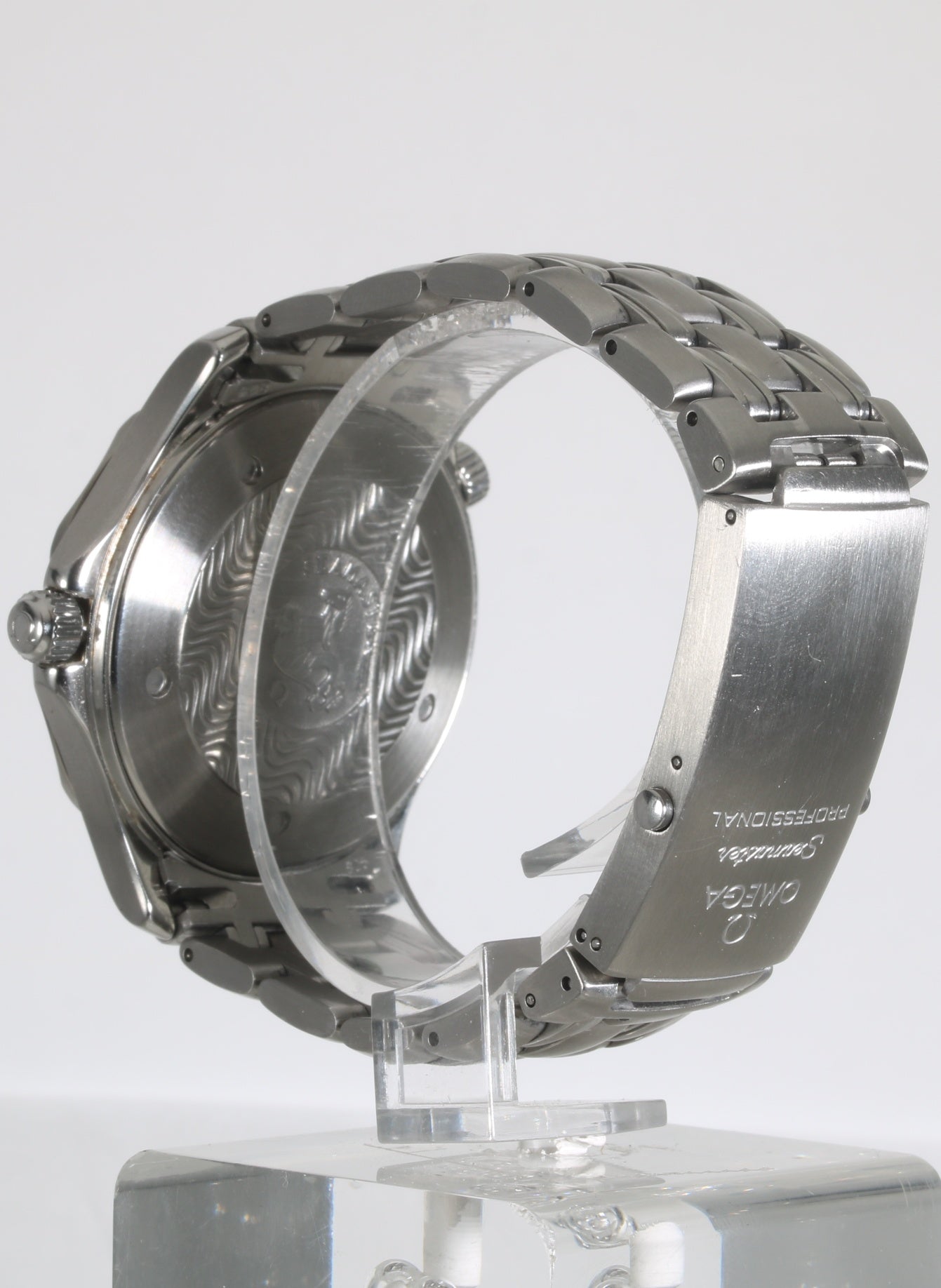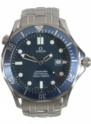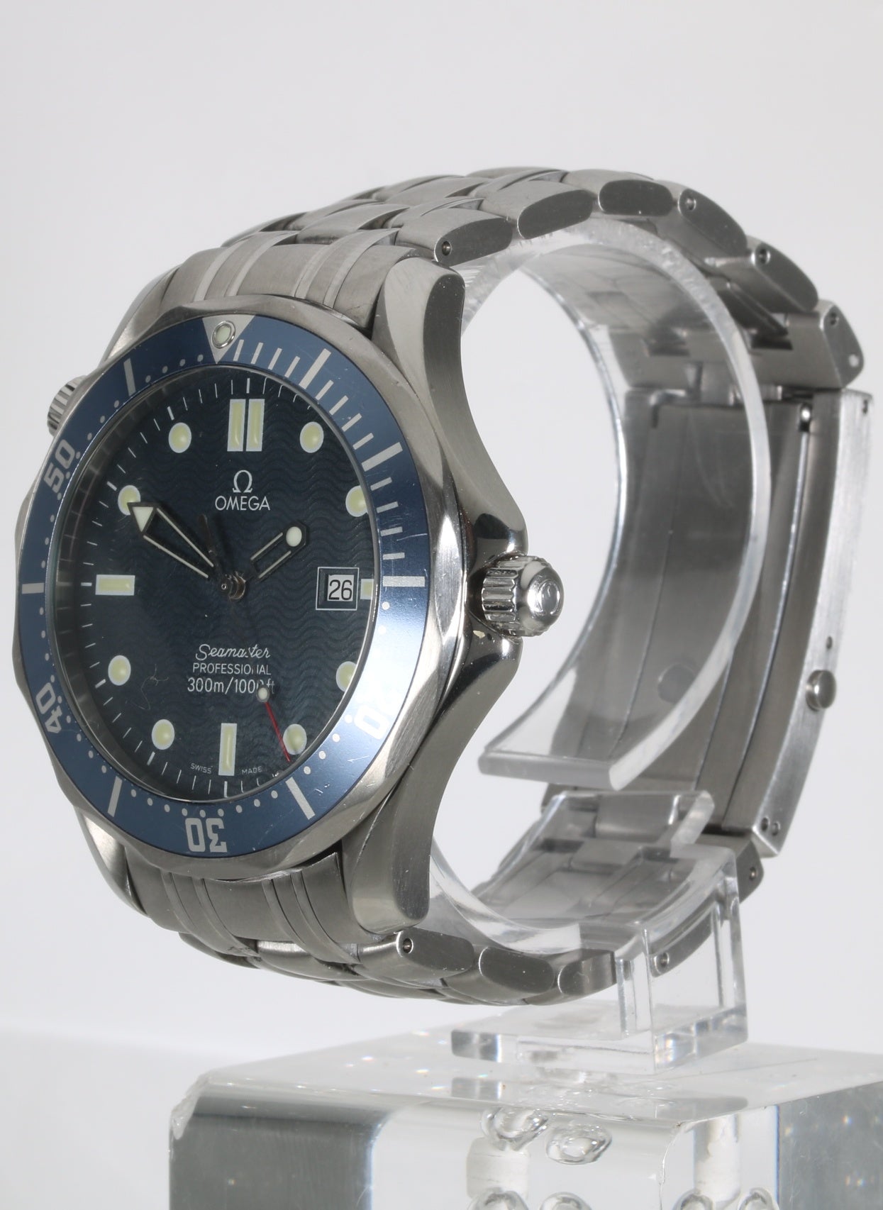 Omega modelo Seamaster Professional con caja de acero de 41mm y cristal de zafiro. Movimiento de cuarzo con pila nueva y función de fecha. Esfera azul con textura ondulada en perfecto estado. Correa original Omega de acero. El reloj está en muy buen estado sin señales de uso como se puede ver en las fotografías.