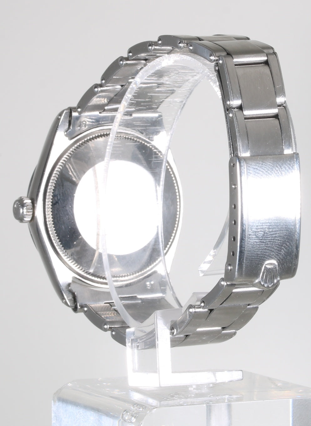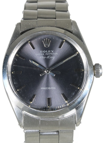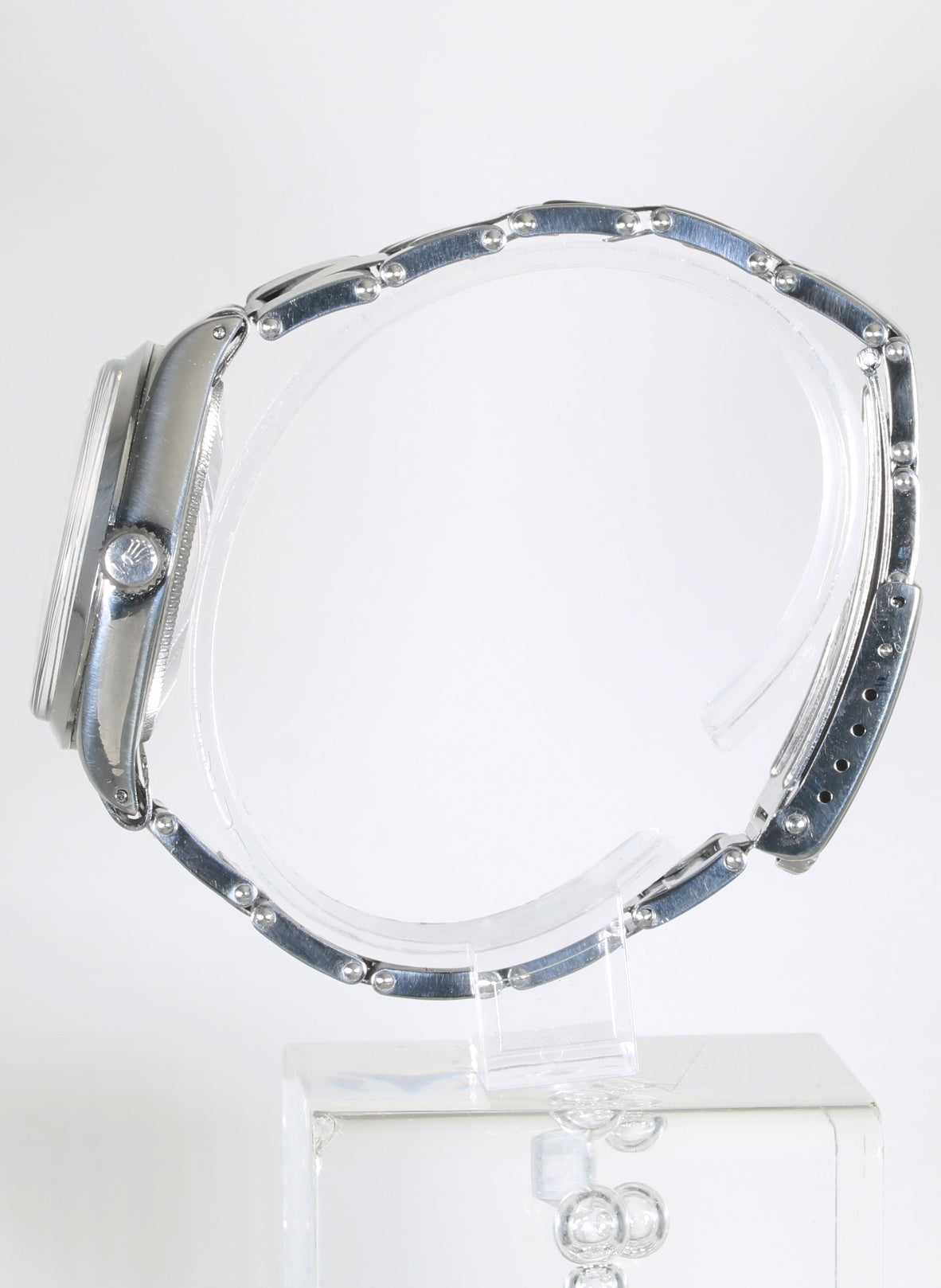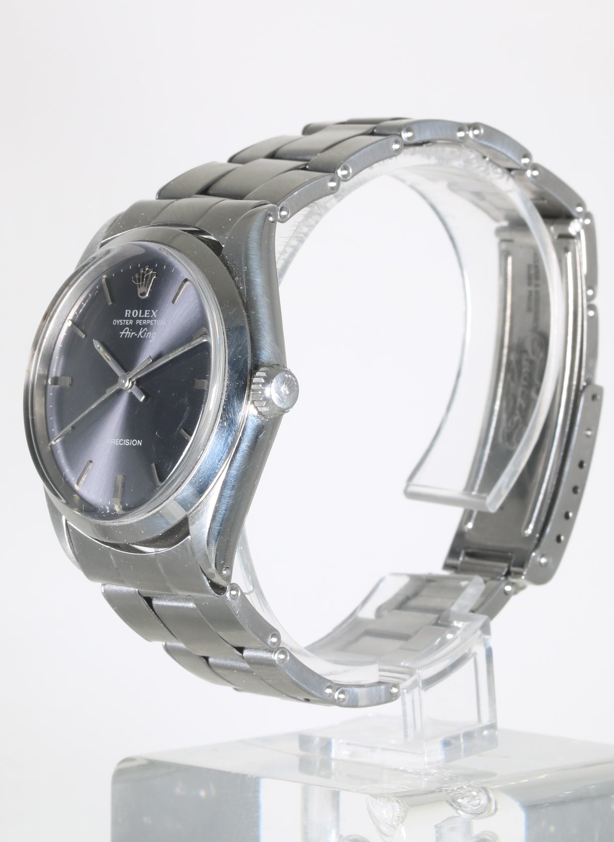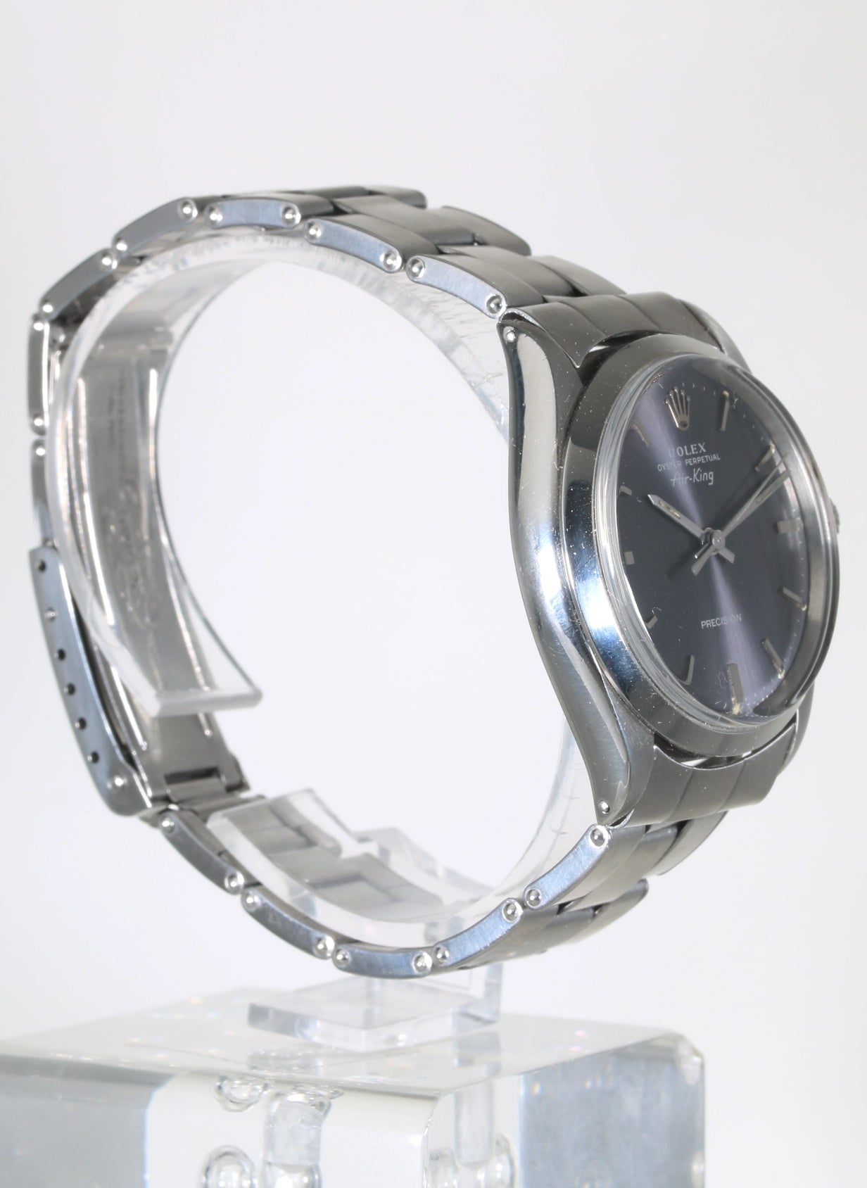 Rolex modelo Air-King referencia 5500 de 1968 con caja de acero de 34mm y cristal de plexiglass. Movimiento automático revisado. Atractiva esfera gris en muy buen estado. Brazalete de época original Rolex.