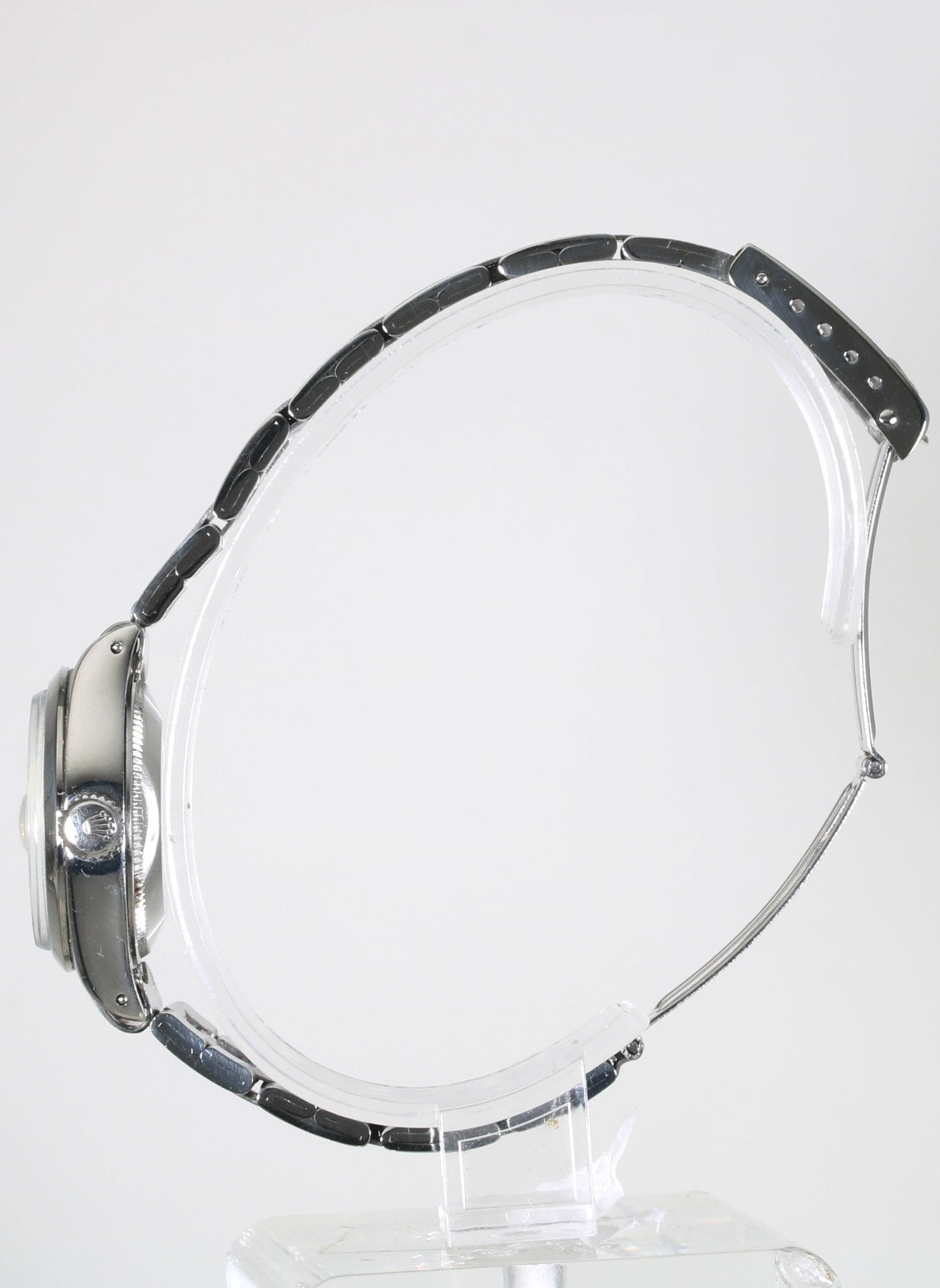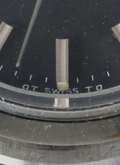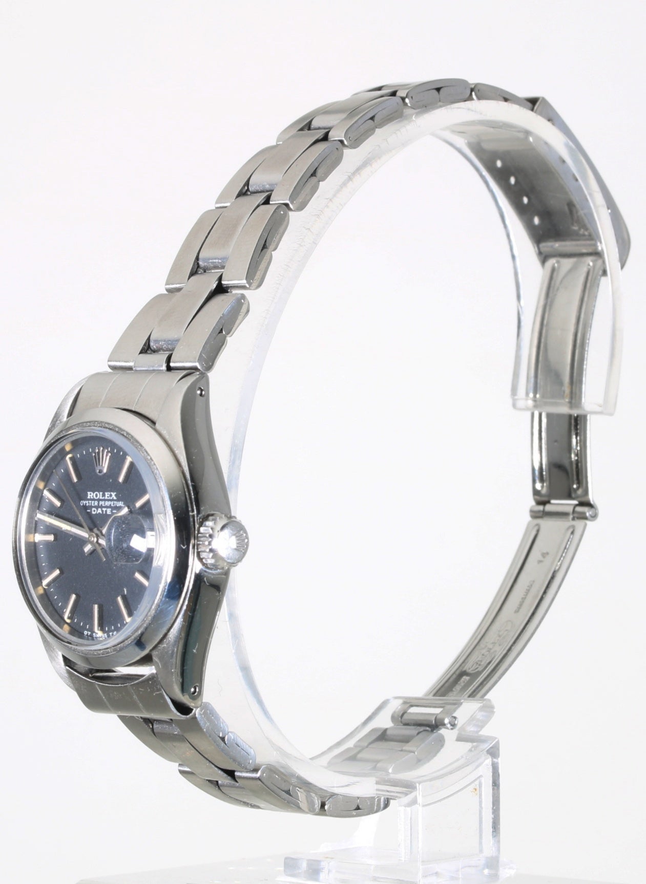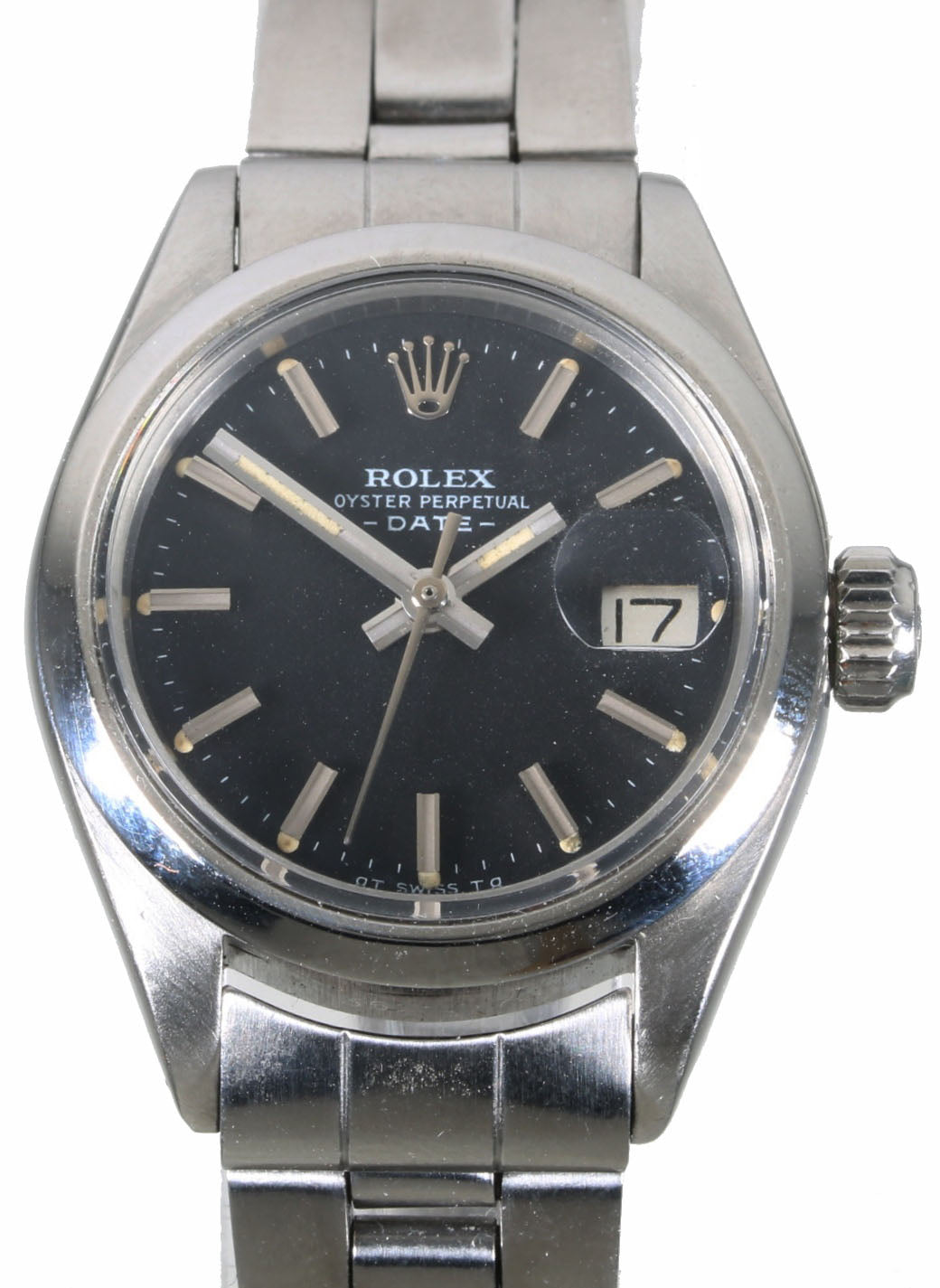Rolex modelo Date referencia 6916 de 1973 con caja de 26mm en acero y cristal de plexiglass. La esfera negra es, como se puede ver en la última foto, un Sigma Dial que nos indica que las manos y marcadores de hora son de oro. Movimiento automático con función de día del mes. Brazalete de acero modelo Oyster. En buen estado.